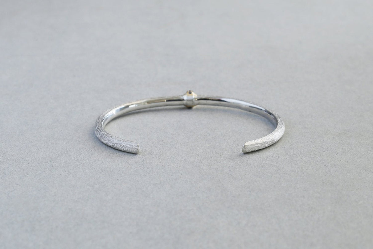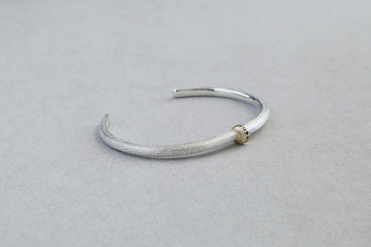 The Coat series is inspired by the organic, intricate textures found on the surface of living organisms. The finely engraved patterns on the surface feature a subtle variation in texture—matte on the recessed areas and semi-gloss on the raised parts—creating a refined and understated expression. The gold sections are finished with a hairline texture that contrasts with the silver parts, and black diamonds, inspired by the facets of a spider's eye, are set to create a bold and striking bangle.