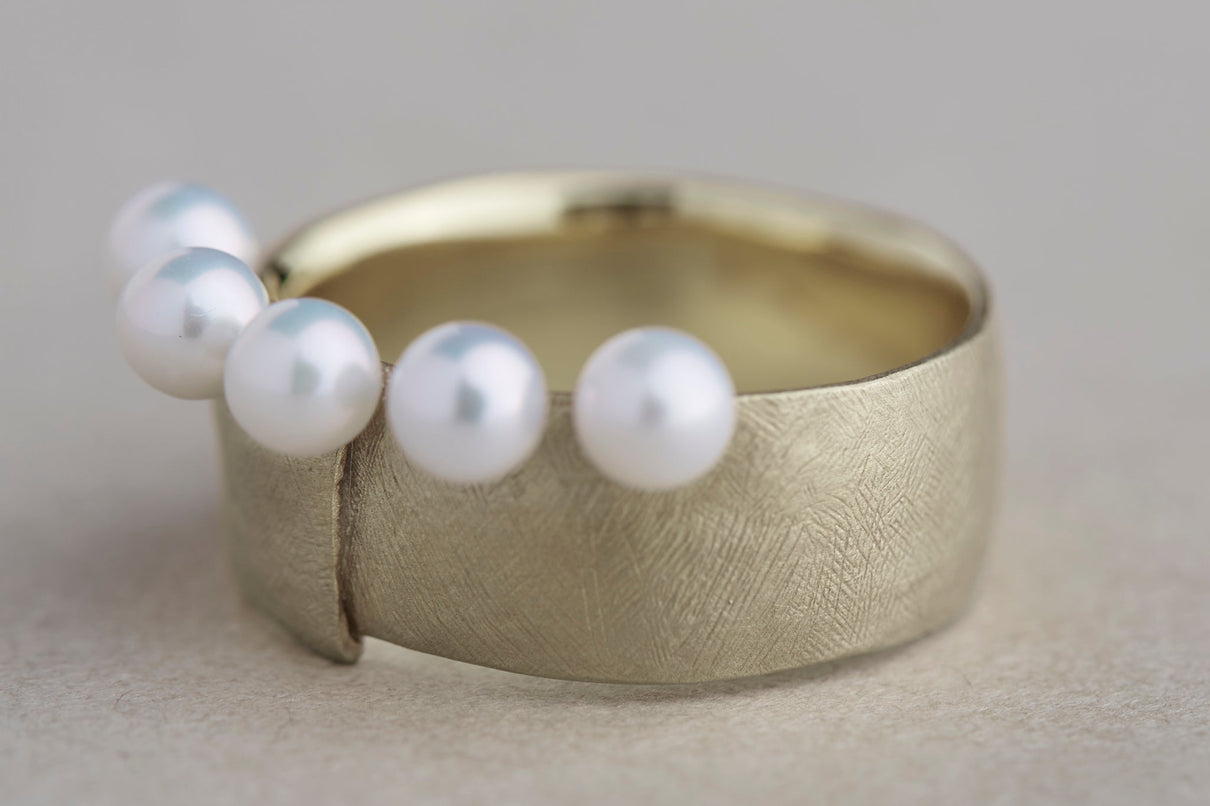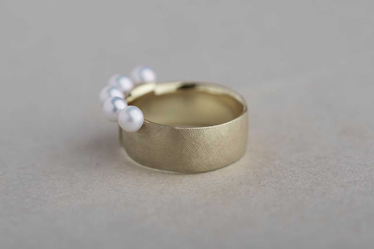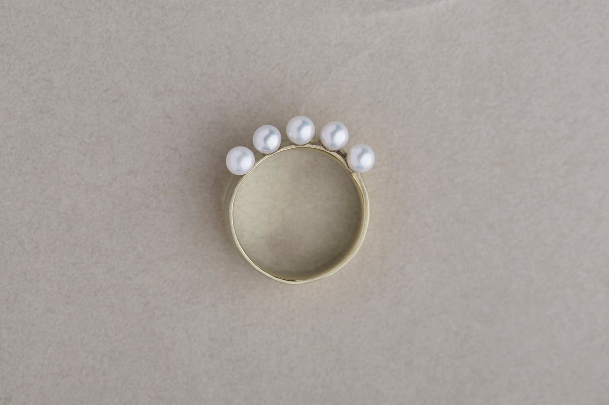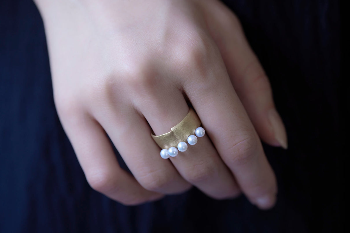 The Snug ring is inspired by the quiet presence of fabric in the landscape, and features five freshwater pearls set in a cascading balance, giving the effect of two stacked rings. The soft form is further enhanced with a warm, matte texture finished with a slightly rough surface. This ring makes a statement on its own and works beautifully as an accent to a simple outfit.