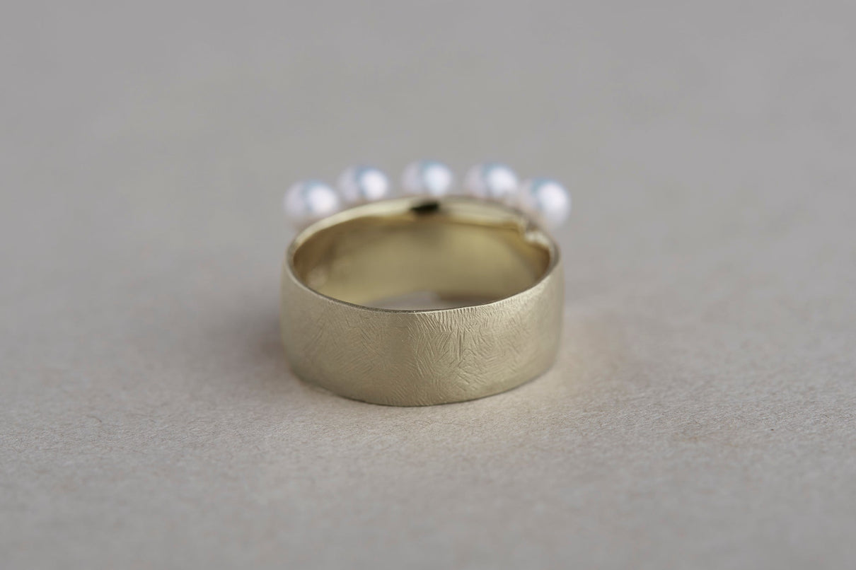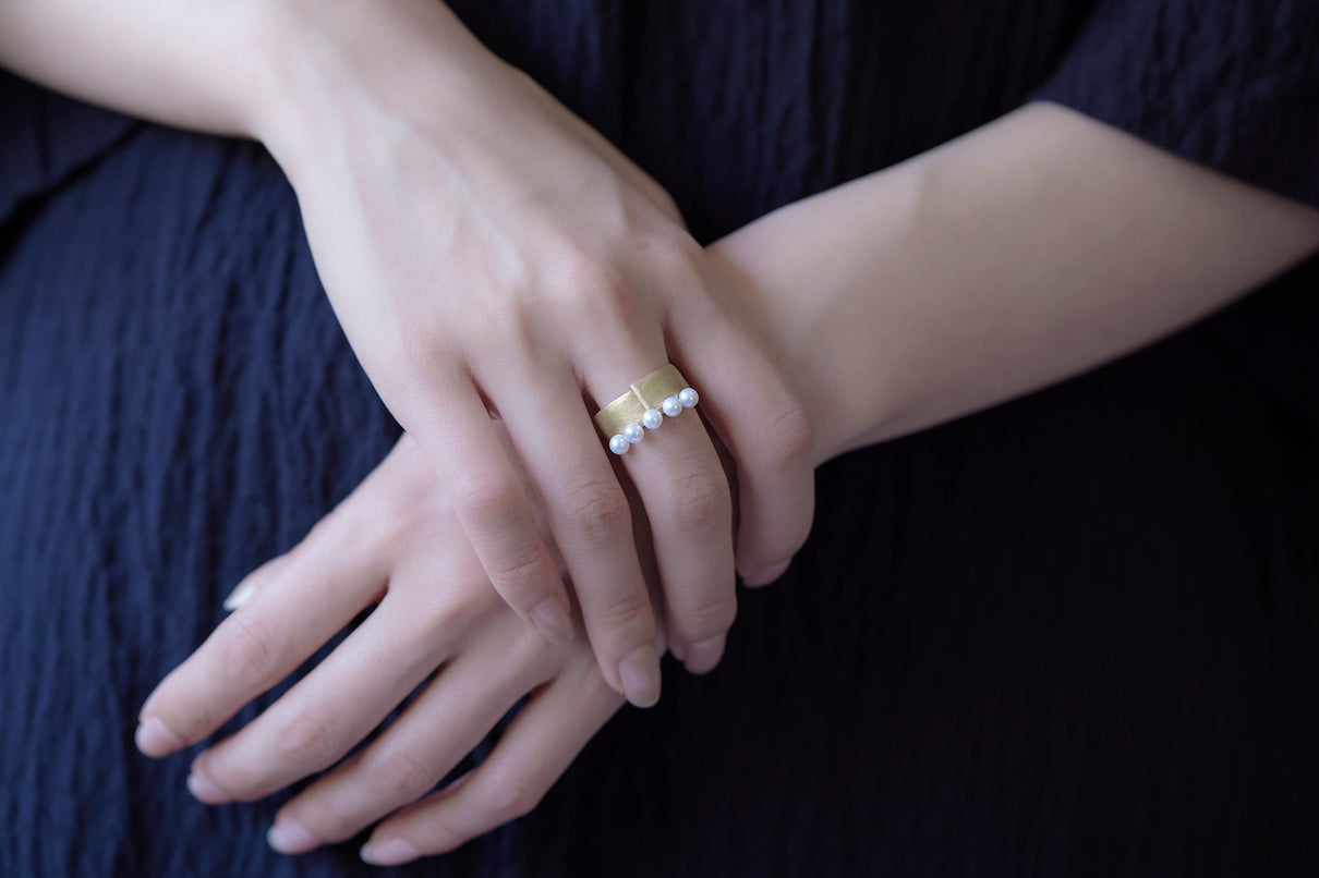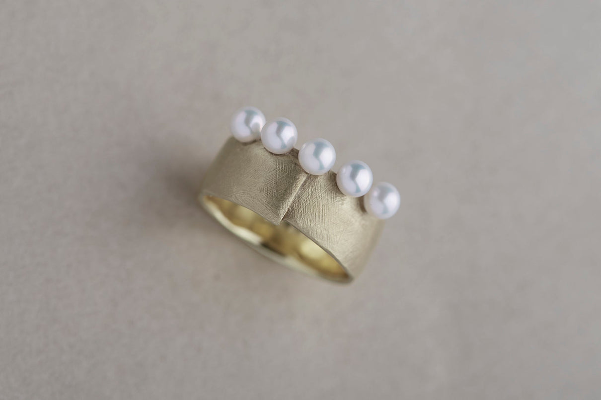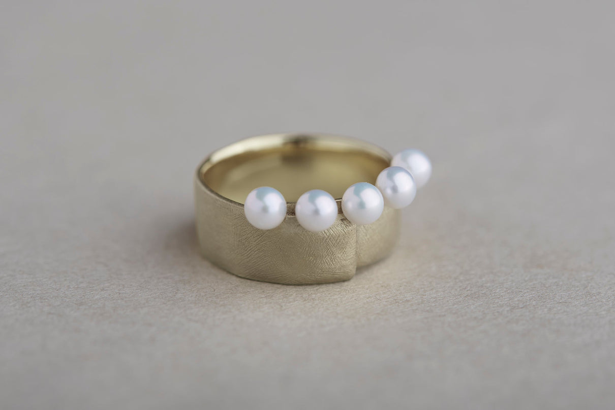 The Snug ring is inspired by the quiet presence of fabric in the landscape, and features five freshwater pearls set in a cascading balance, giving the effect of two stacked rings. The soft form is further enhanced with a warm, matte texture finished with a slightly rough surface. This ring makes a statement on its own and works beautifully as an accent to a simple outfit.
