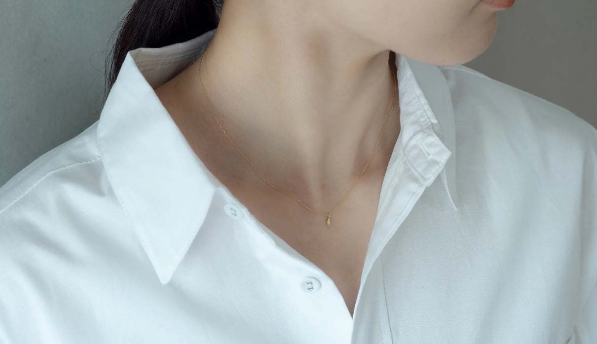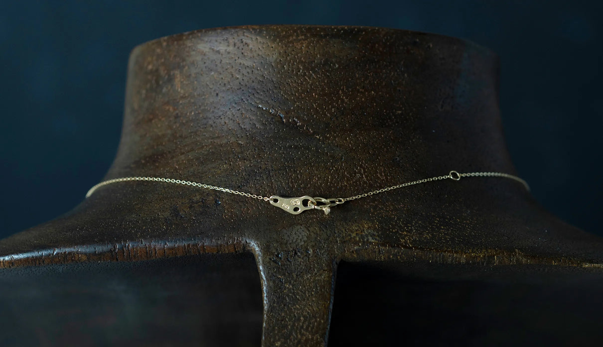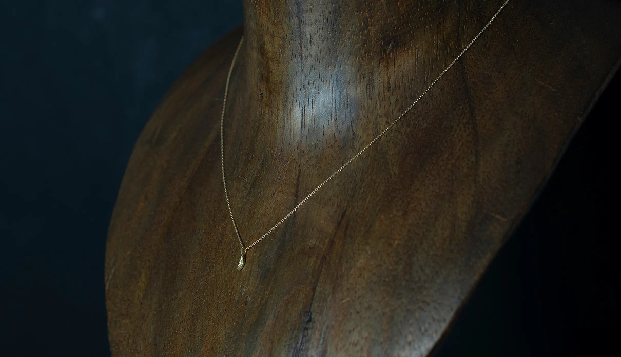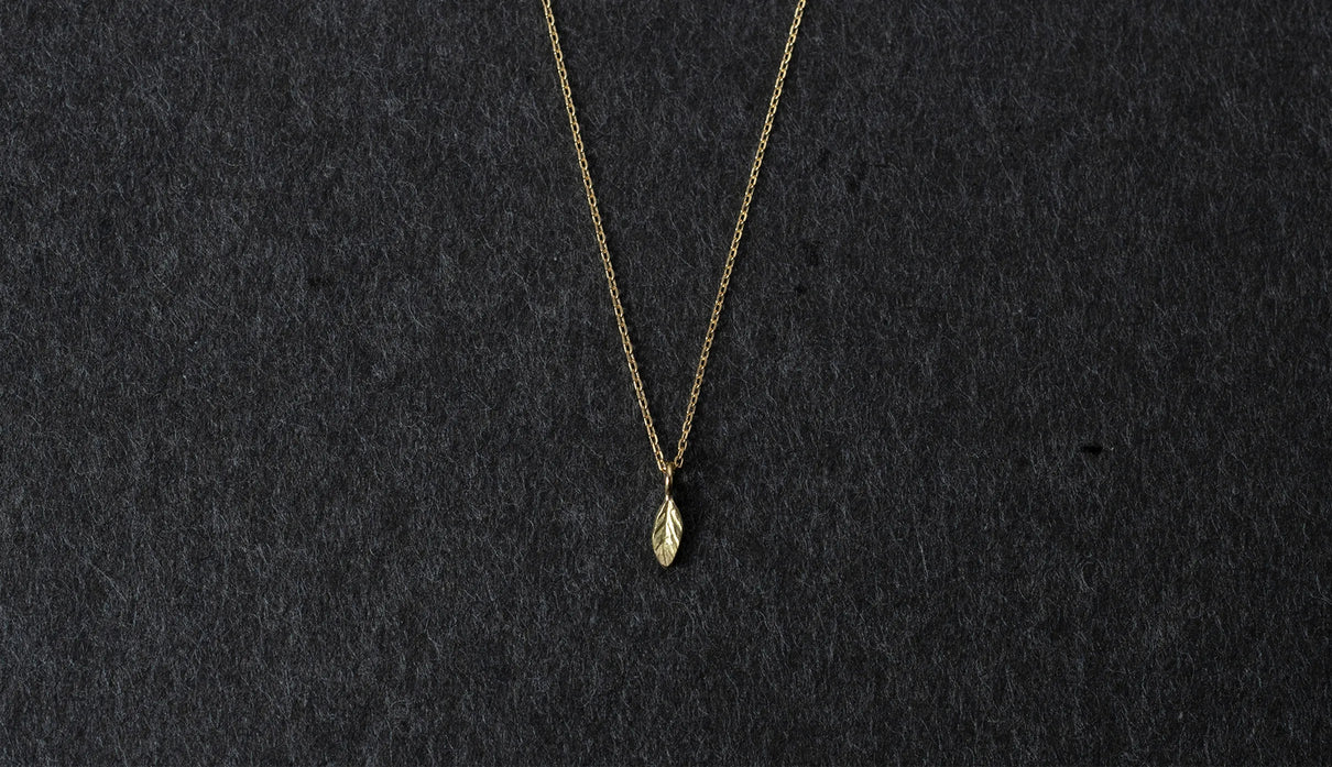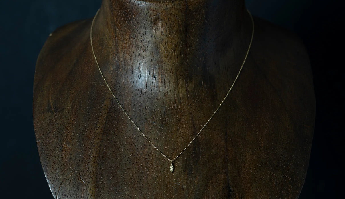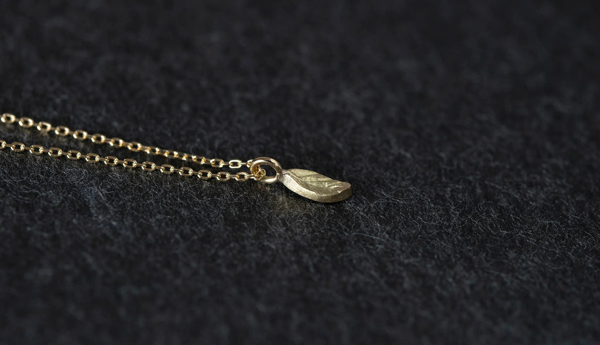 From the "Bloom" collection, inspired by tiny buds awaiting to bloom, this necklace is shaped like a single delicate leaf. In its minuscule form, hand-engraved veins create soft, subtle shadows. The matte-finished yellow gold exudes a gentle luster that softly changes with the light, adding a quiet sparkle to the neckline. The intricate expression within this small piece brings serene depth to everyday outfits, and it pairs beautifully layered with other necklaces.