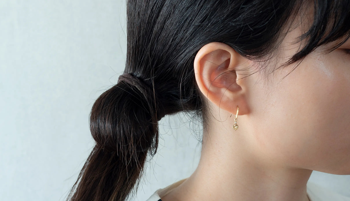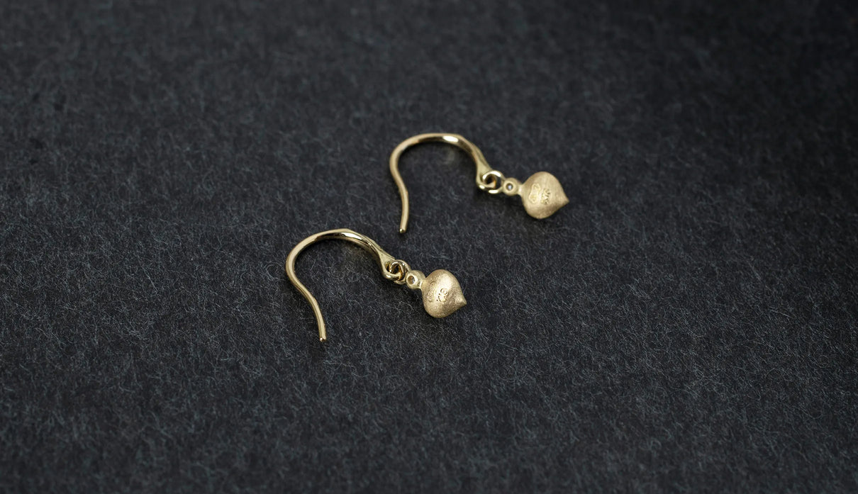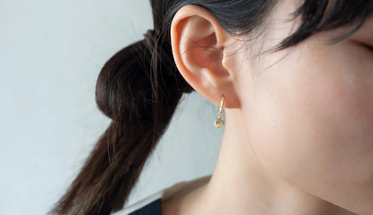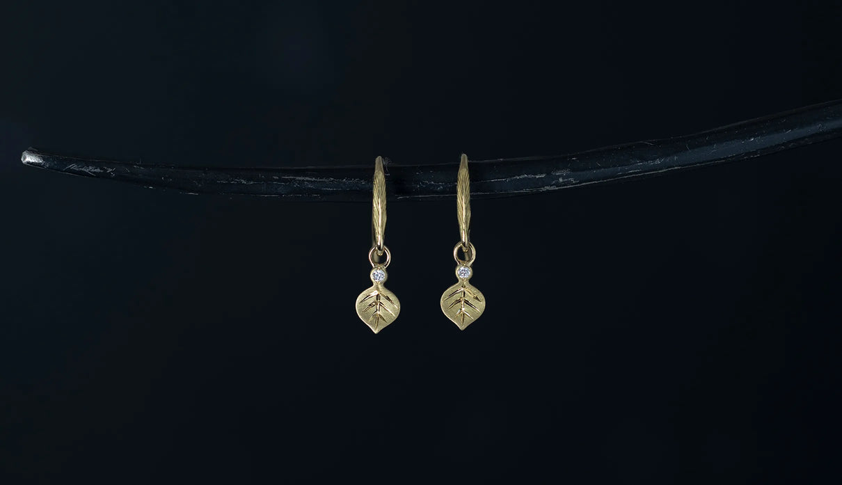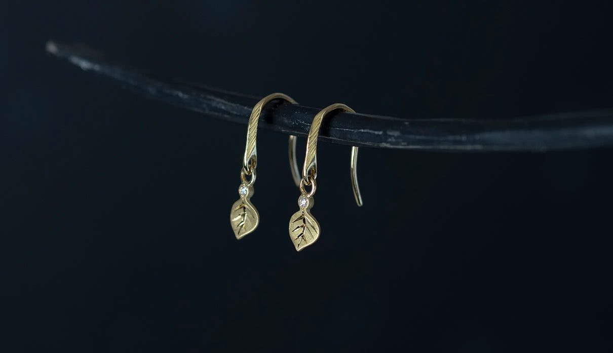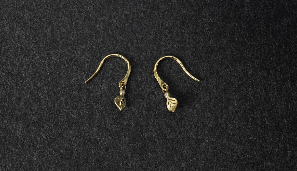 Earrings featuring small gold motifs shaped like leaves, accented with sparkling melee diamonds. The diamonds sway lightly with movement, catching the light to bring delicate shimmer to the ears. Fine vein-like patterns are engraved on the hooks, reflecting the meticulous craftsmanship of the artisans even in the smallest details. A subtle piece that blends naturally into everyday attire, quietly adding a touch of elegance.