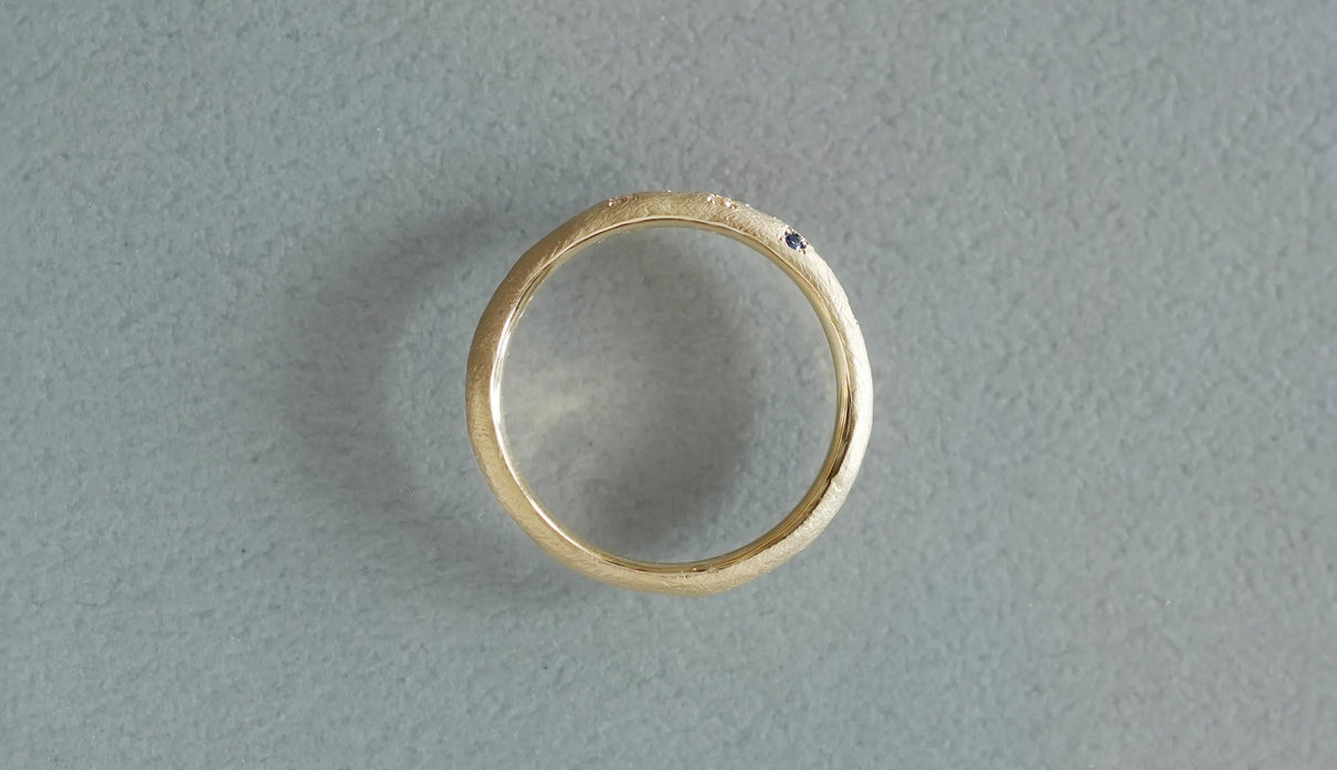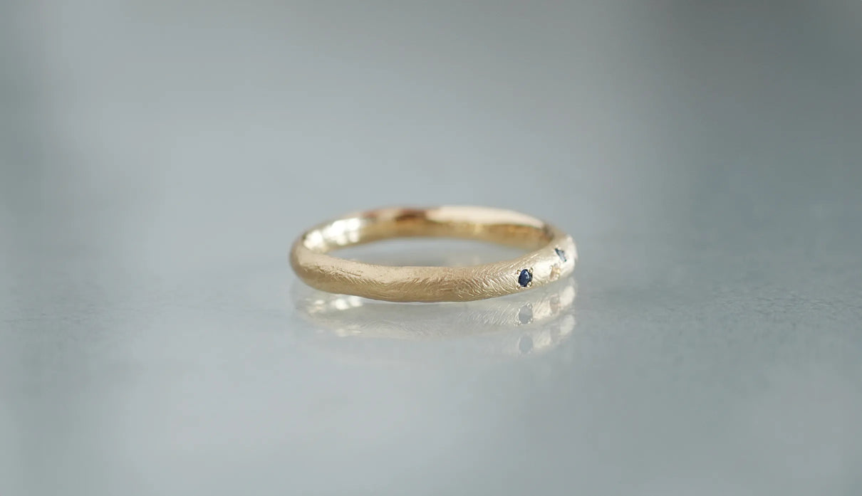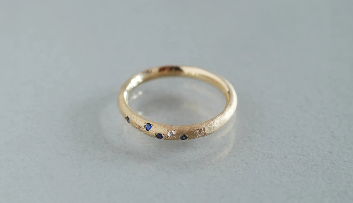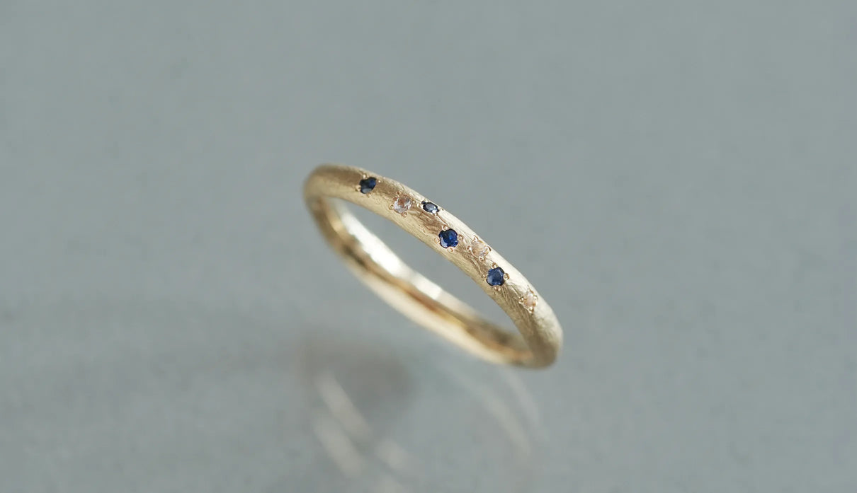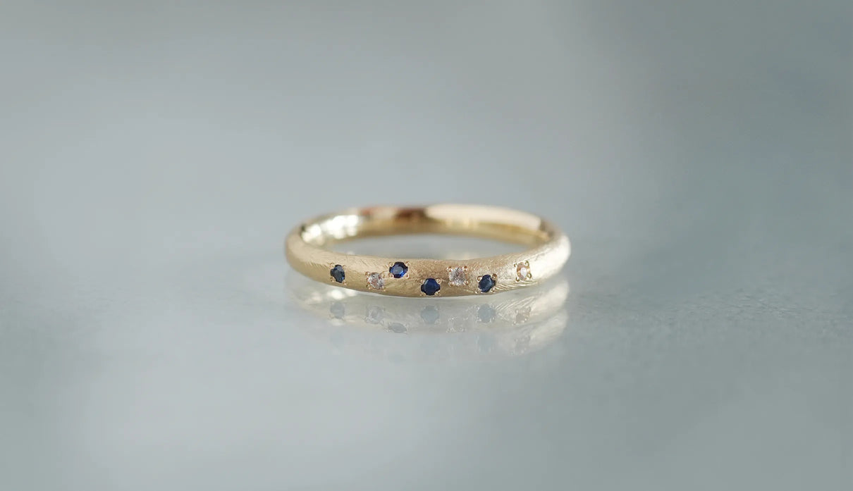 A ring from the "Existence" design, named for concepts of being, life, and living, set with four blue sapphires and three white sapphires in a random arrangement. It embodies a beauty that balances vibrant brilliance with a humble, modest, and grounded charm. The rounded ring base features a matte finish with gentle undulations, highlighting the artisan's handwork. The vivid blue and soft white sapphires add rhythmic depth and elegance to the design. Sapphires, cherished as the birthstone for September, make this ring a perfect gift or a special talisman for those born in that month.