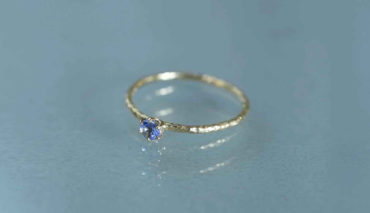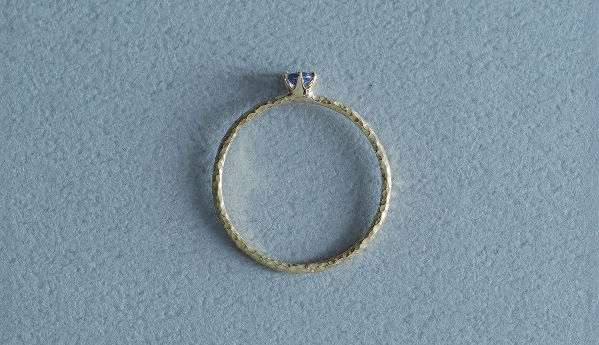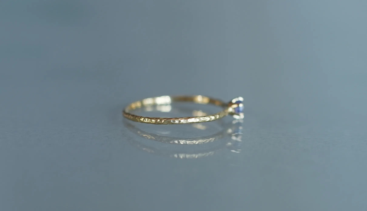 A ring named "Twig," inspired by small branches. Despite its delicate width of approximately 1mm, the fine, bark-like texture with subtle unevenness catches the light, and at its center sits a small tanzanite with a deep, mysterious glow. An ideal piece to wear as a pinky ring or stacked with other rings.