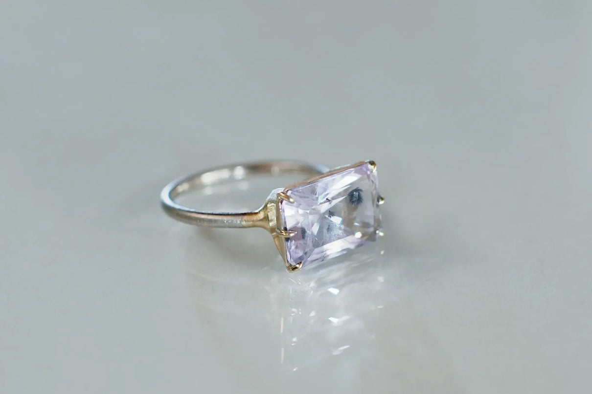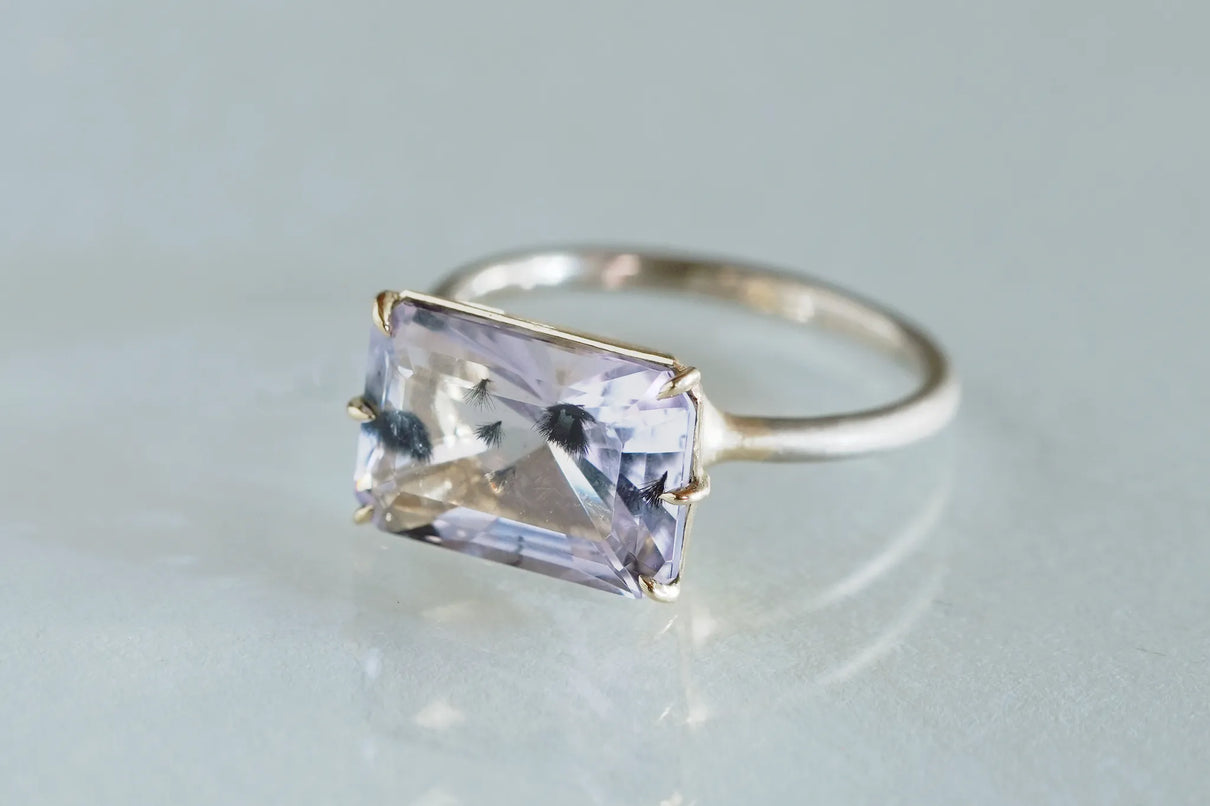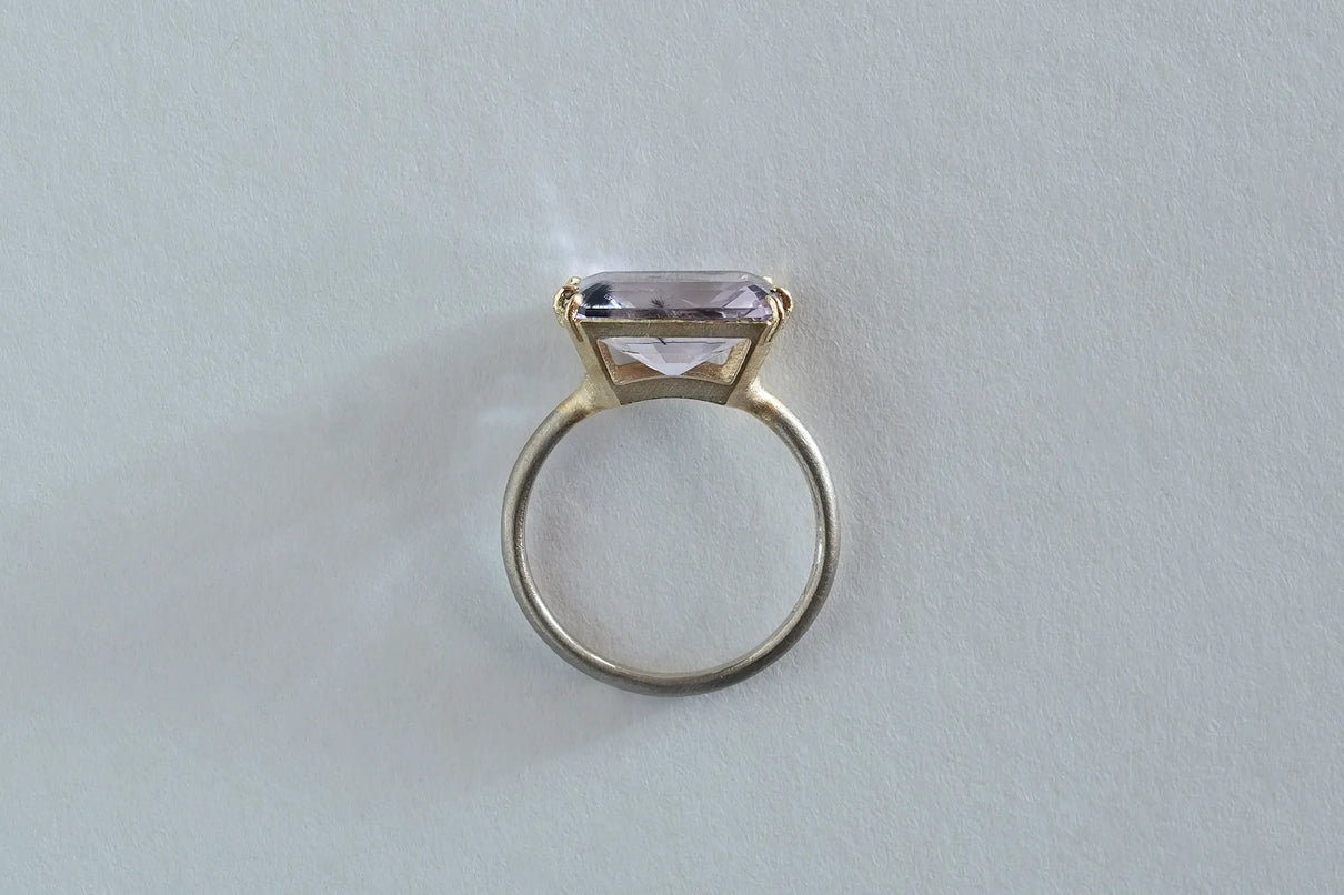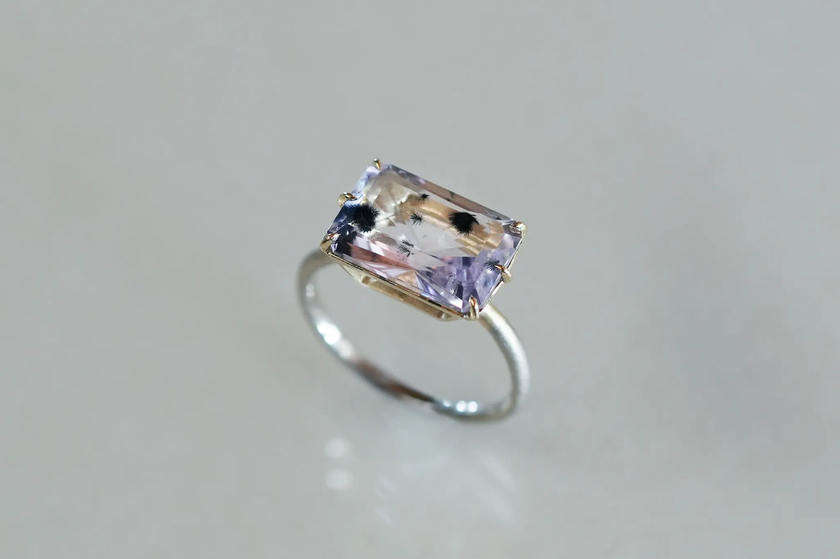 Within the gem, Romanechite inclusions of varying sizes float at a perfectly balanced distance, while three small, neatly aligned crystals appear in a separate layer, adding a subtle charm that enhances its singular character. The meticulous craftsmanship extends to the ring's design, where the K18 yellow gold setting seamlessly transitions into a K18 white gold band with a smooth, subtle gradient—an exquisite detail that may not be immediately noticeable but adds to its allure. Amethyst, cherished as the birthstone of February, makes this an ideal and meaningful talisman for those born in this month.
