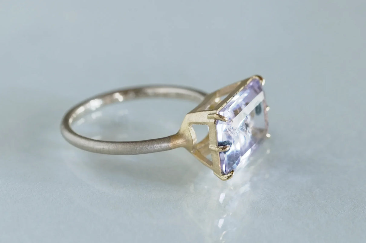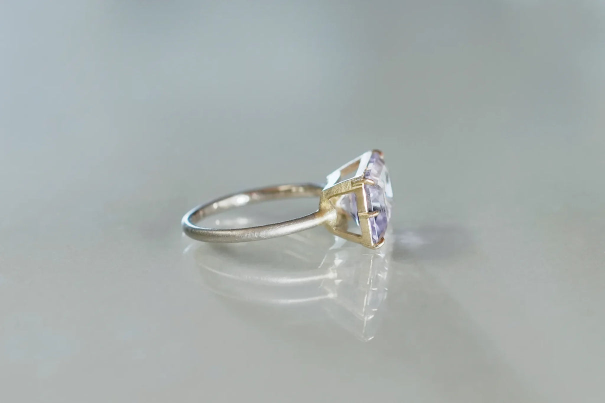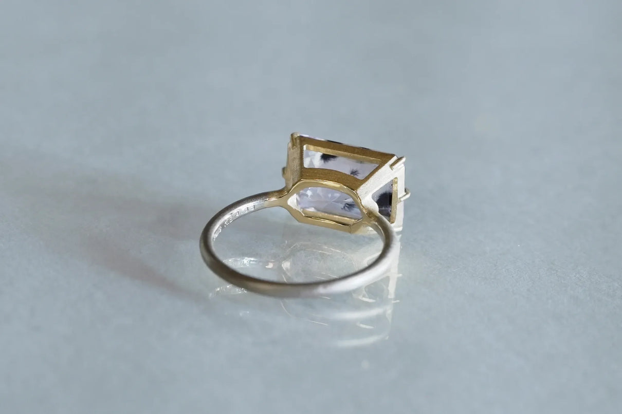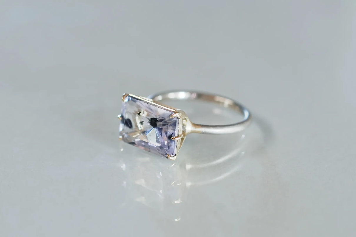 Within the gem, Romanechite inclusions of varying sizes float at a perfectly balanced distance, while three small, neatly aligned crystals appear in a separate layer, adding a subtle charm that enhances its singular character. The meticulous craftsmanship extends to the ring's design, where the K18 yellow gold setting seamlessly transitions into a K18 white gold band with a smooth, subtle gradient—an exquisite detail that may not be immediately noticeable but adds to its allure. Amethyst, cherished as the birthstone of February, makes this an ideal and meaningful talisman for those born in this month.