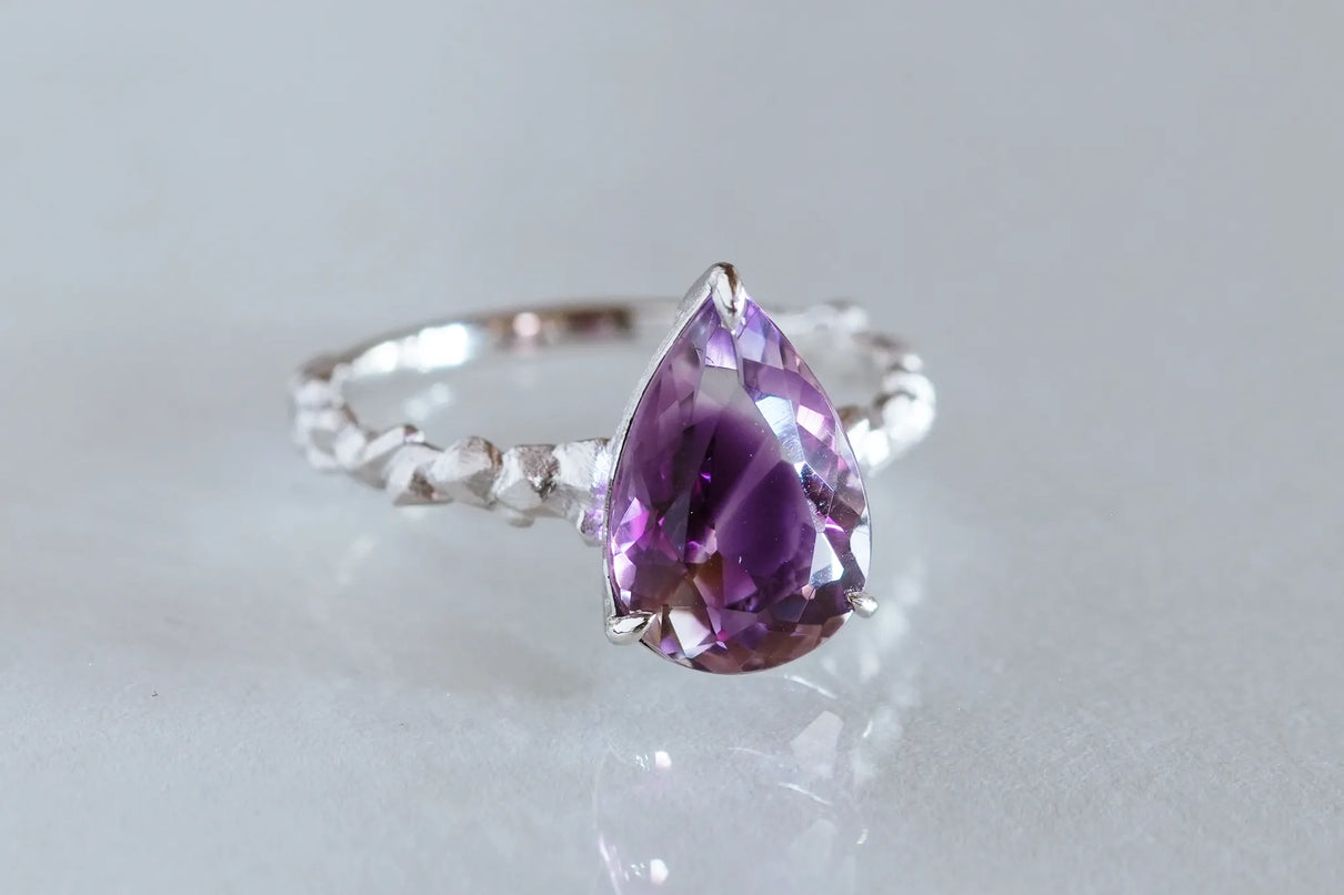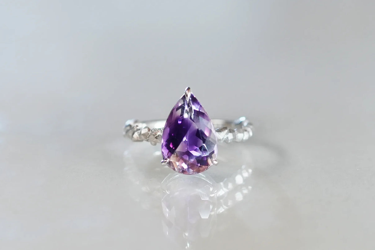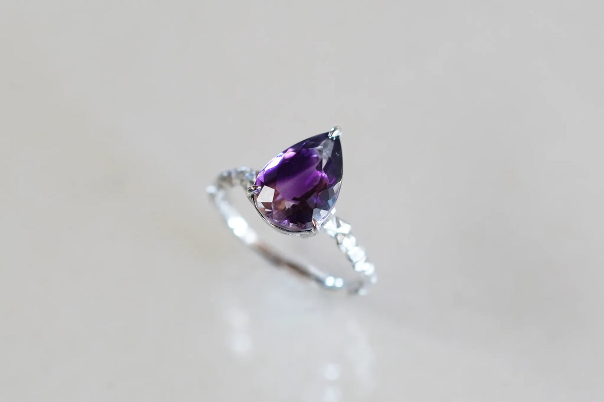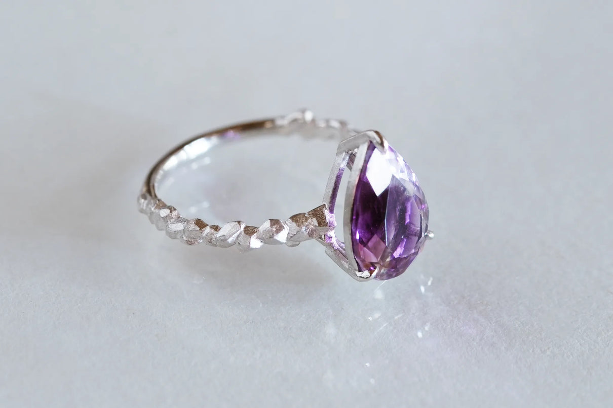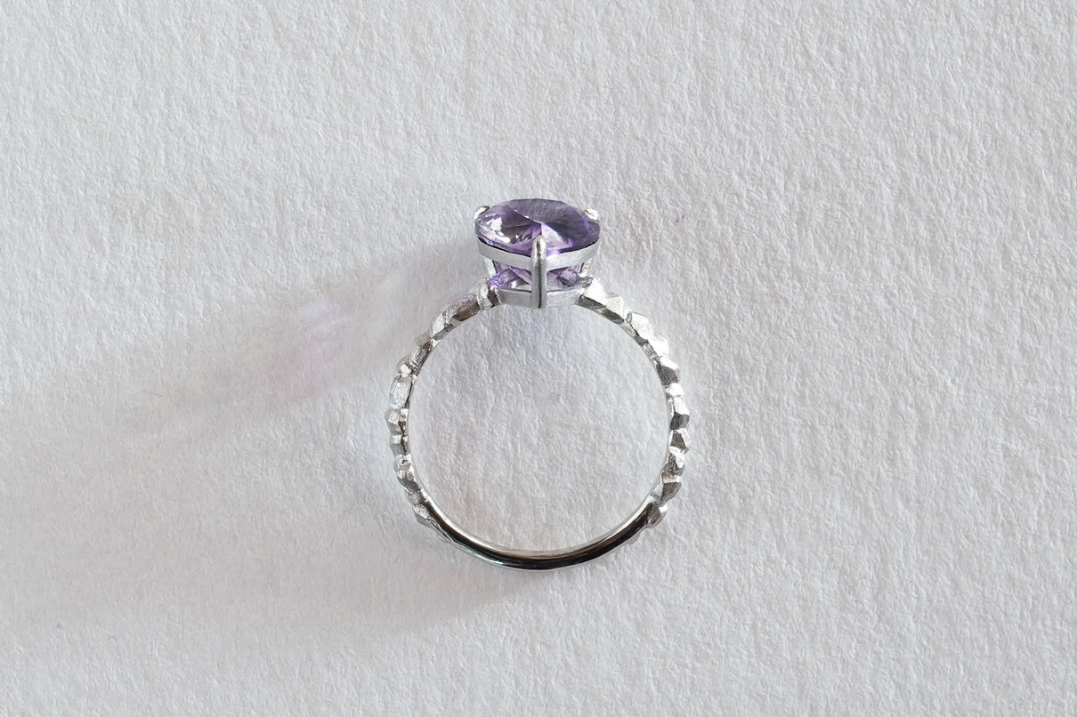 The "Whisper" series is inspired by the quiet activities of small creatures hidden deep within the forest. This one-of-a-kind ring features a drop-cut amethyst with a bicolor hue, where colorless transparency and purple gently blend together. The varying shades of light create an enchanting glow from different angles, leaving a lasting impression on the finger.
