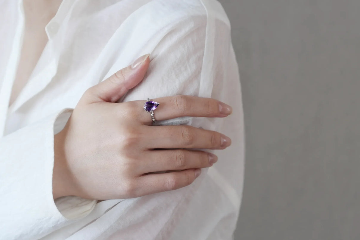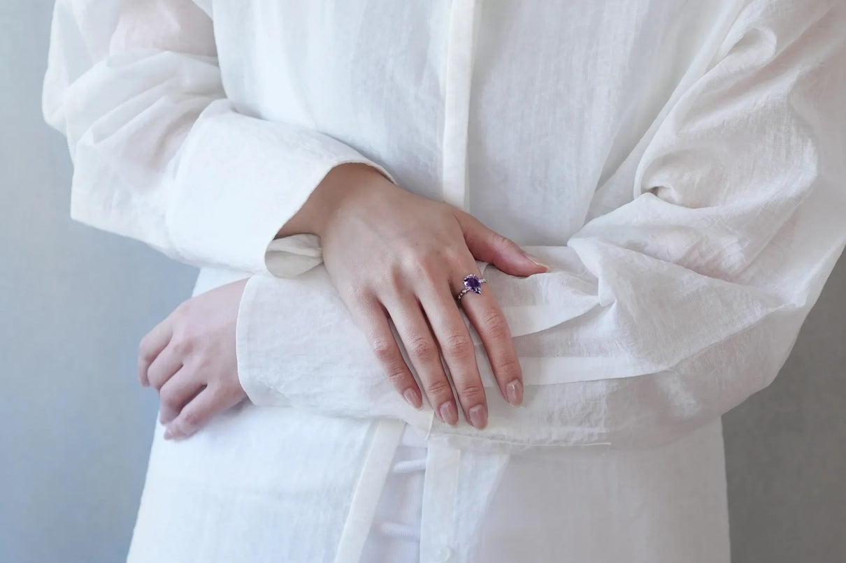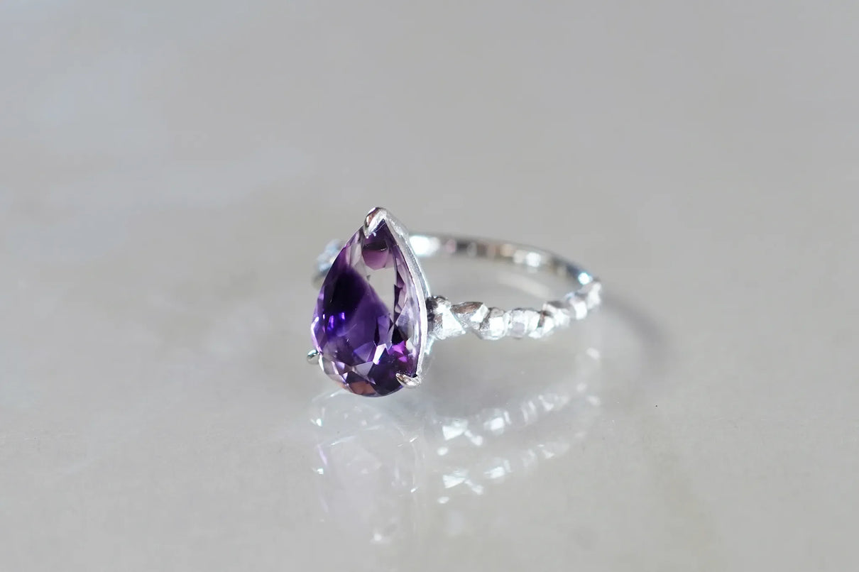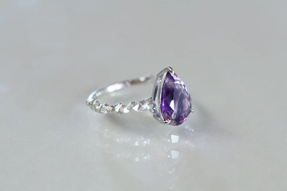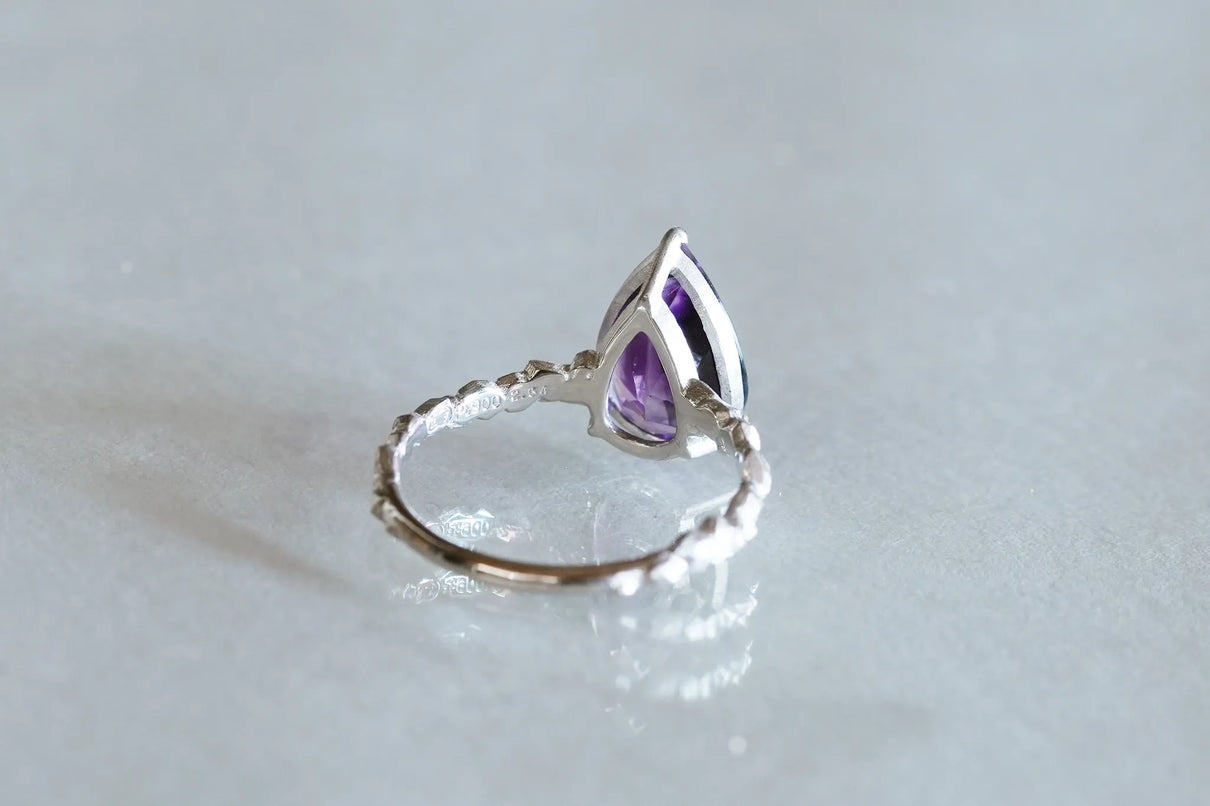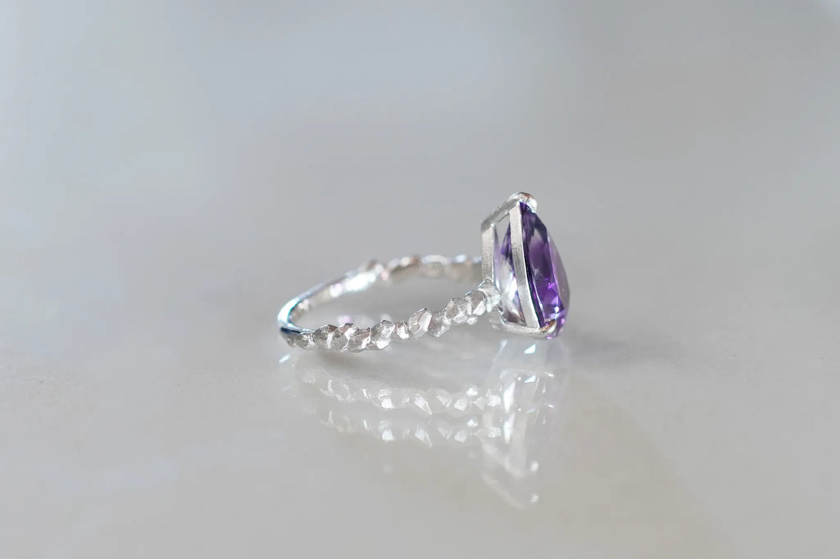The "Whisper" series is inspired by the quiet activities of small creatures hidden deep within the forest. This one-of-a-kind ring features a drop-cut amethyst with a bicolor hue, where colorless transparency and purple gently blend together. The varying shades of light create an enchanting glow from different angles, leaving a lasting impression on the finger.