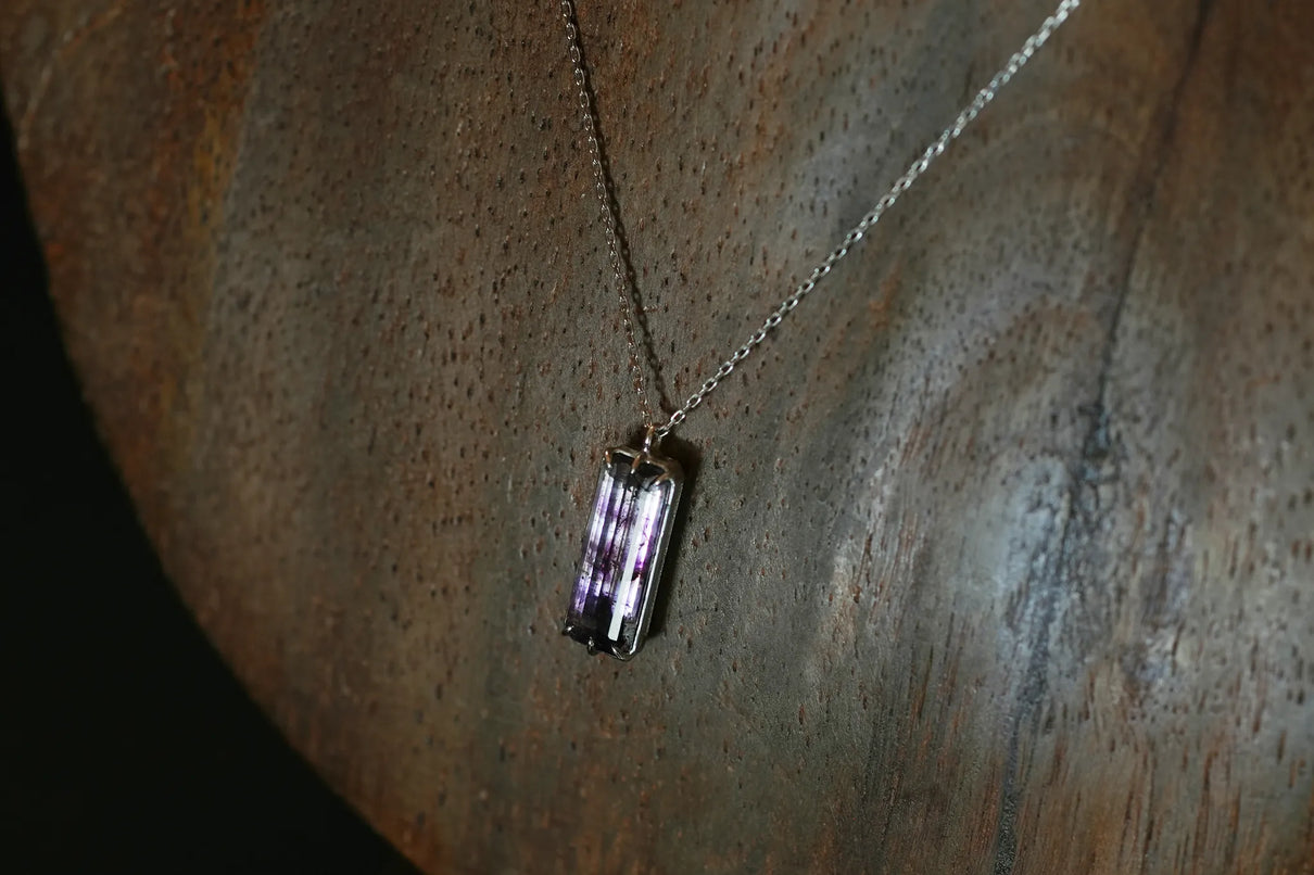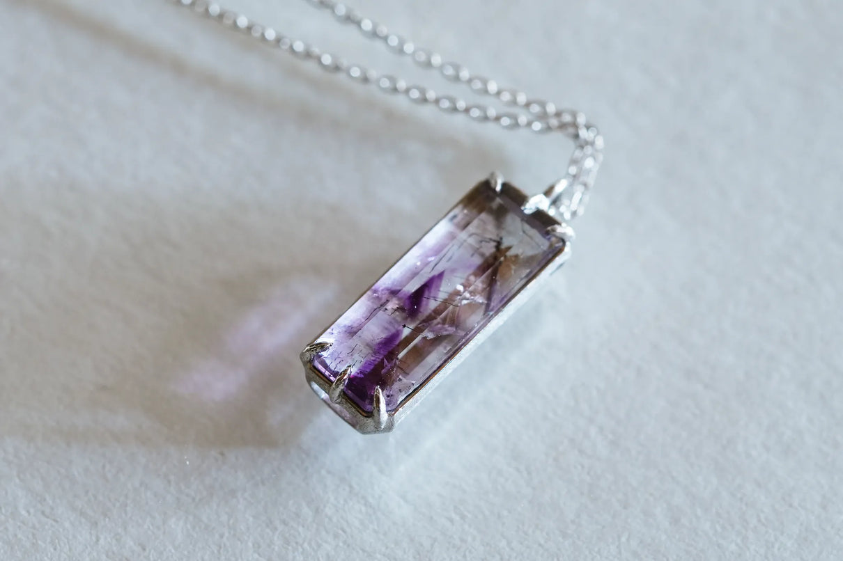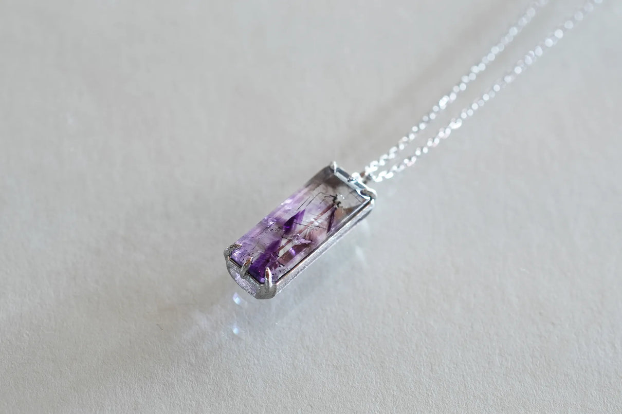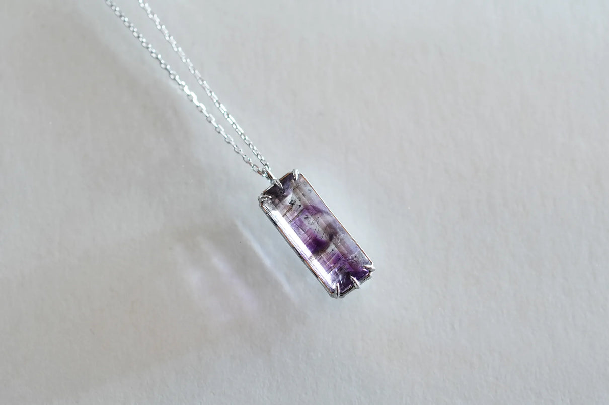 This one-of-a-kind necklace features an amethyst with a sleek, elongated square shape, within which Gaïsite inclusions in both needle and granular forms are beautifully balanced. The highly transparent, colorless crystal is gently accented with a soft purple hue, adding a refined touch to the neckline. The platinum setting and chain, designed to complement the elongated shape of the amethyst, create a calm and elegant impression. Amethyst, cherished as the birthstone of February, makes this piece an ideal, meaningful talisman for those born in this month, and a perfect gift for someone special.