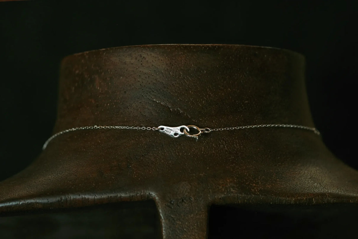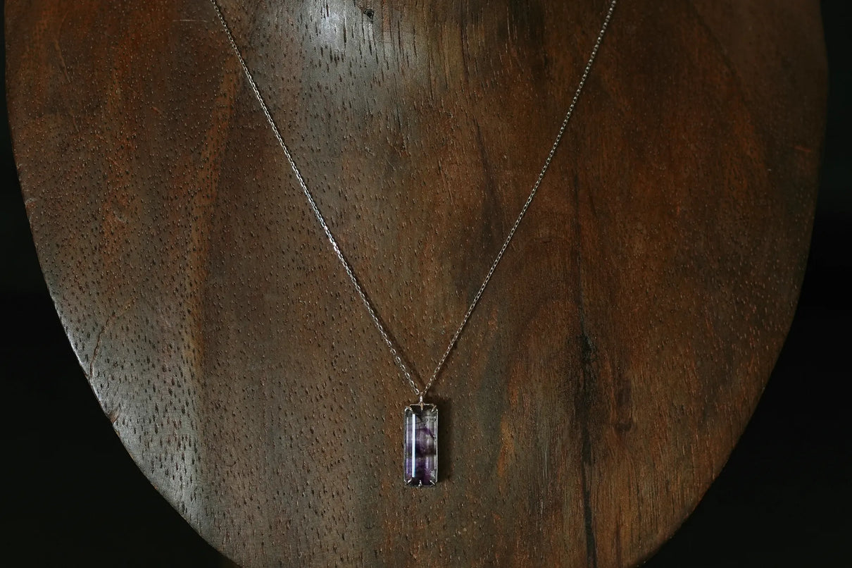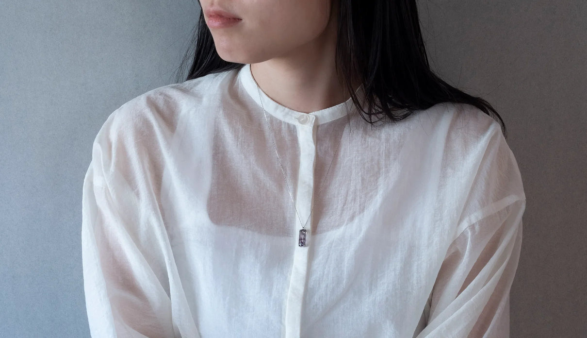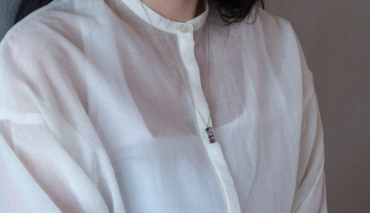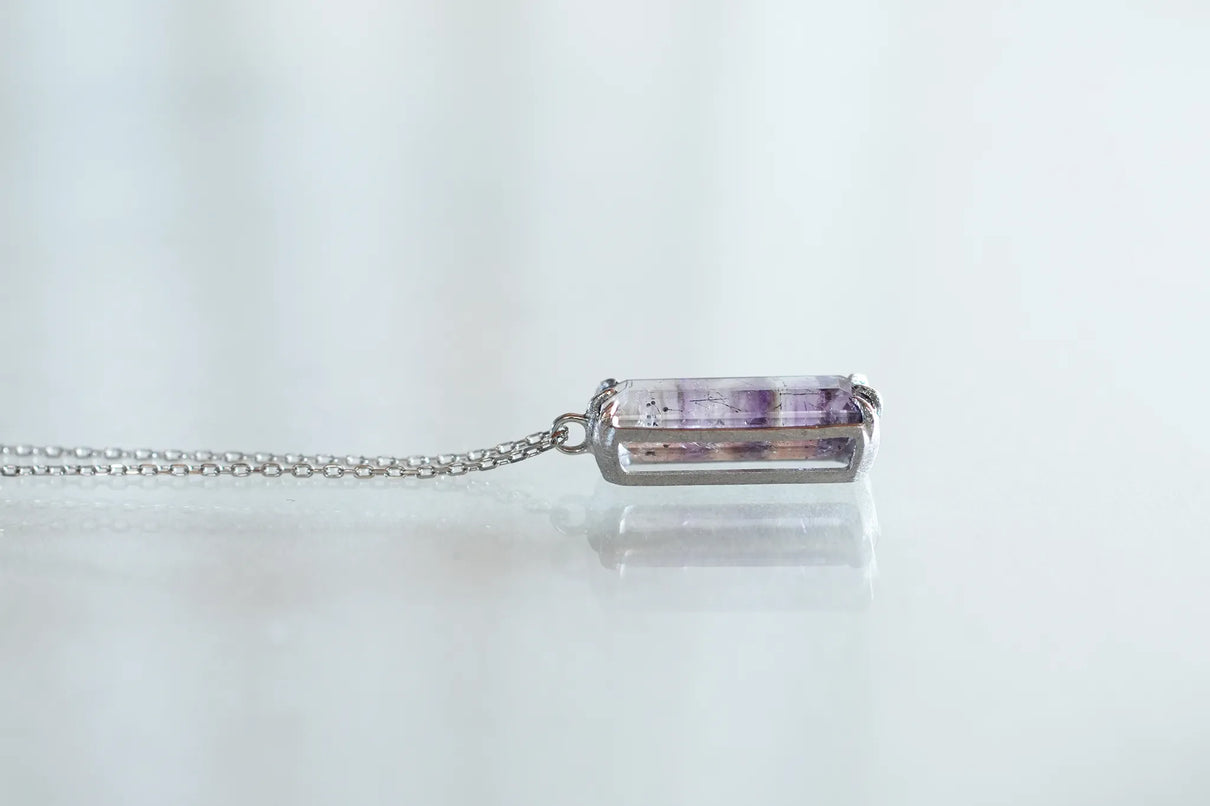 This one-of-a-kind necklace features an amethyst with a sleek, elongated square shape, within which Gaïsite inclusions in both needle and granular forms are beautifully balanced. The highly transparent, colorless crystal is gently accented with a soft purple hue, adding a refined touch to the neckline. The platinum setting and chain, designed to complement the elongated shape of the amethyst, create a calm and elegant impression. Amethyst, cherished as the birthstone of February, makes this piece an ideal, meaningful talisman for those born in this month, and a perfect gift for someone special.