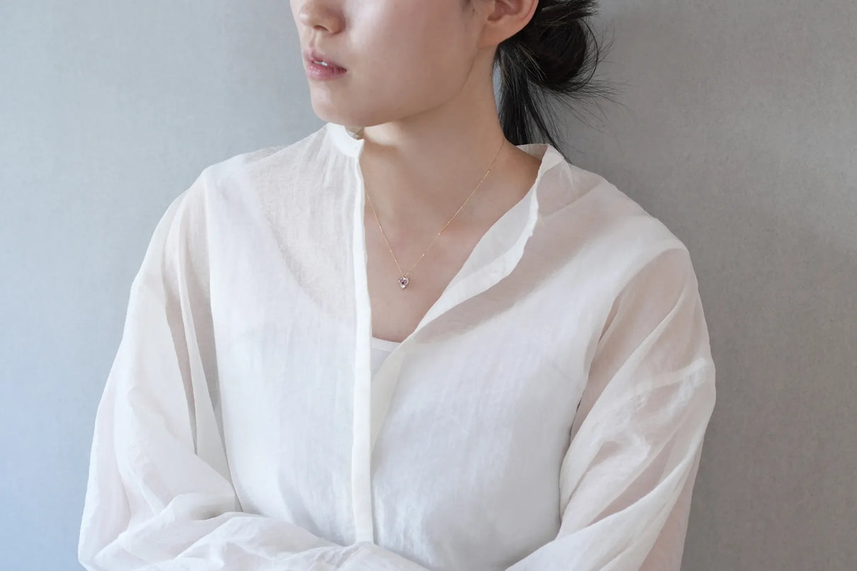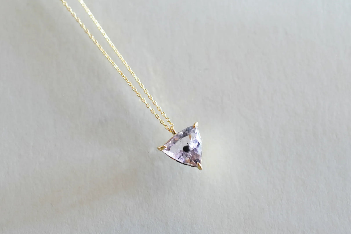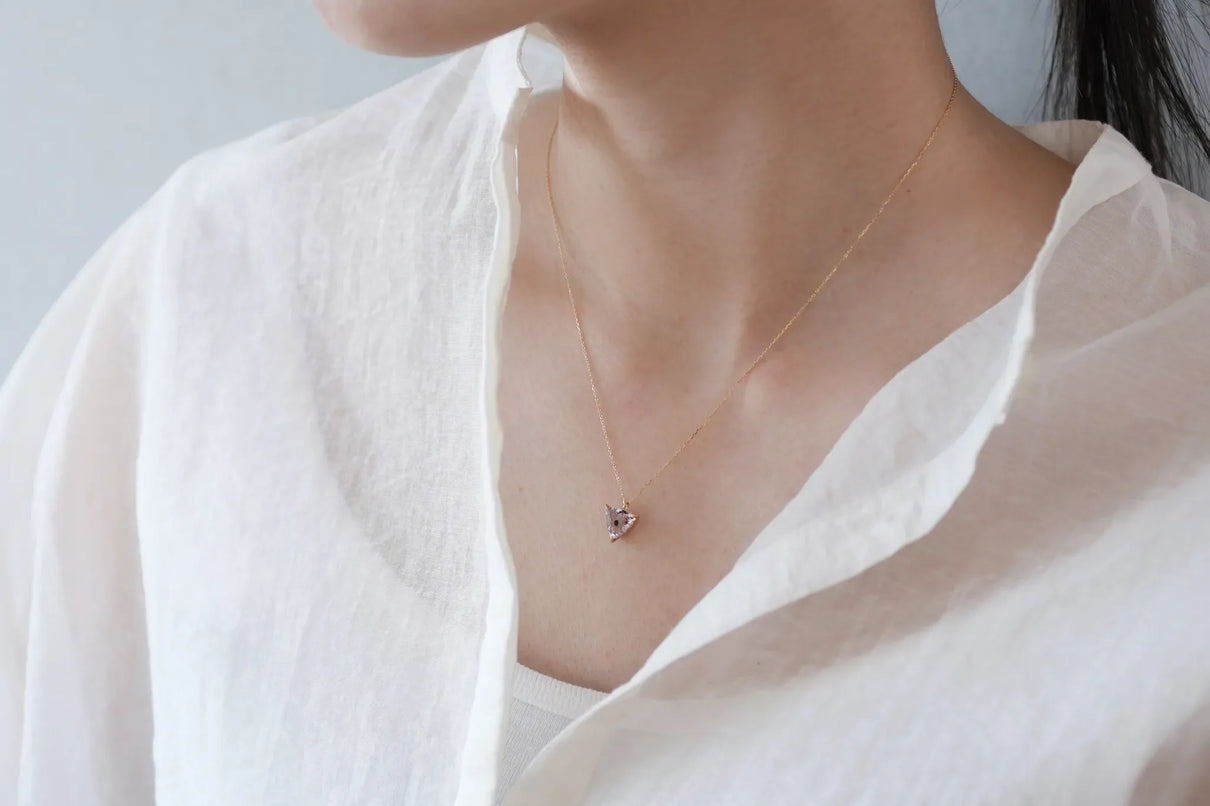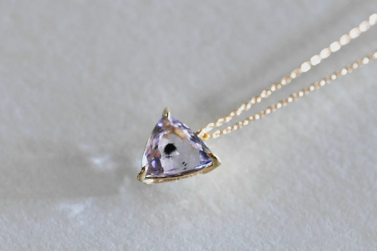 This one-of-a-kind necklace is crafted with the unique and rare Romanechite-in-Amethyst. The black, metallic-luster mineral known as Romanechite gently floats at the center, featured in a sharp design with the triangular apex facing downward. The piece, displaying a faint purple hue, is highly transparent and sparkles delicately with the fine facets, offering a captivating shimmer at the neckline. Amethyst, cherished as the birthstone of February, makes this piece an ideal, meaningful talisman for those born in this month, and a perfect gift for someone special.