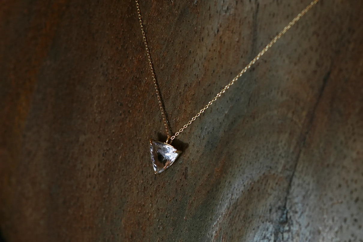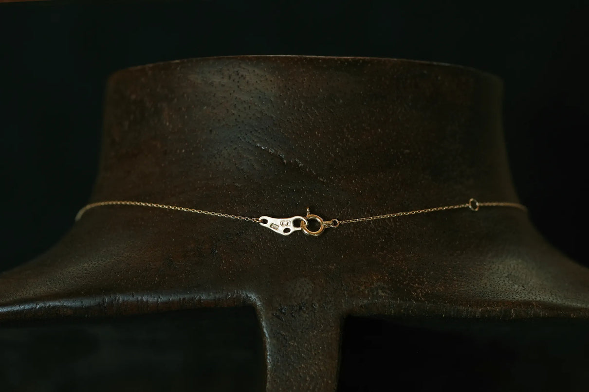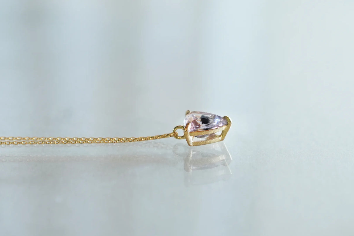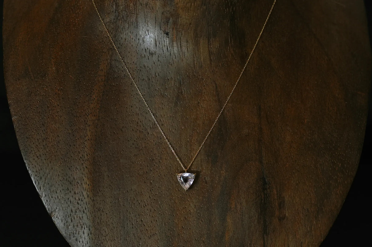 This one-of-a-kind necklace is crafted with the unique and rare Romanechite-in-Amethyst. The black, metallic-luster mineral known as Romanechite gently floats at the center, featured in a sharp design with the triangular apex facing downward. The piece, displaying a faint purple hue, is highly transparent and sparkles delicately with the fine facets, offering a captivating shimmer at the neckline. Amethyst, cherished as the birthstone of February, makes this piece an ideal, meaningful talisman for those born in this month, and a perfect gift for someone special.