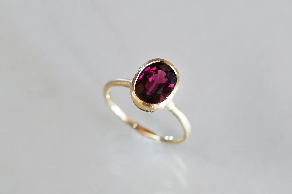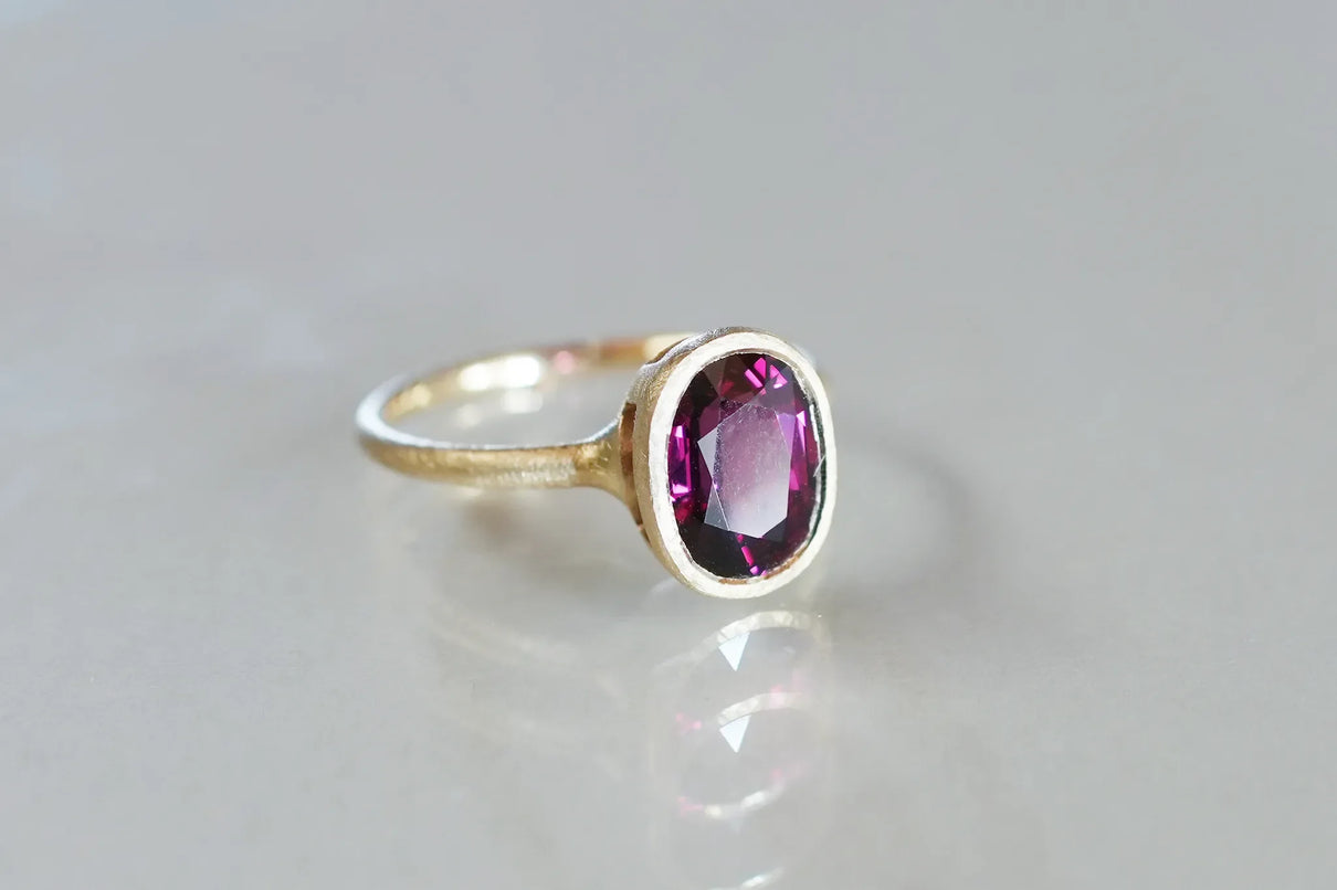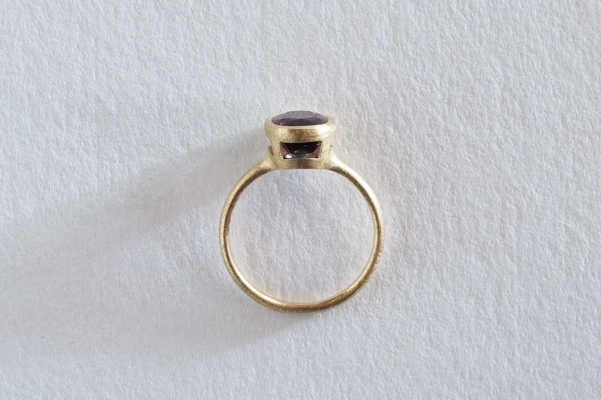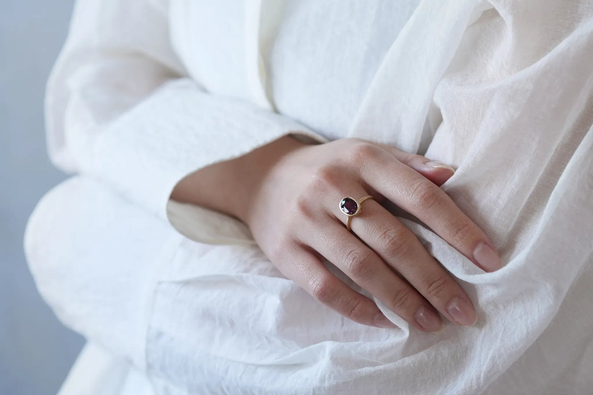 This one-of-a-kind ring is crafted with a beautiful rhodolite garnet, featuring an enchanting blend of red and purple hues. The piece, with its deep and vibrant color resembling fresh grapes, makes a striking statement at the finger. The matte-finished K18 yellow gold setting securely encircles the garnet, bringing a sense of calm and elegance to the design.