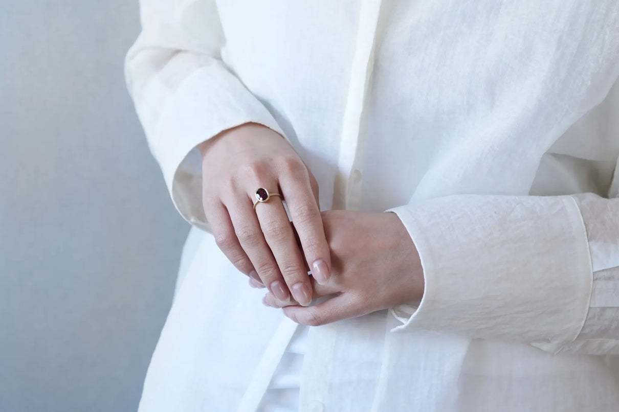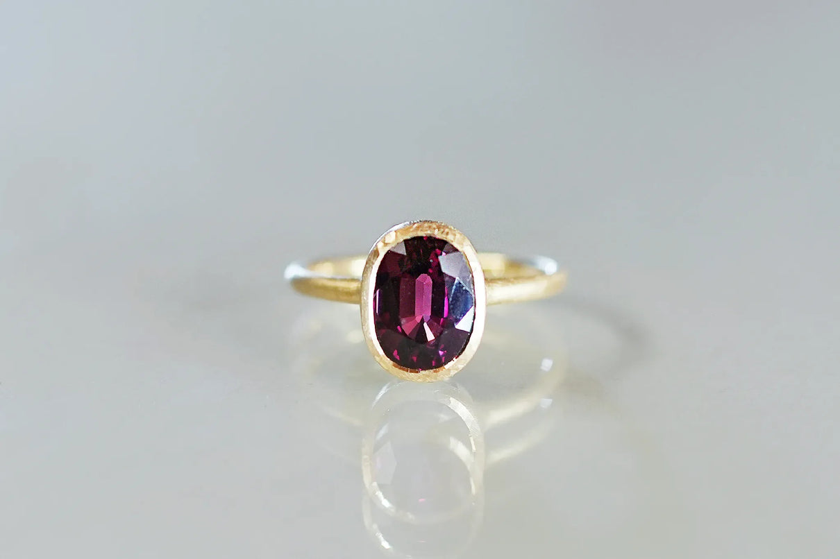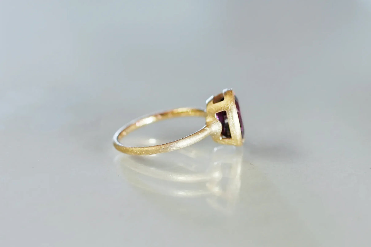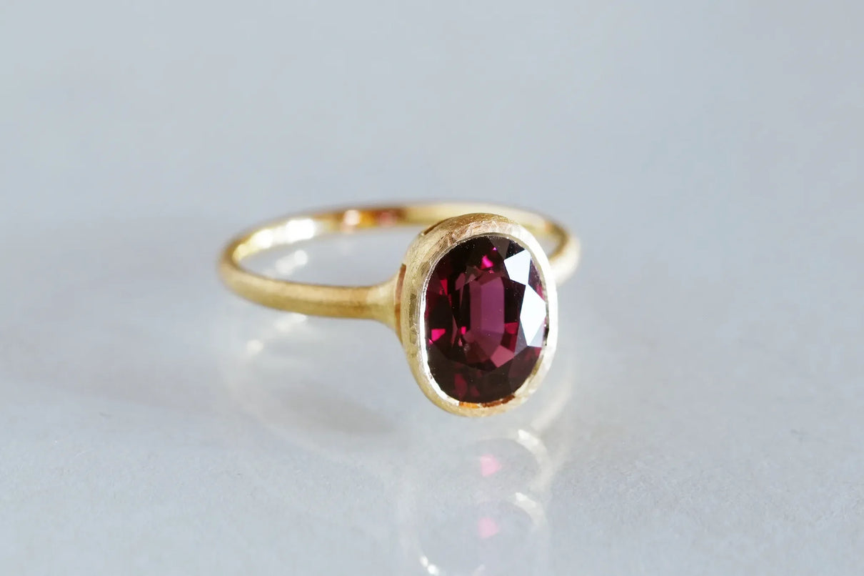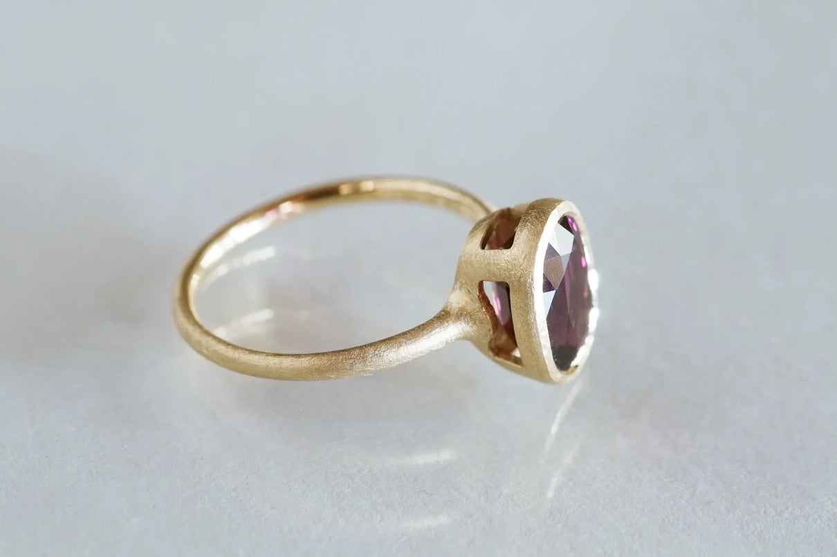 This one-of-a-kind ring is crafted with a beautiful rhodolite garnet, featuring an enchanting blend of red and purple hues. The piece, with its deep and vibrant color resembling fresh grapes, makes a striking statement at the finger. The matte-finished K18 yellow gold setting securely encircles the garnet, bringing a sense of calm and elegance to the design.