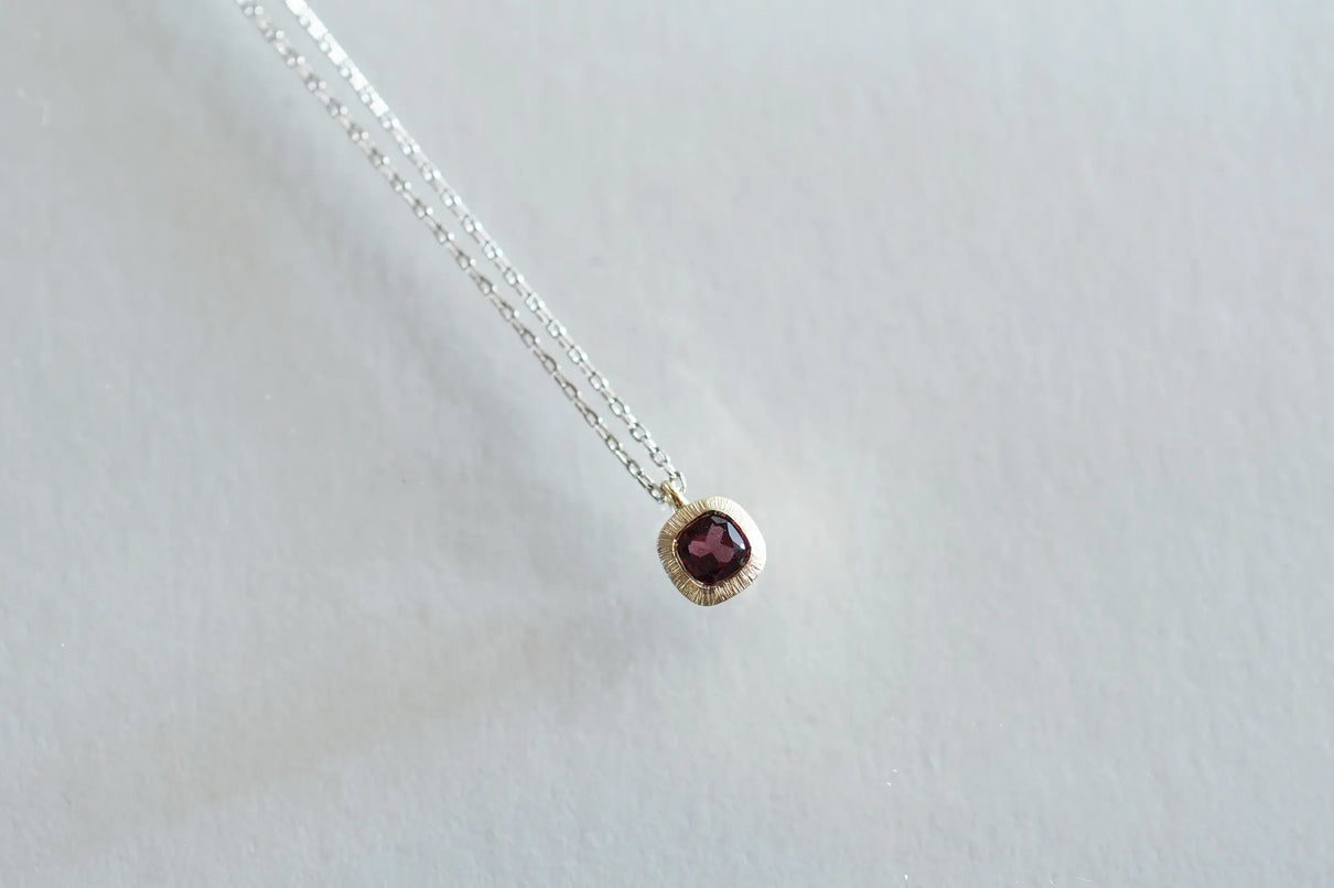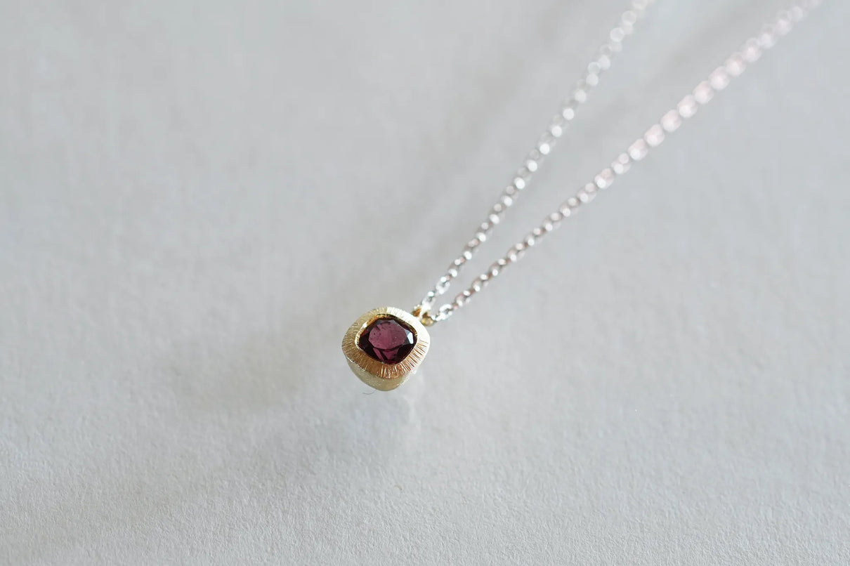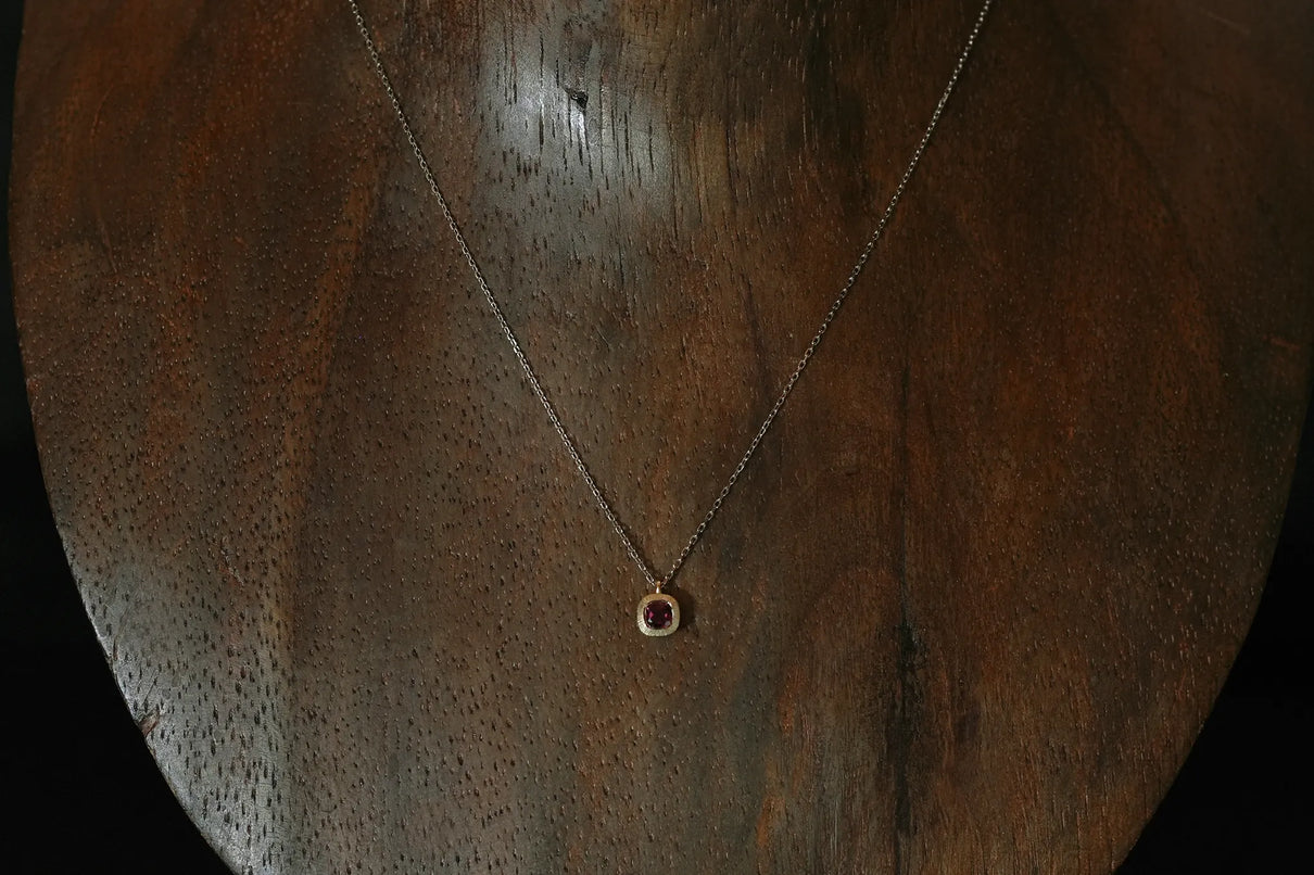 This one-of-a-kind necklace is crafted with a beautiful rhodolite garnet, featuring a captivating blend of red and purple hues. The gentle square form of the garnet, with its softly rounded corners, is complemented by a delicately etched setting, showcasing the skilled craftsmanship of the artisan. The setting is made of K18 yellow gold, while the chain is crafted from K18 white gold, creating a refined and thoughtful design. Garnet, cherished as the birthstone of January, makes this piece an ideal, meaningful talisman for those born in this month, and a perfect gift for someone special.