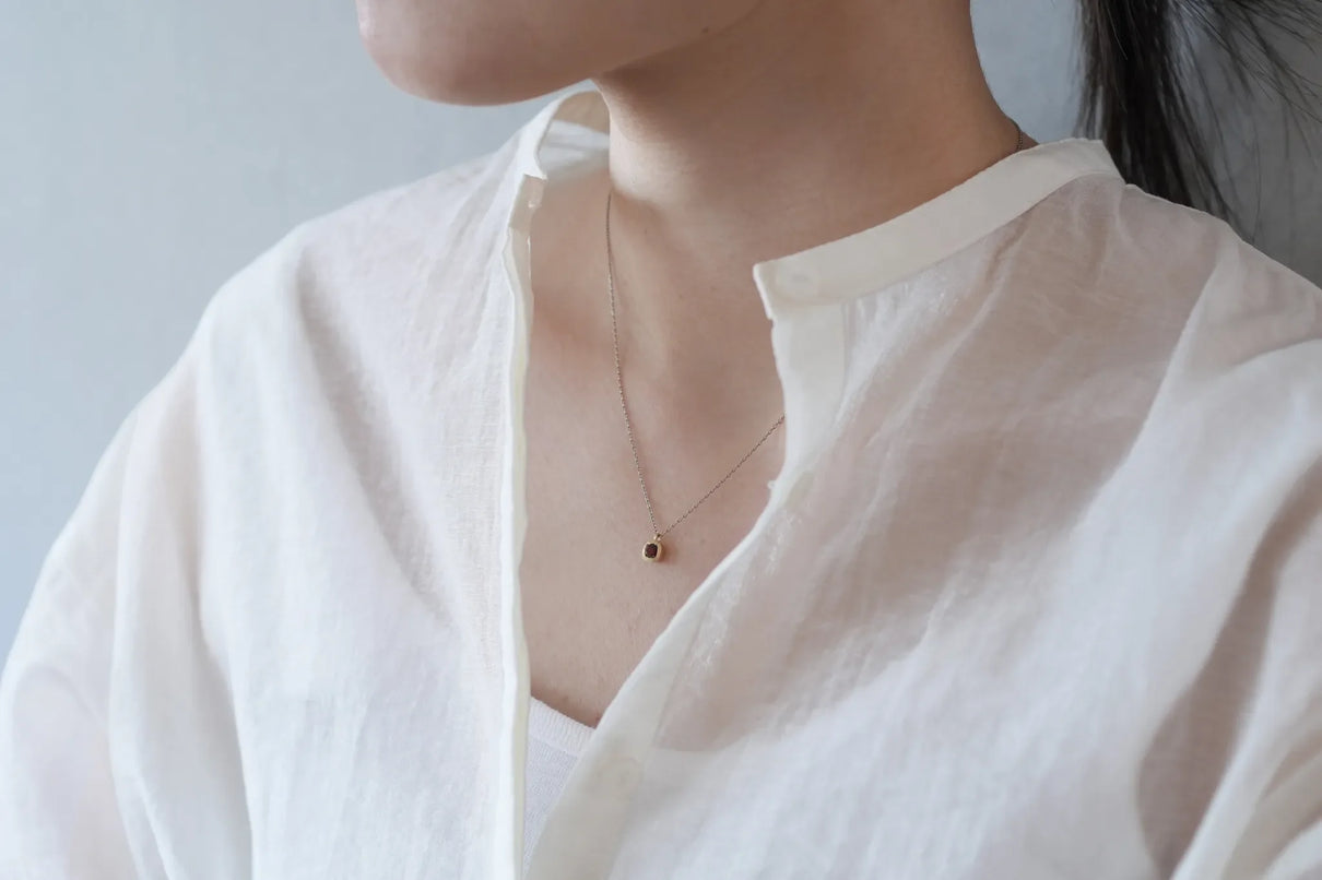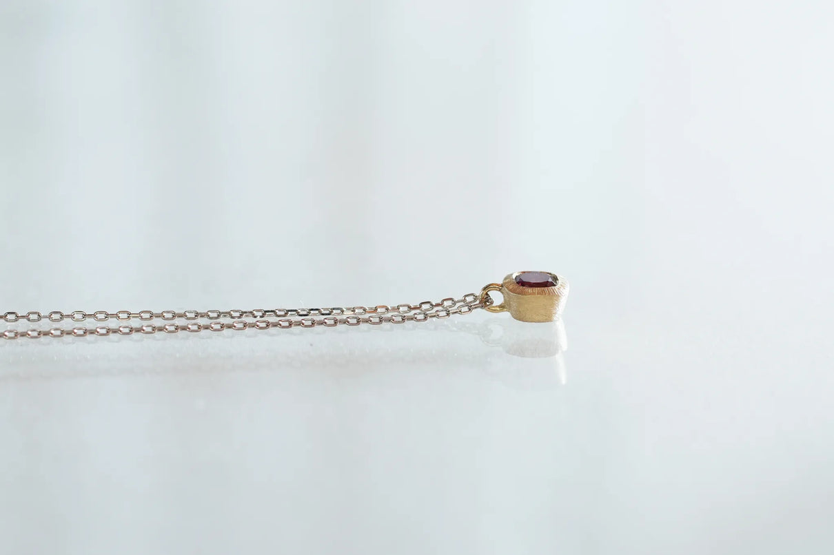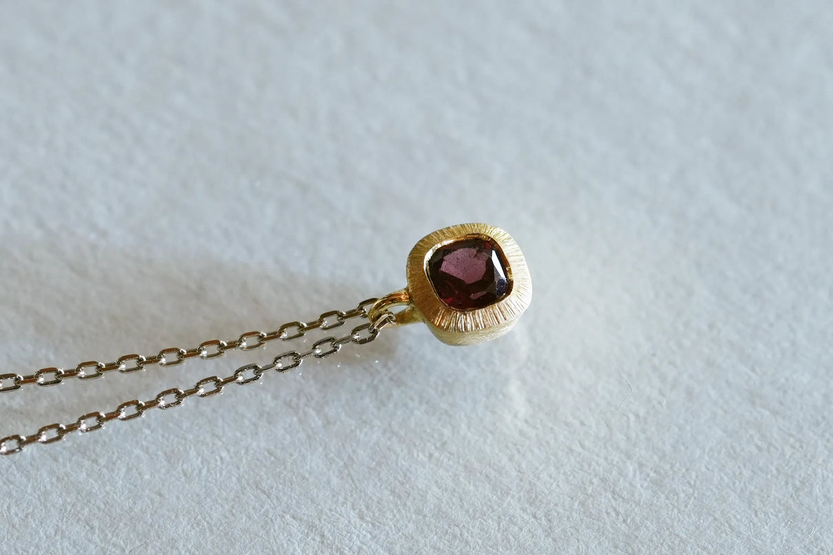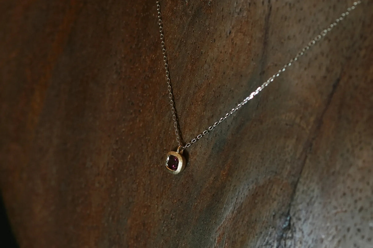 This one-of-a-kind necklace is crafted with a beautiful rhodolite garnet, featuring a captivating blend of red and purple hues. The gentle square form of the garnet, with its softly rounded corners, is complemented by a delicately etched setting, showcasing the skilled craftsmanship of the artisan. The setting is made of K18 yellow gold, while the chain is crafted from K18 white gold, creating a refined and thoughtful design. Garnet, cherished as the birthstone of January, makes this piece an ideal, meaningful talisman for those born in this month, and a perfect gift for someone special.