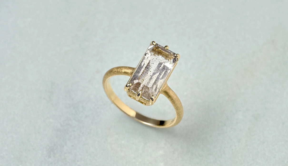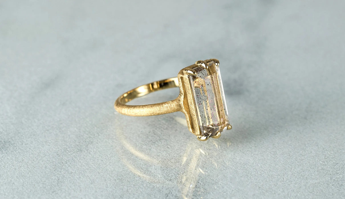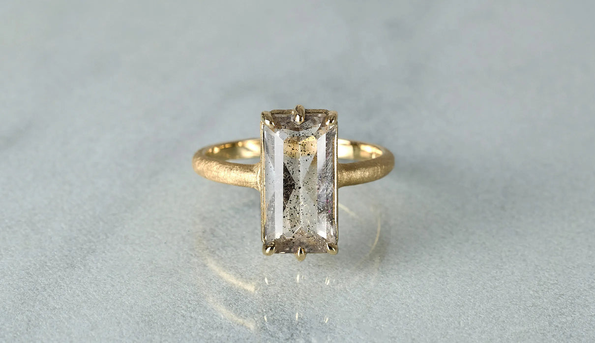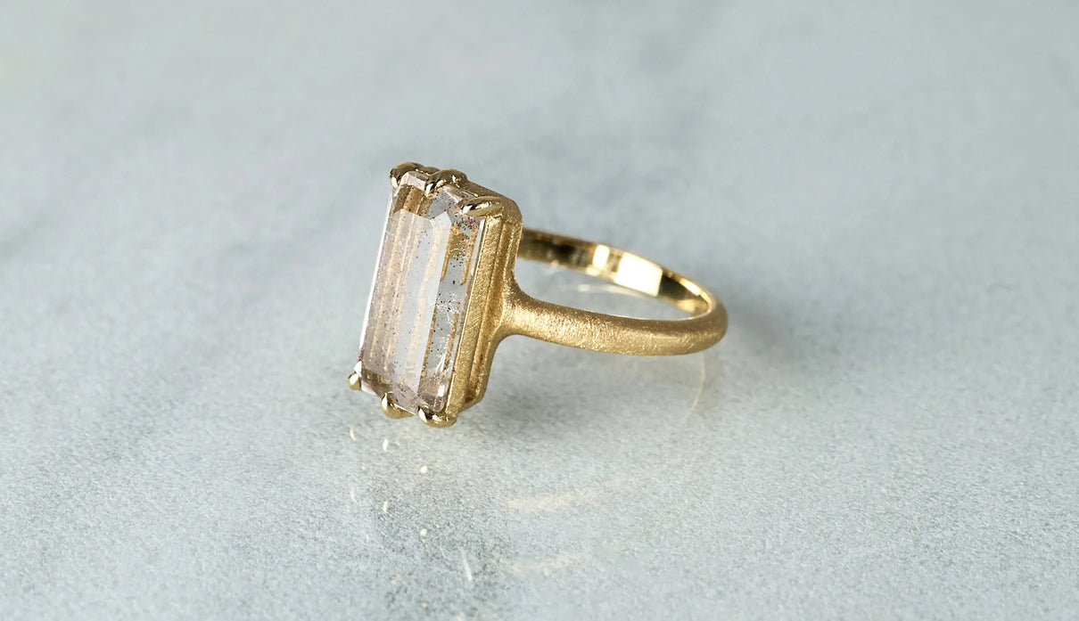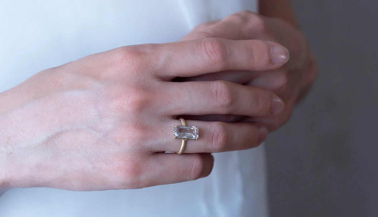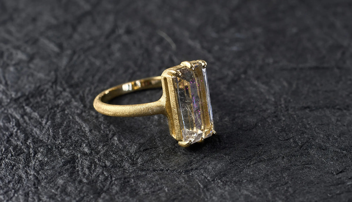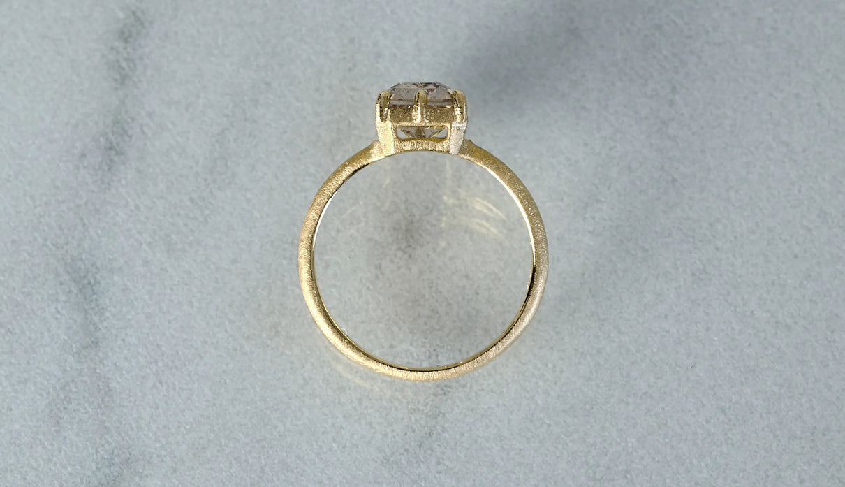 A one-of-a-kind ring set with Pink Fire Quartz, containing sparkling pink particles. Within the highly transparent, subtly tinted quartz, densely packed fine inclusions shimmer vividly in pink whenever they catch the light, resembling a galaxy spread brilliantly across a clear night sky. To showcase the stone's unique expression and fresh transparency, it is simply held by six prongs extending from the frame, accompanied by matte-finished straight-line arms. This ring adds a chic and elegant touch to everyday attire.