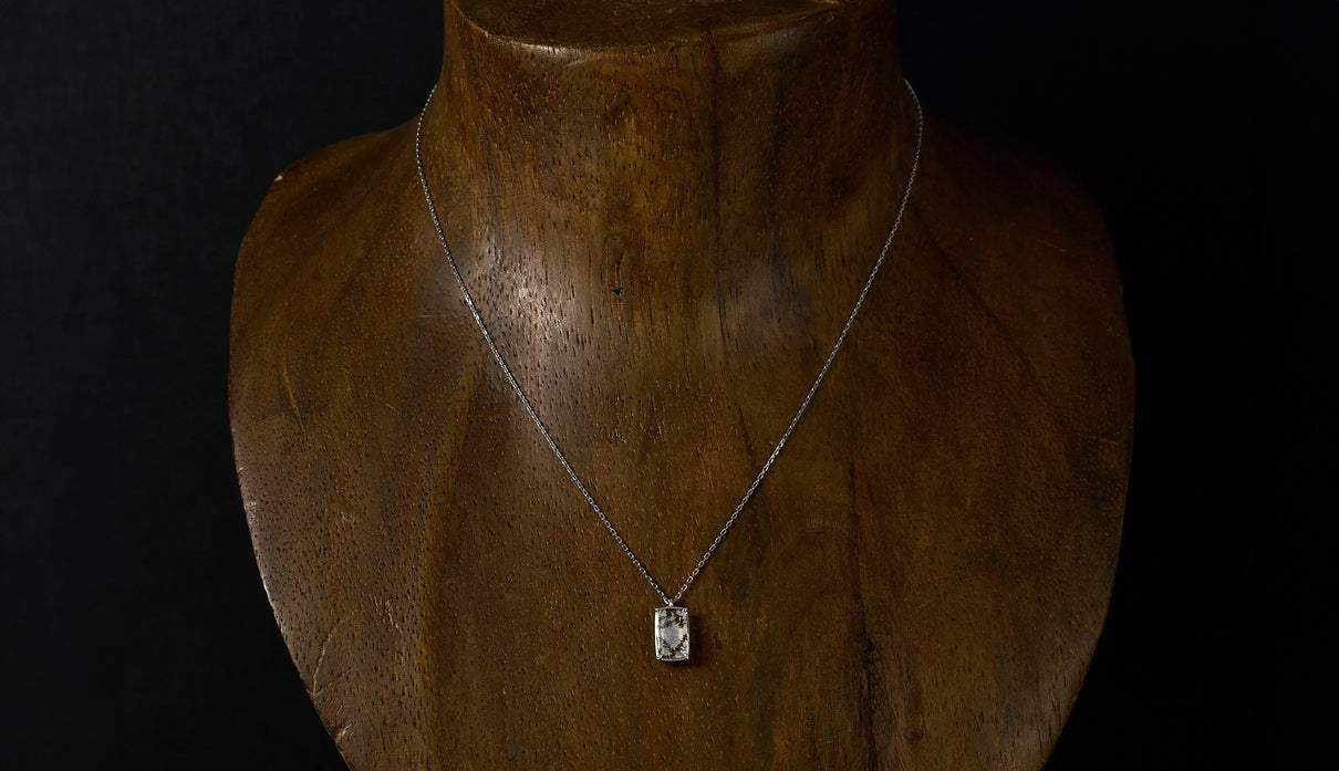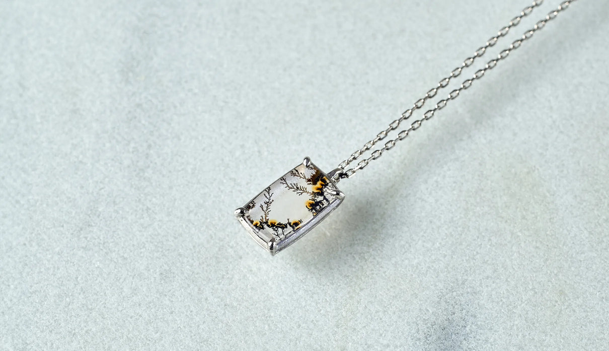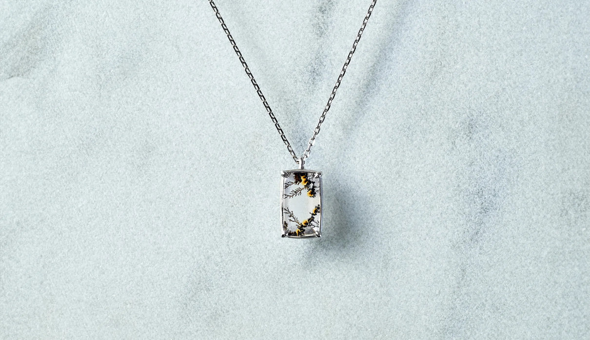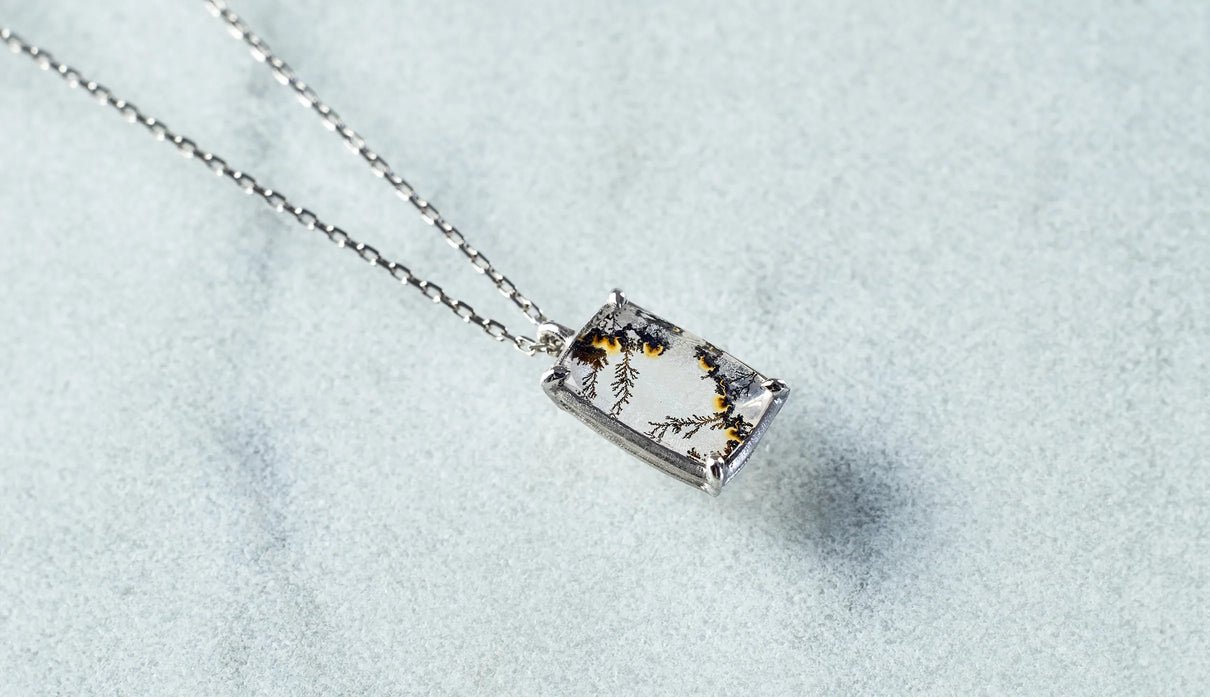 A one-of-a-kind necklace crafted from Dendritic Agate, featuring a fantastical pattern reminiscent of tree branches. These patterns are natural formations created as manganese dioxide, iron oxide, and other minerals infiltrate the stone and recrystallize. The branch- and flower-like inclusions spread gracefully within the crystal, as if purposefully arranged, creating delicate and intricate expressions. The stone, reminiscent of a miniature painting, is enhanced by a platinum setting with a simple matte texture. With a wearable volume, this necklace adds a touch of elegance and visual interest to everyday outfits.