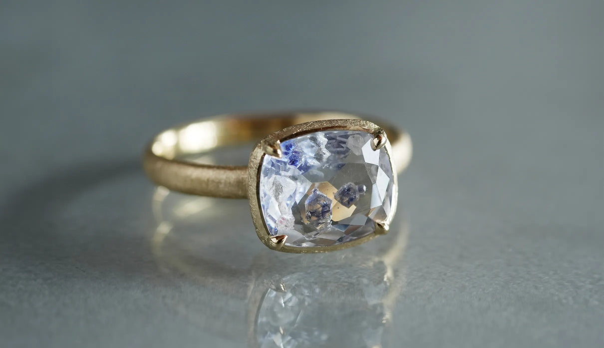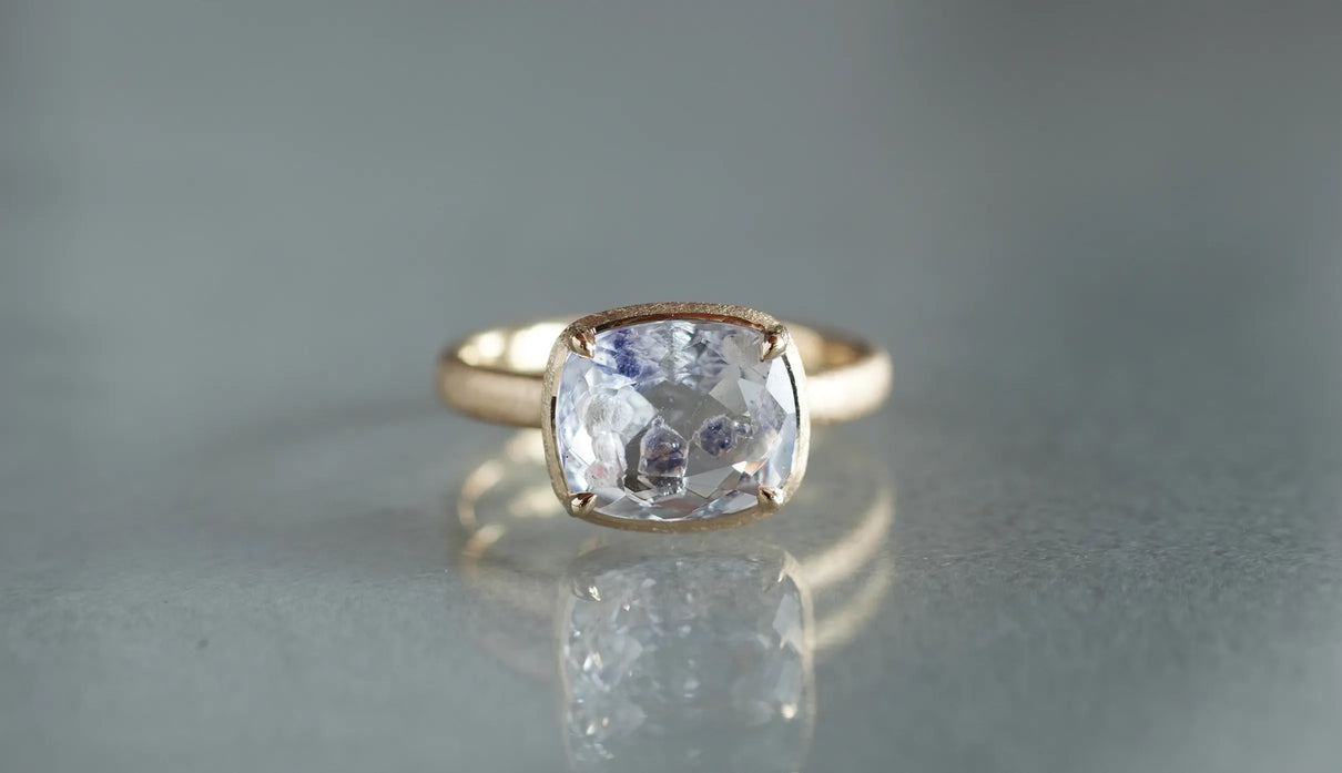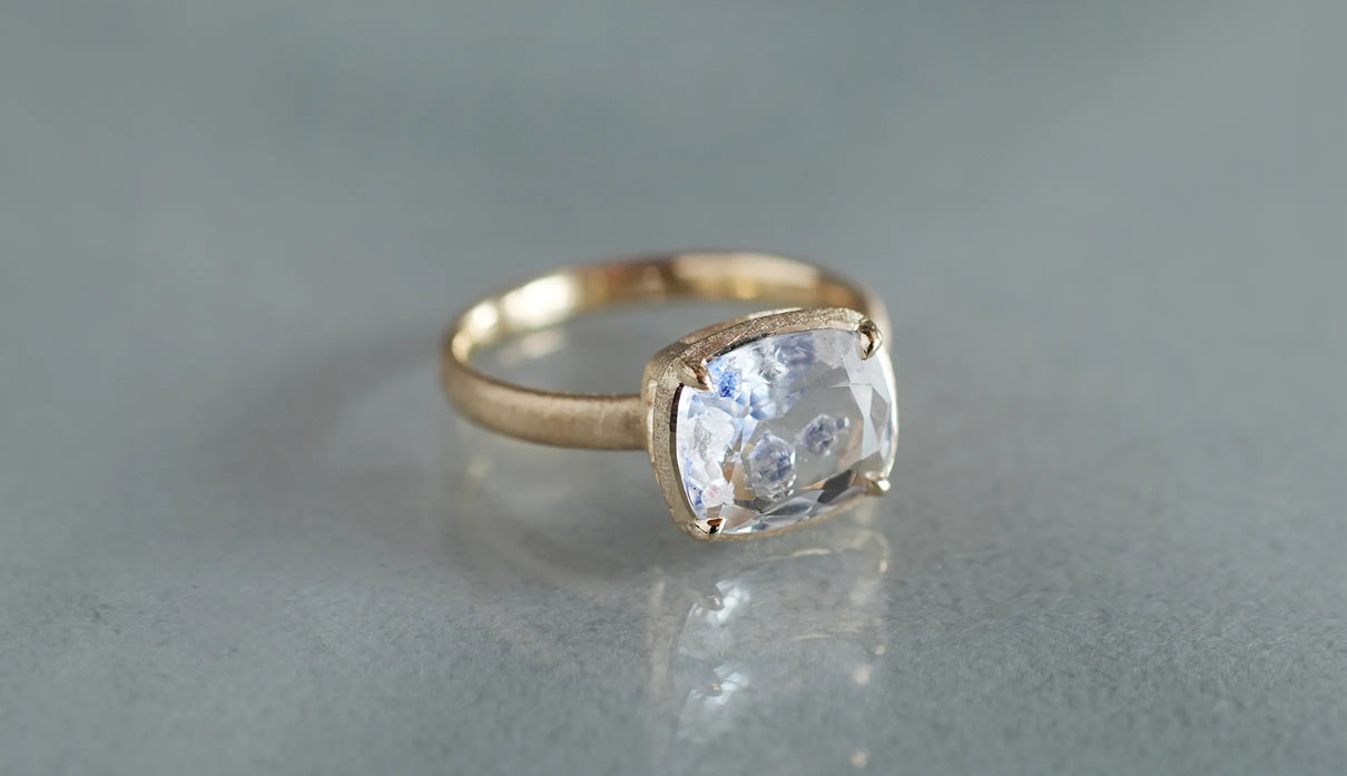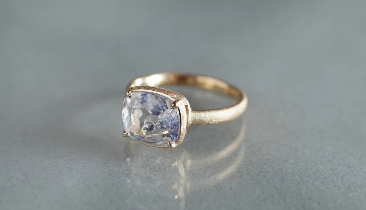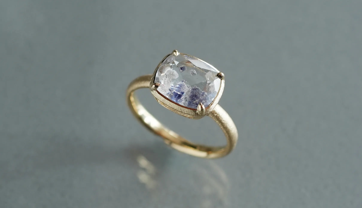 A one-of-a-kind ring crafted from rare "Fluorite in Quartz," featuring fluorite inclusions. Fluorite, known for emitting a soft glow when exposed to ultraviolet light or heat, has long been called "hotaru-ishi" (firefly stone). While its low hardness makes it commonly appreciated as a specimen, fluorite trapped within quartz becomes exceptionally rare, with only two known production sites worldwide and current mining being extremely difficult. This ring showcases a cushion-cut quartz of high transparency, within which gentian-colored fluorite floats as if freed from gravity. The setting is finished in matte, allowing ample light from all directions to enhance the stone's fresh, luminous brilliance. A special ring that adds refined elegance and just the right amount of sparkle to everyday wear.