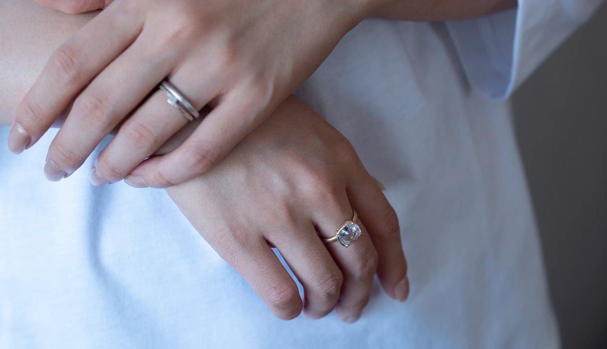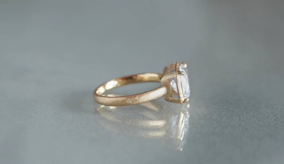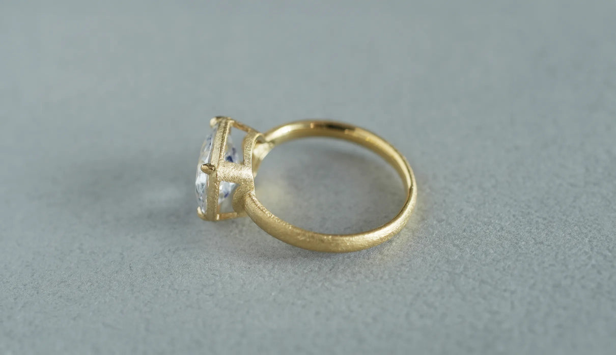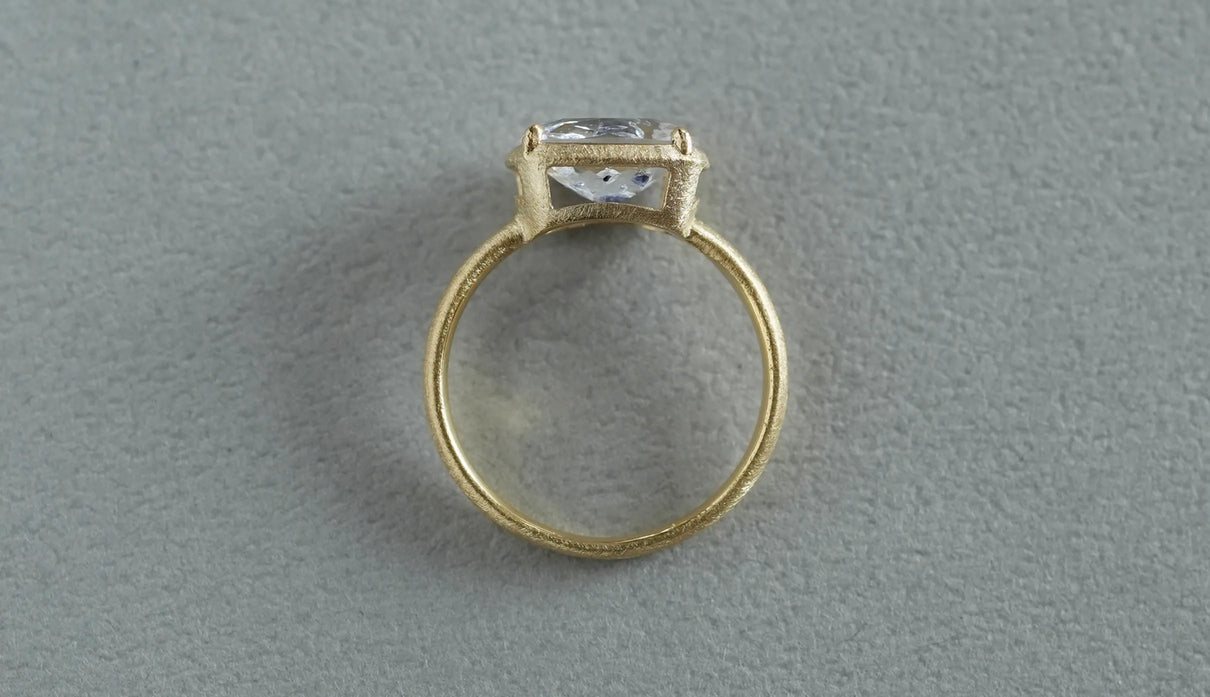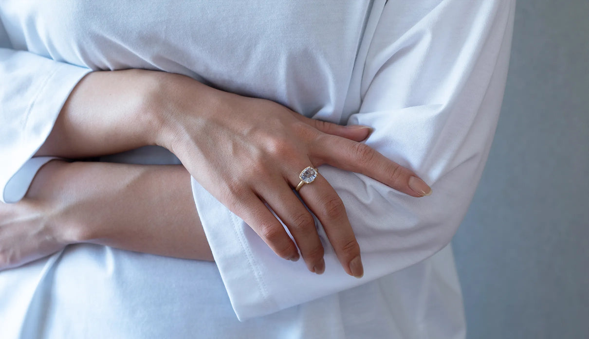 A one-of-a-kind ring crafted from rare "Fluorite in Quartz," featuring fluorite inclusions. Fluorite, known for emitting a soft glow when exposed to ultraviolet light or heat, has long been called "hotaru-ishi" (firefly stone). While its low hardness makes it commonly appreciated as a specimen, fluorite trapped within quartz becomes exceptionally rare, with only two known production sites worldwide and current mining being extremely difficult. This ring showcases a cushion-cut quartz of high transparency, within which gentian-colored fluorite floats as if freed from gravity. The setting is finished in matte, allowing ample light from all directions to enhance the stone's fresh, luminous brilliance. A special ring that adds refined elegance and just the right amount of sparkle to everyday wear.