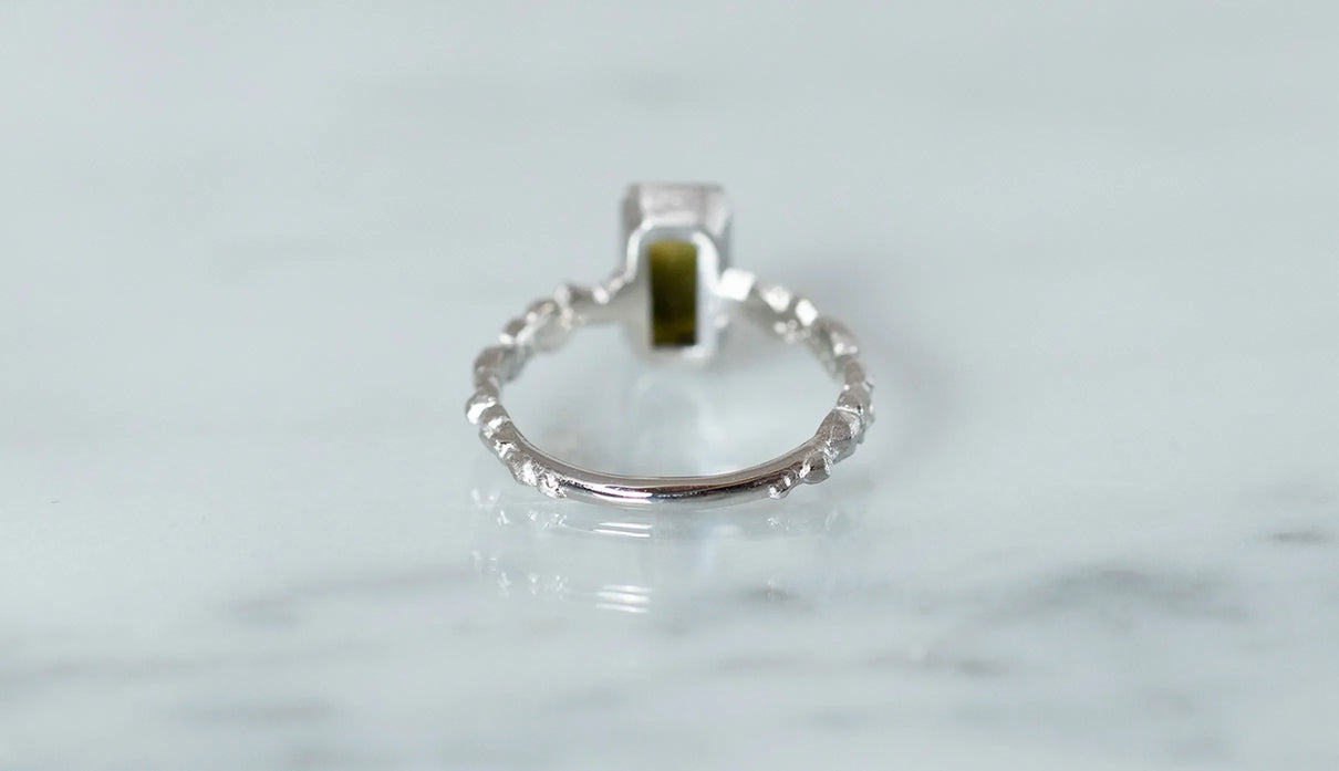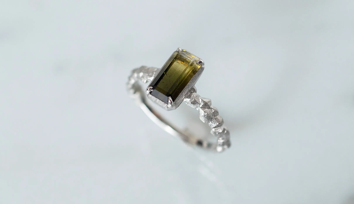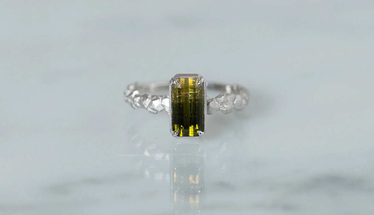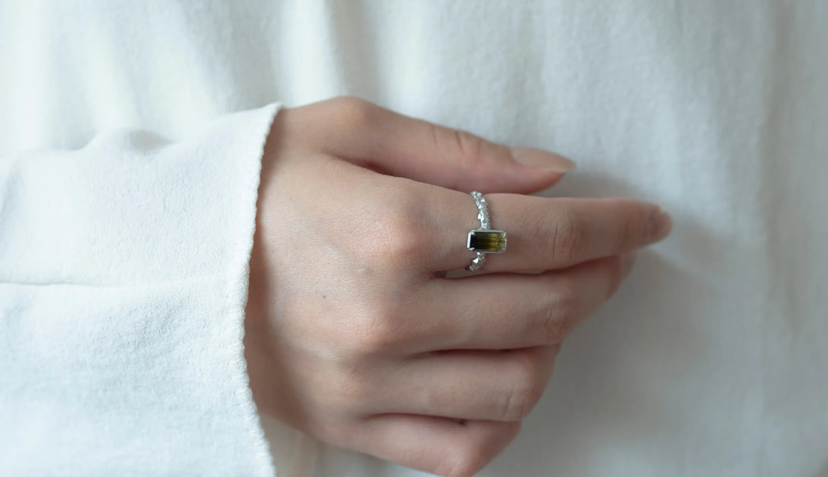 From the "Whisper" series, inspired by the quiet lives of tiny creatures hidden deep in the forest, this one-of-a-kind ring is set with a bicolor tourmaline displaying a beautiful gradient of calm, forest-like greens. The tourmaline offers a serene presence with its gradual transitions of color, exuding a composed and captivating charm. As tourmaline is also the birthstone for October, this ring is perfect not only as a standout piece for everyday wear but also as a special gift.