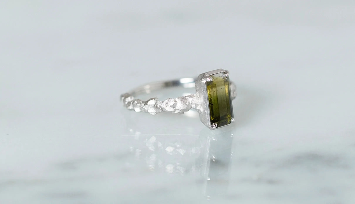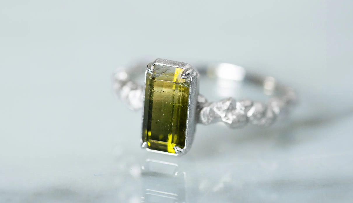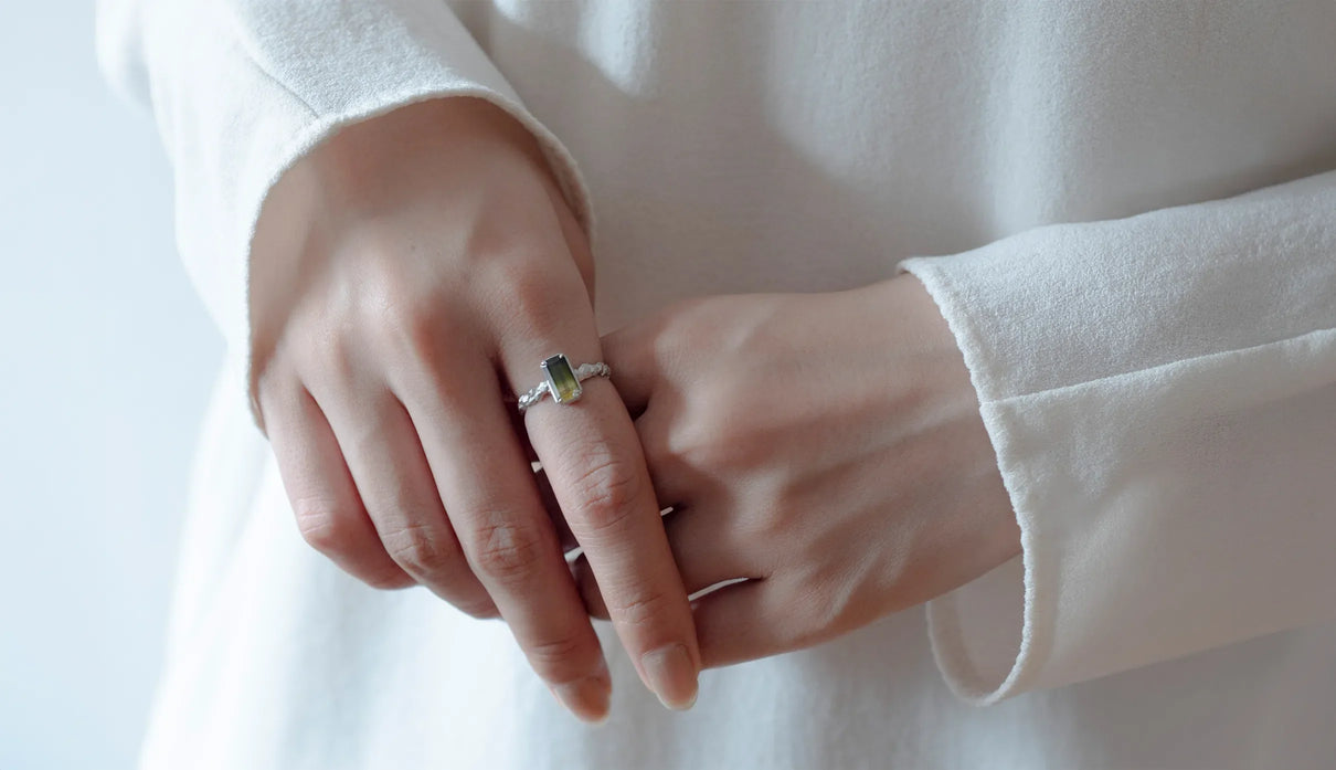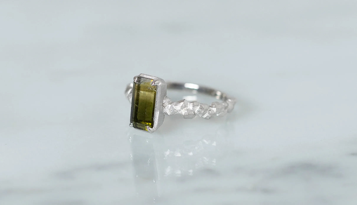 From the "Whisper" series, inspired by the quiet lives of tiny creatures hidden deep in the forest, this one-of-a-kind ring is set with a bicolor tourmaline displaying a beautiful gradient of calm, forest-like greens. The tourmaline offers a serene presence with its gradual transitions of color, exuding a composed and captivating charm. As tourmaline is also the birthstone for October, this ring is perfect not only as a standout piece for everyday wear but also as a special gift.
