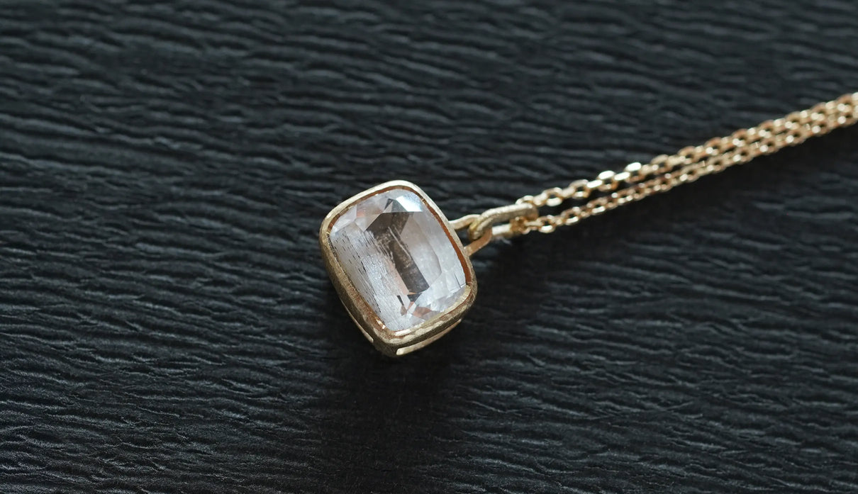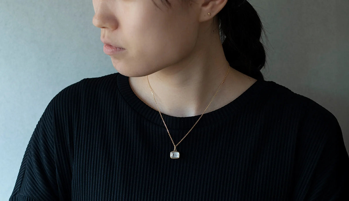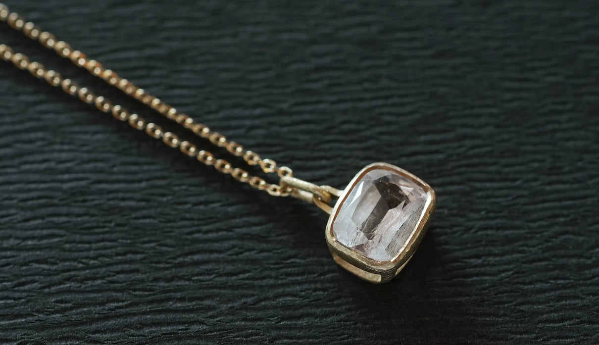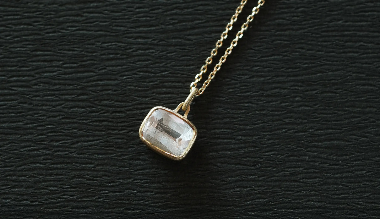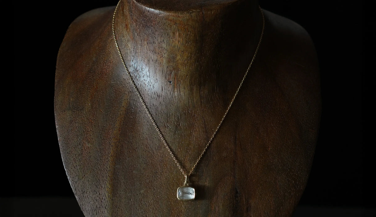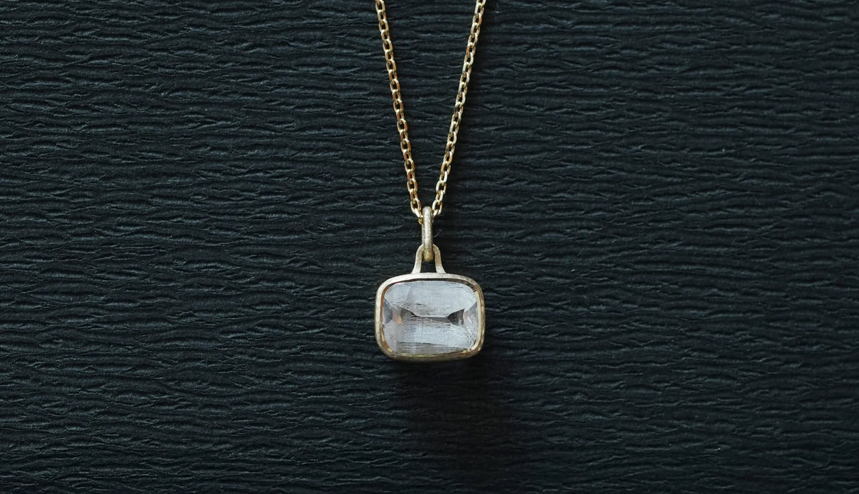 A one-of-a-kind necklace crafted with a tube-included topaz. This exceptionally rare gemstone contains elongated, tunnel-like crystal formations that were naturally sealed inside during the topaz's creation. The densely packed crystals shimmer like silk, appearing as though light itself has drawn a quiet, bi-colored glow that floats gently up and down within the stone. The crystal evokes frost rising from the earth in the crisp morning air, where each breath turns white. From among these, we carefully selected a particularly beautiful piece—clear and pure, with a soft white hue resting within its transparency. Its inner expression shifts depending on the angle, and with every reflection of light, it transforms—at times appearing like a perfectly clear crystal, and at others spreading white in all directions like a snowflake—captivating all who gaze upon it. The softly rounded, horizontally set cushion cut is gently held by a matte K18 yellow gold setting, which enhances the stone's clarity and lends the necklace a quiet, refined presence. Topaz, also cherished as the birthstone for November, makes this necklace a meaningful protective charm for those born in that month.