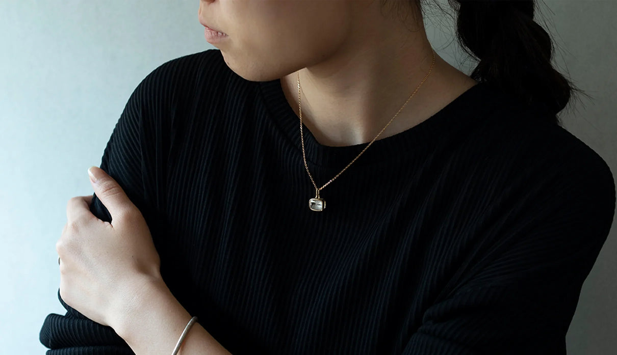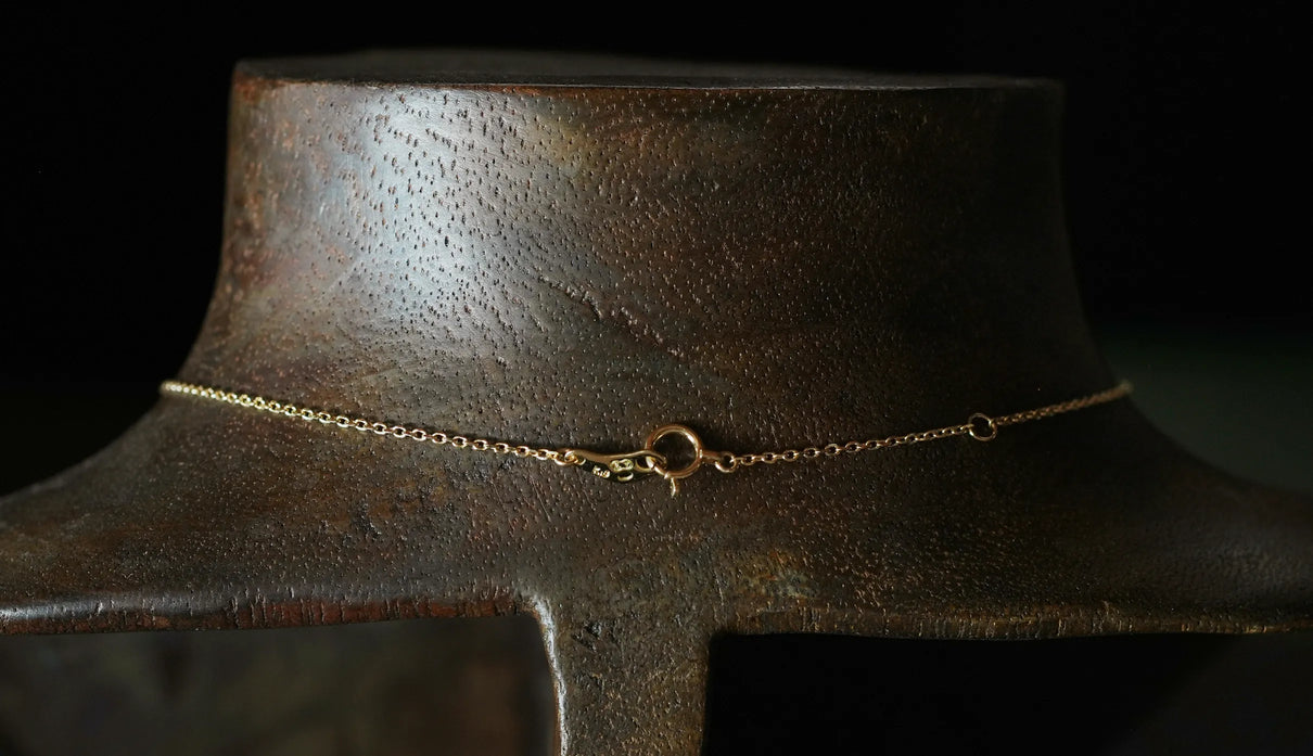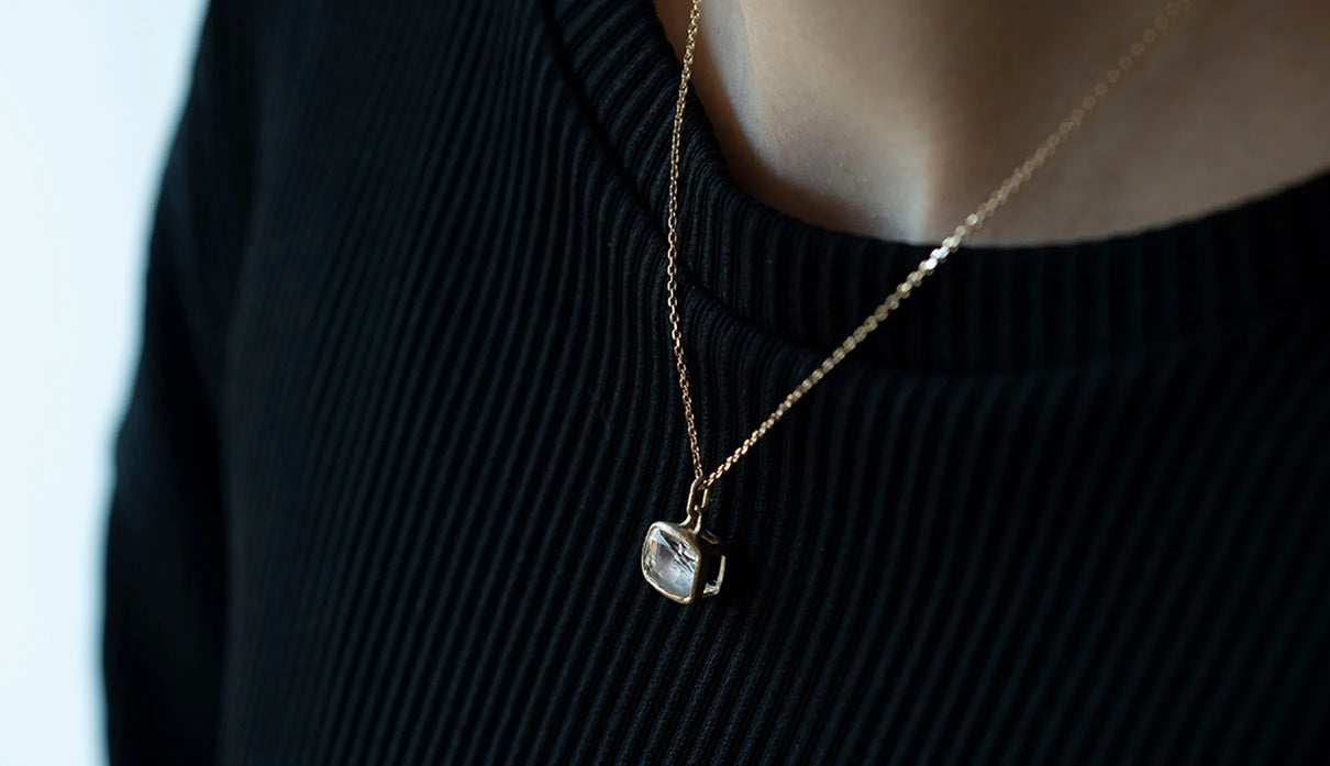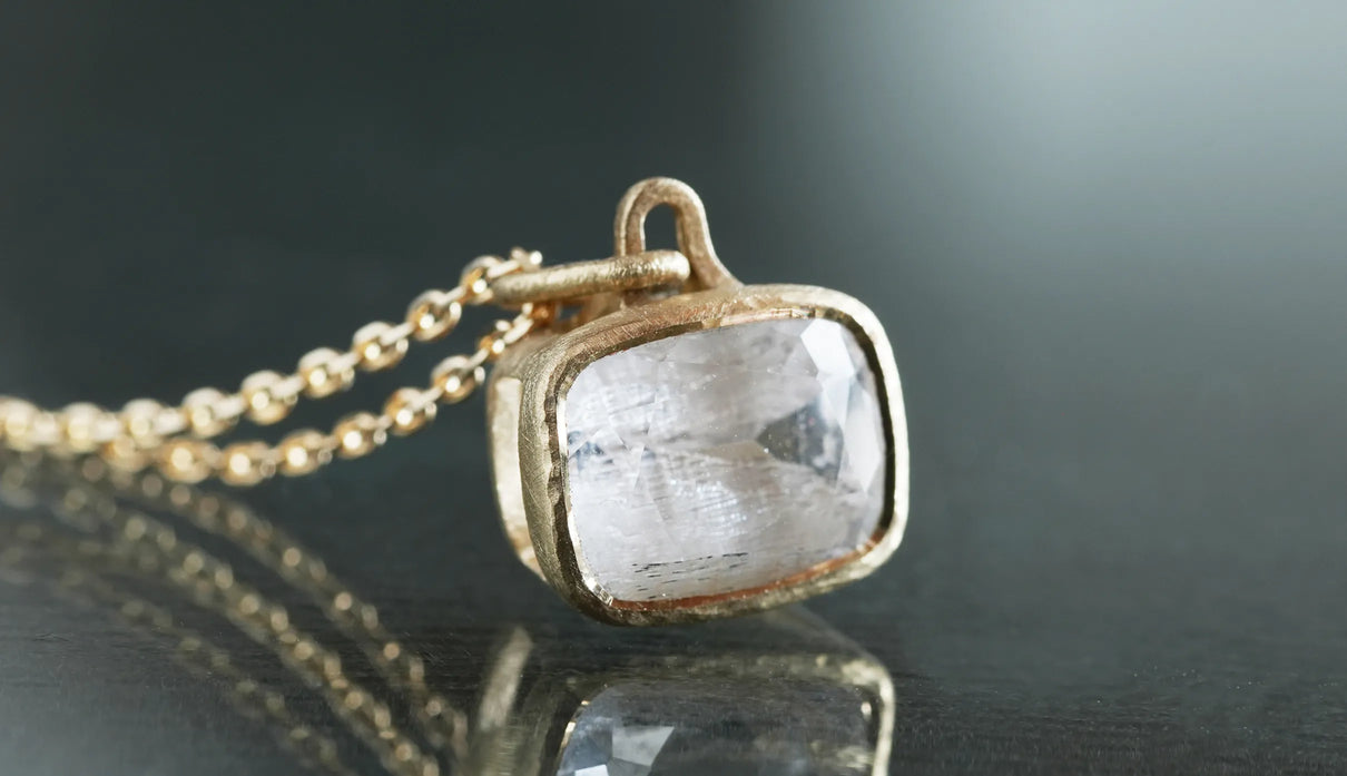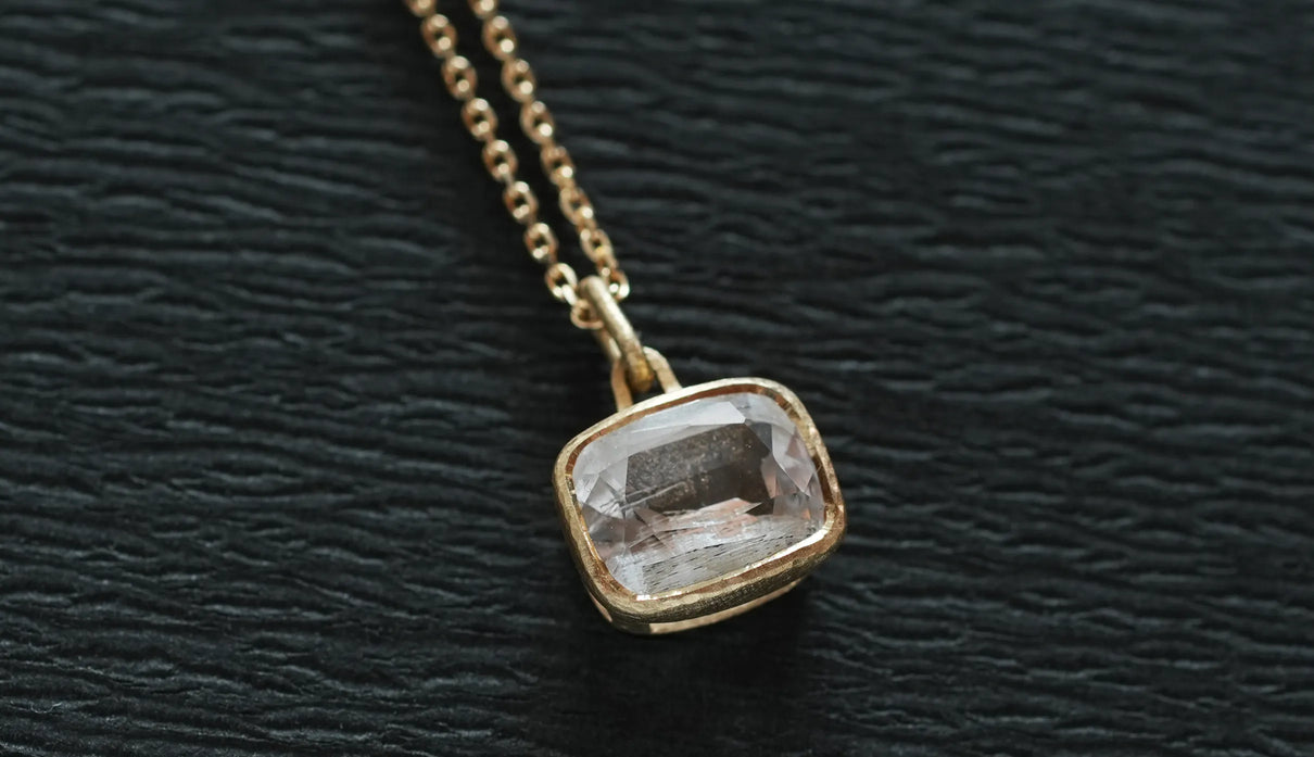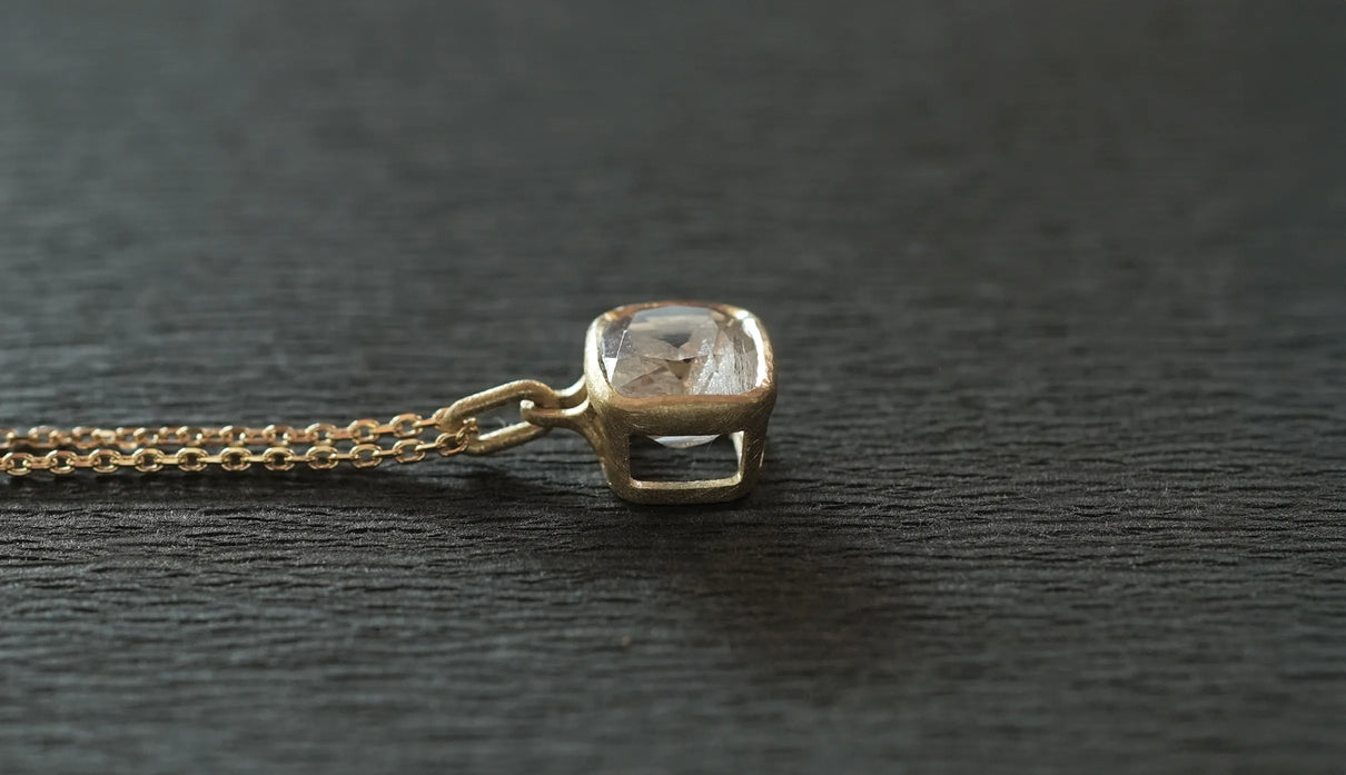 A one-of-a-kind necklace crafted with a tube-included topaz. This exceptionally rare gemstone contains elongated, tunnel-like crystal formations that were naturally sealed inside during the topaz's creation. The densely packed crystals shimmer like silk, appearing as though light itself has drawn a quiet, bi-colored glow that floats gently up and down within the stone. The crystal evokes frost rising from the earth in the crisp morning air, where each breath turns white. From among these, we carefully selected a particularly beautiful piece—clear and pure, with a soft white hue resting within its transparency. Its inner expression shifts depending on the angle, and with every reflection of light, it transforms—at times appearing like a perfectly clear crystal, and at others spreading white in all directions like a snowflake—captivating all who gaze upon it. The softly rounded, horizontally set cushion cut is gently held by a matte K18 yellow gold setting, which enhances the stone's clarity and lends the necklace a quiet, refined presence. Topaz, also cherished as the birthstone for November, makes this necklace a meaningful protective charm for those born in that month.