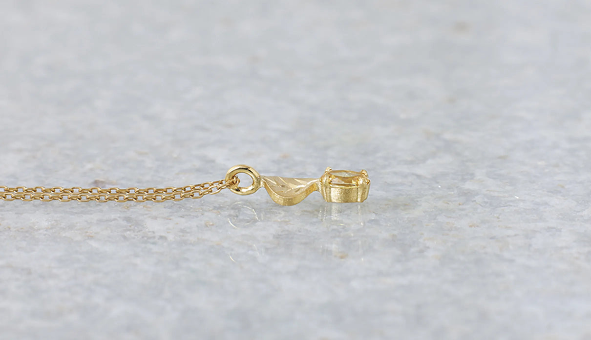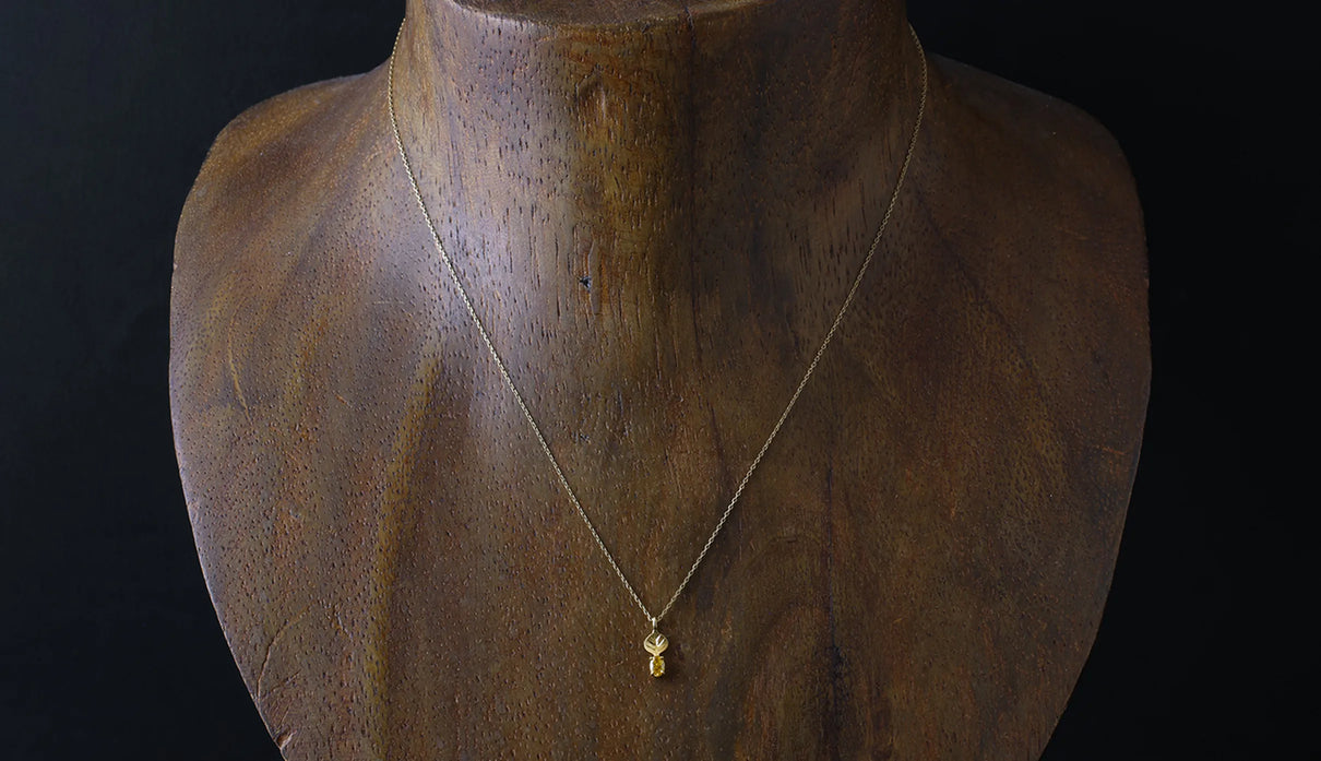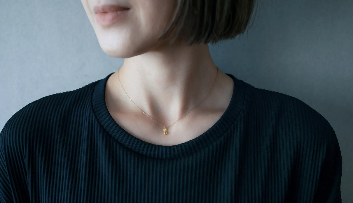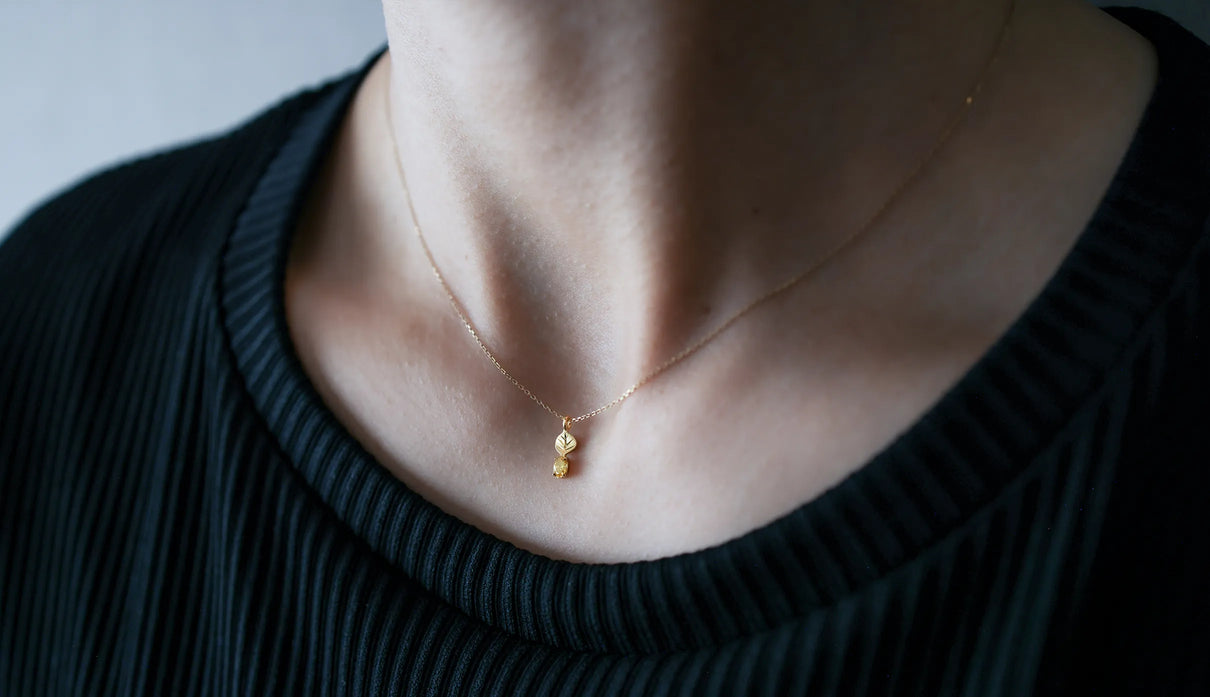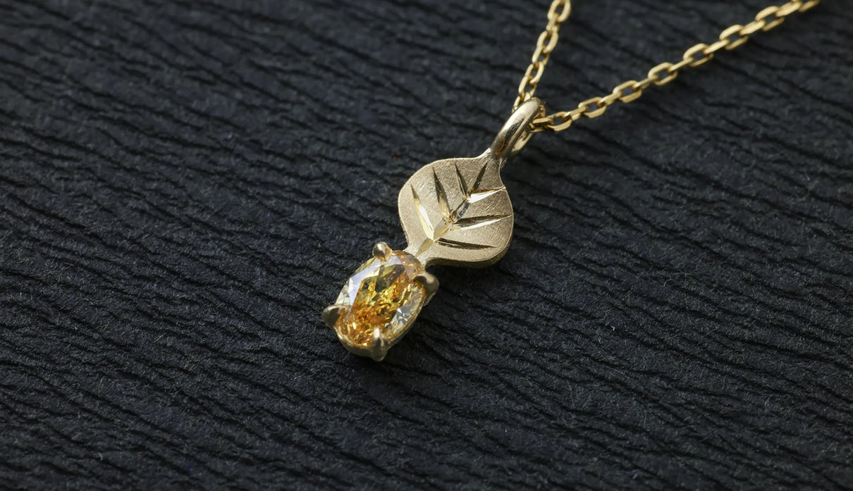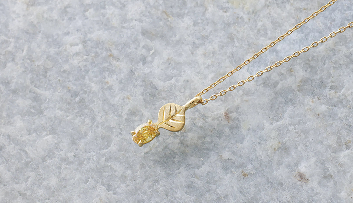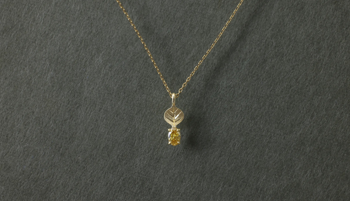 A one-of-a-kind necklace from the "Leaf" series, featuring a motif of a leaf reaching toward the light, accented with a small yellow diamond that carries a rich, honey-like hue. The leaf portion is finished with a matte texture to create a soft expression, blending gently against the skin with a calm, understated elegance. Though small, the yellow diamond subtly sparkles whenever it catches the light, adding a gentle brightness to the neckline. Its modest yet poised presence captures the natural form as if preserved in its entirety. This piece adds a delicate glow and subtle individuality to everyday attire.