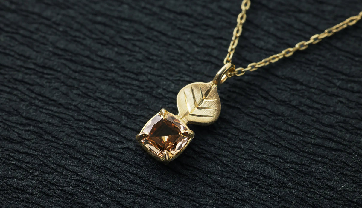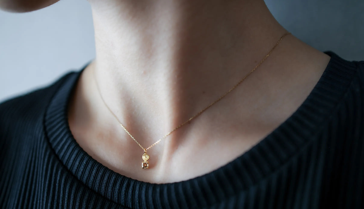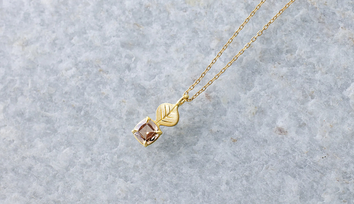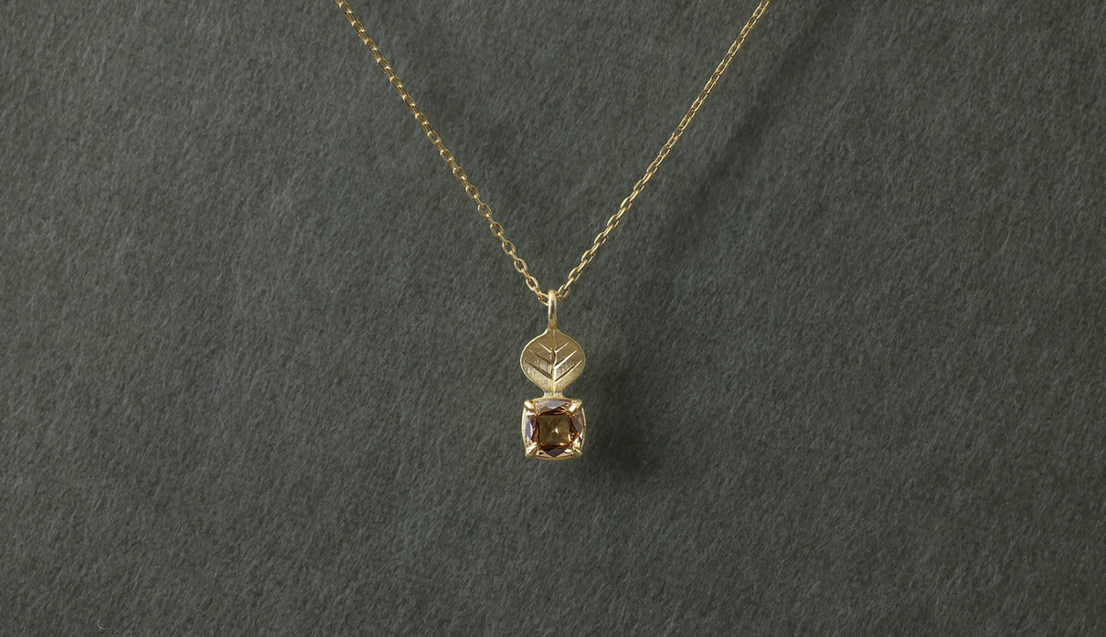 A one-of-a-kind necklace from the "Leaf" series, featuring a motif of a leaf reaching toward the light, accented with a highly transparent light brown rose-cut diamond. The leaf portion is finished with a matte texture to create a soft expression, allowing it to blend gently against the skin with a calm, understated presence. The diamond showcases the fresh brilliance characteristic of a rose cut, quietly sparkling whenever it catches the light. Modest yet imbued with a sense of elegance and serenity, this piece can serve as a protective charm for special occasions or add subtle depth to everyday attire. A necklace that quietly accompanies and complements daily life.