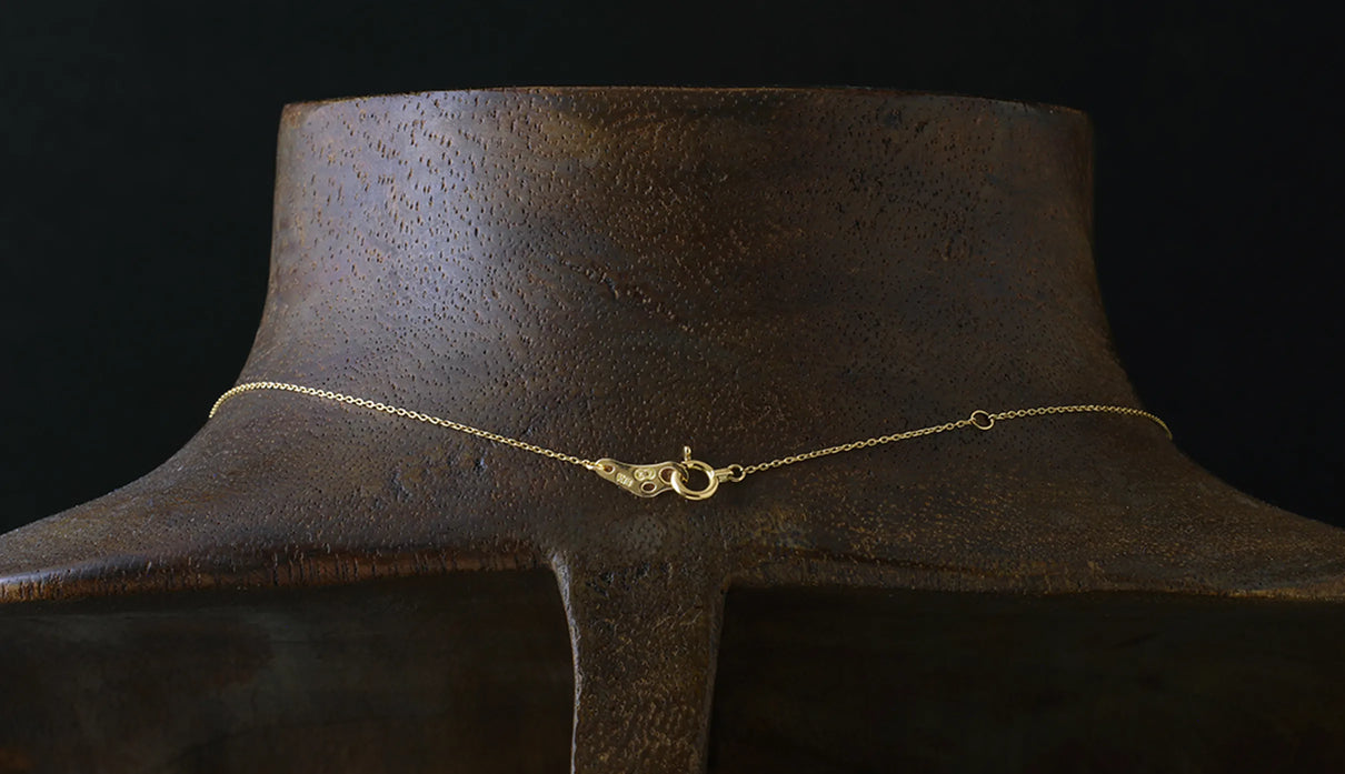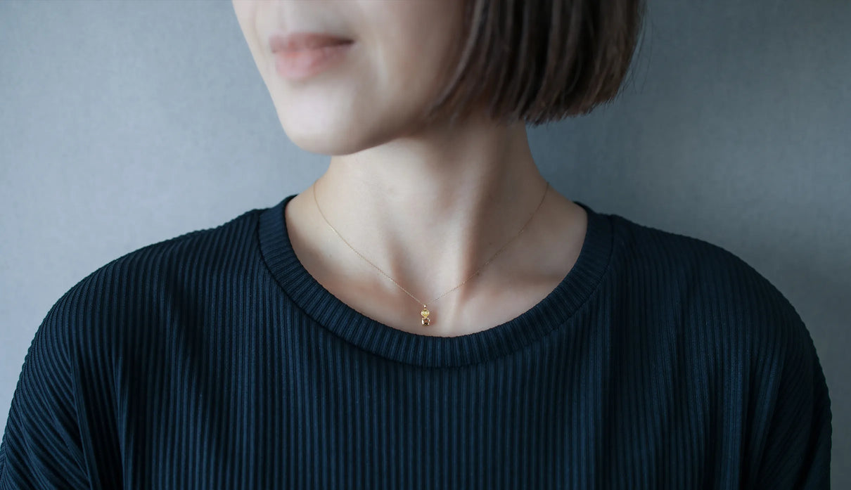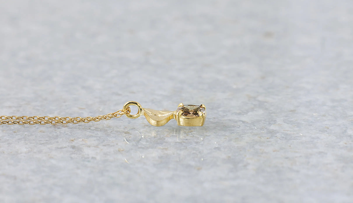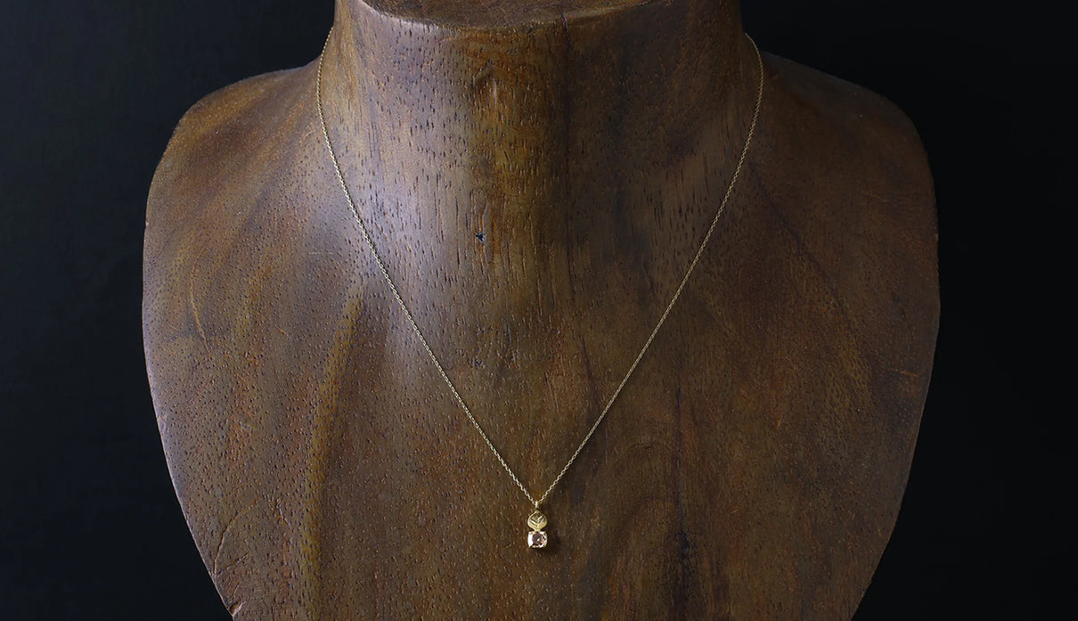 A one-of-a-kind necklace from the "Leaf" series, featuring a motif of a leaf reaching toward the light, accented with a highly transparent light brown rose-cut diamond. The leaf portion is finished with a matte texture to create a soft expression, allowing it to blend gently against the skin with a calm, understated presence. The diamond showcases the fresh brilliance characteristic of a rose cut, quietly sparkling whenever it catches the light. Modest yet imbued with a sense of elegance and serenity, this piece can serve as a protective charm for special occasions or add subtle depth to everyday attire. A necklace that quietly accompanies and complements daily life.
