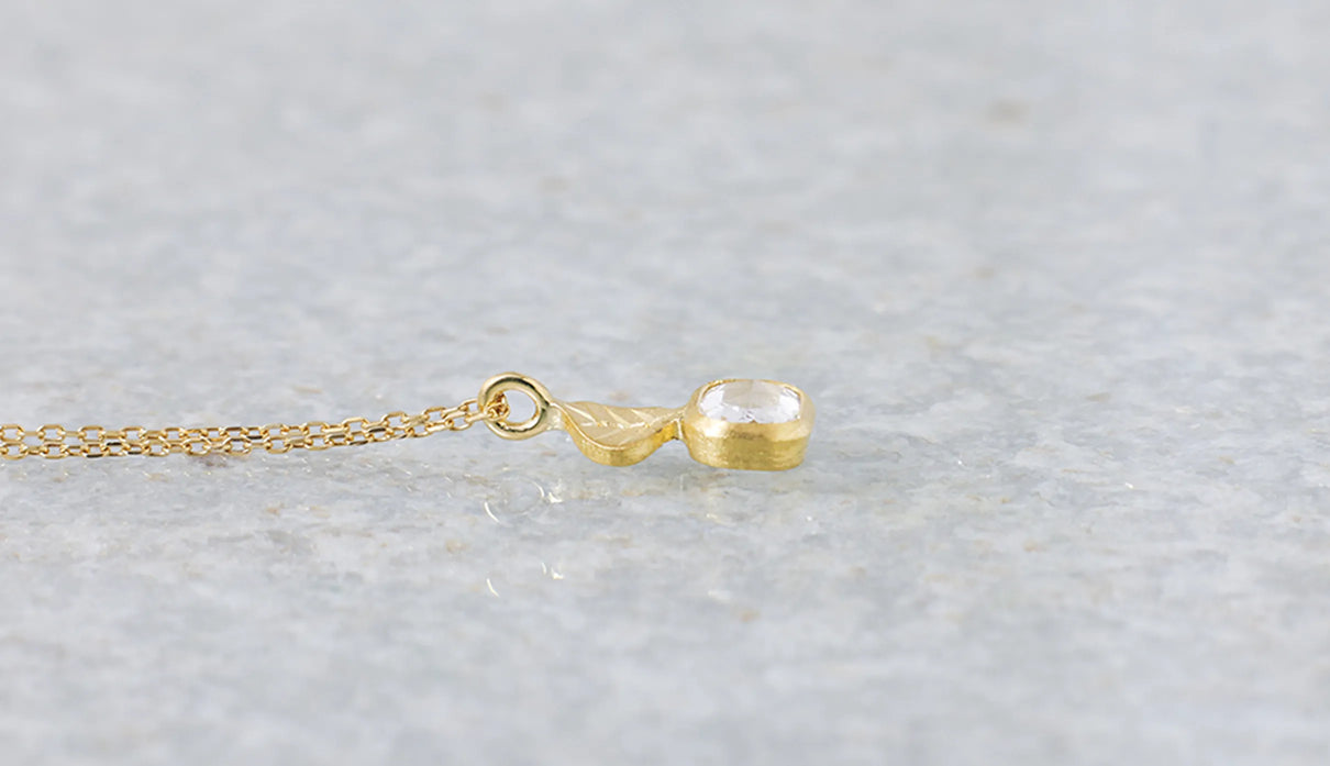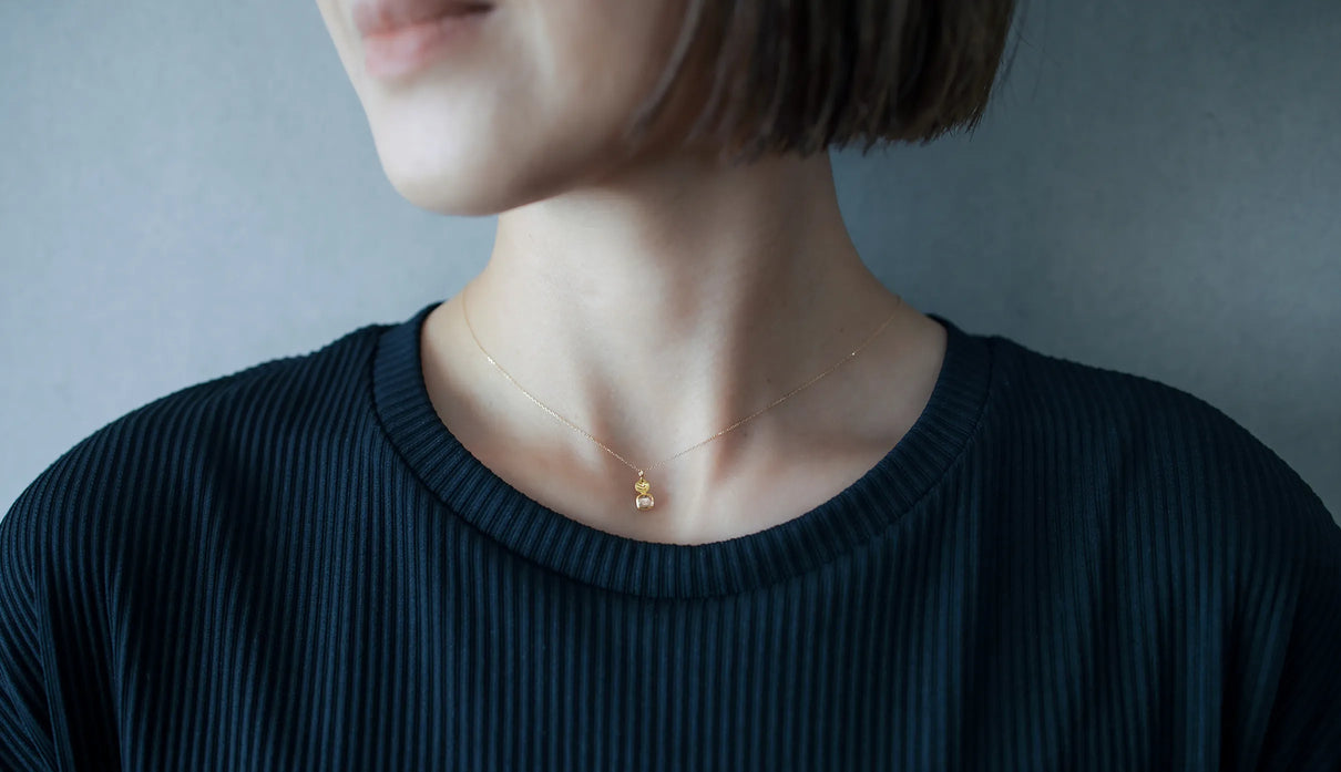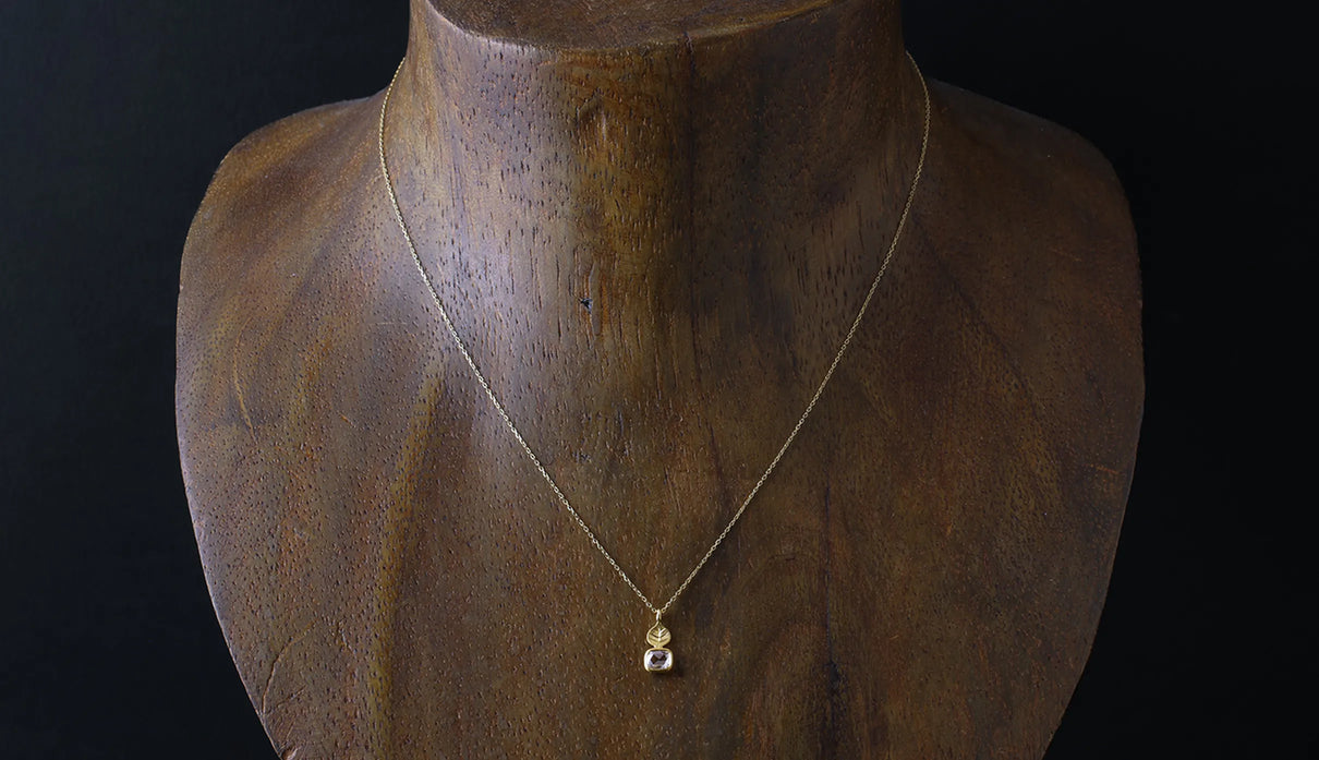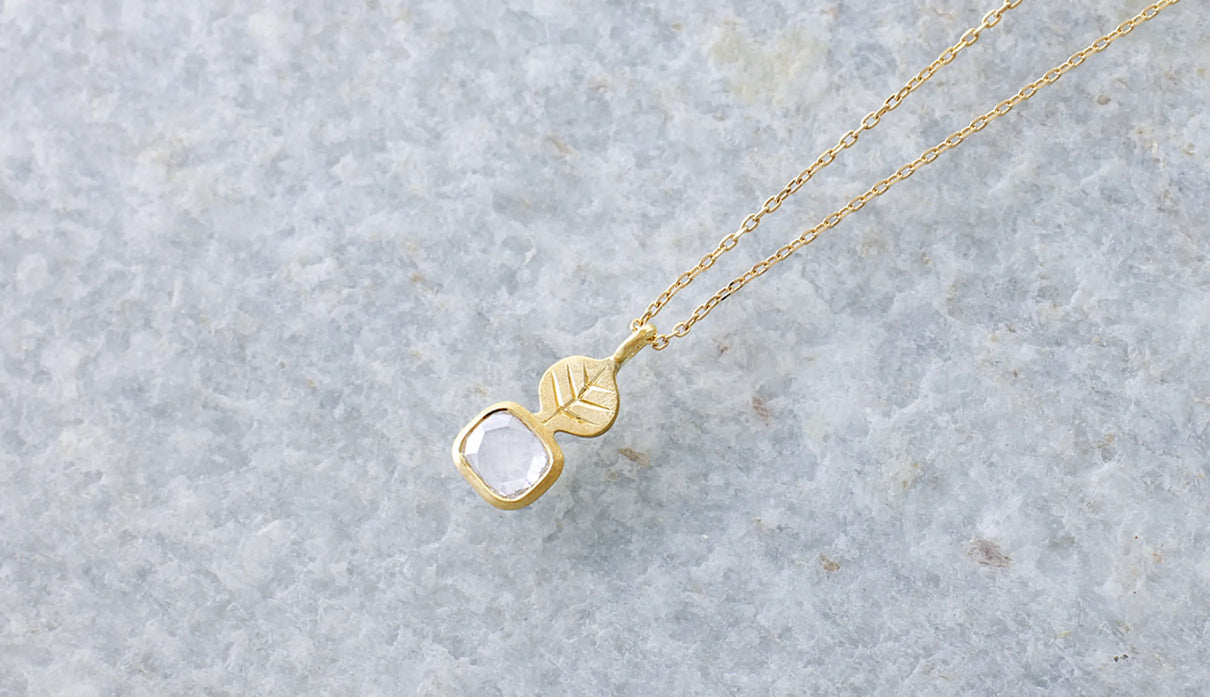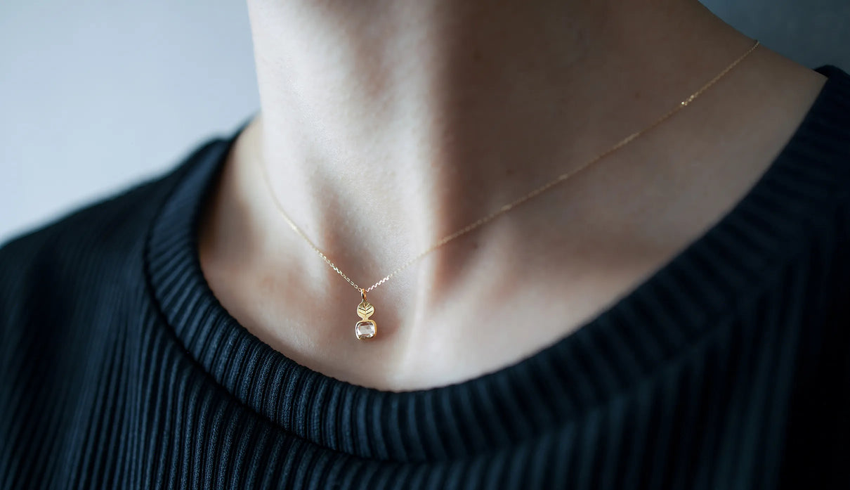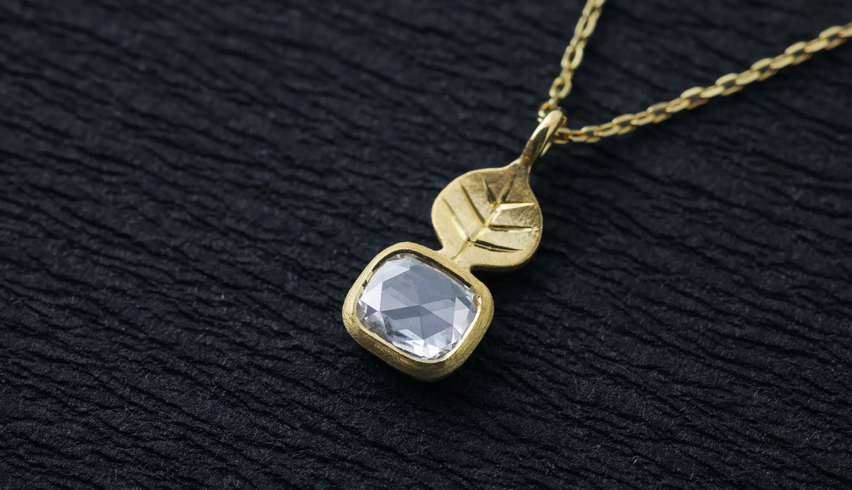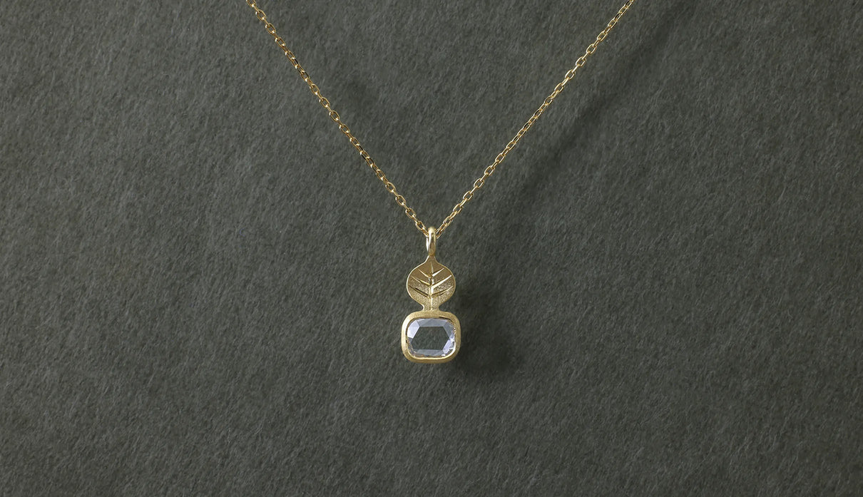 A one-of-a-kind necklace from the "Leaf" series, featuring a leaf motif reaching toward the light, accented with a highly transparent rose-cut clear diamond. The leaf component is finished with a matte texture, creating a gentle expression that softly blends with the skin. The diamond exudes the subtle, elegant sparkle unique to a rose cut, reminiscent of light touching the surface of water. This piece naturally complements everyday attire while adding a delicate touch of brilliance to the neckline. Perfect as a gift for a loved one or as a companion in your own daily life, it is a necklace that quietly accompanies you, adding a soft, understated glow.