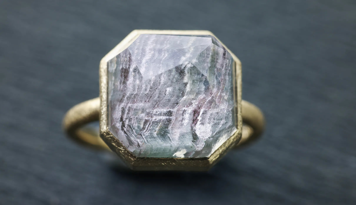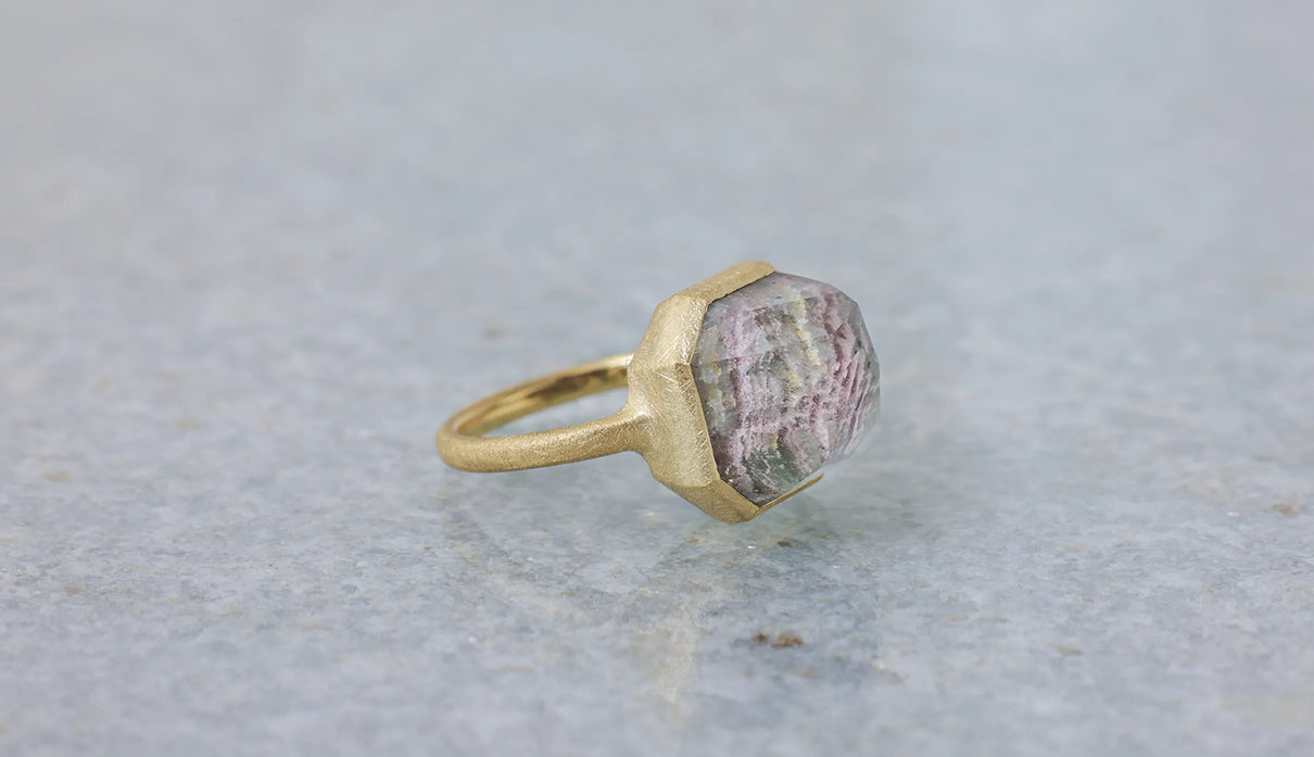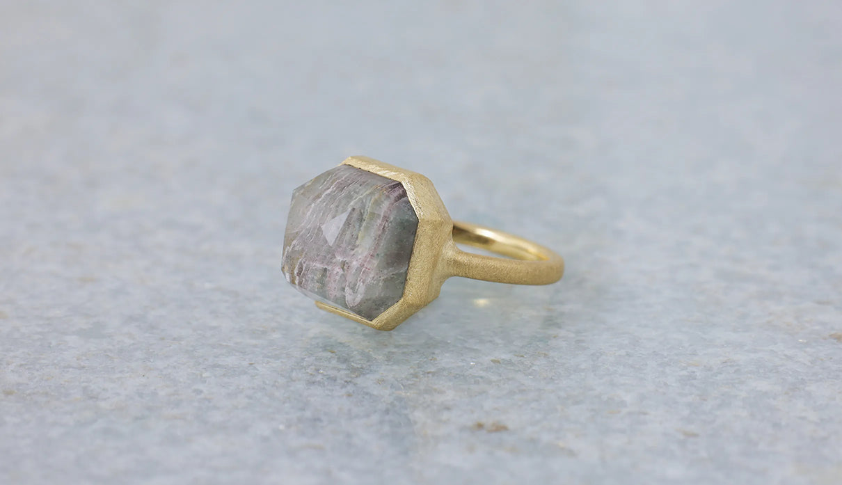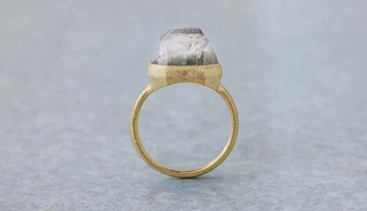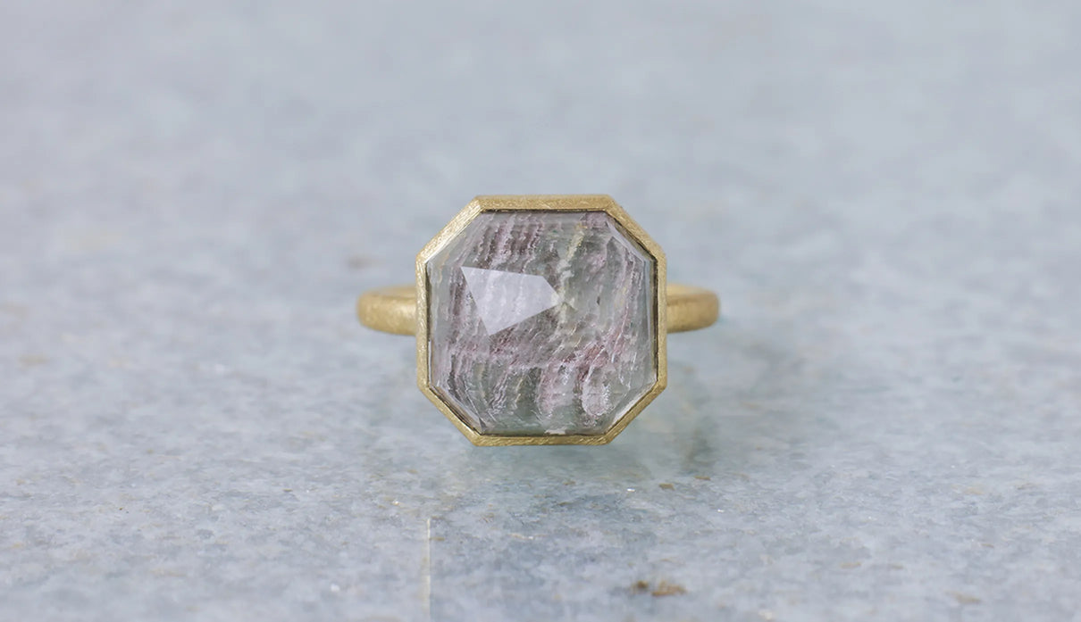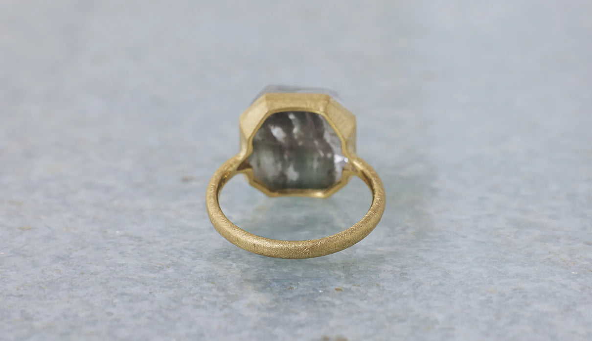 A one-of-a-kind garden quartz ring featuring hand-polished cutting by gem polisher Canna Oshiro. Smoky green and pale pink layers blend together, creating a gem with depth reminiscent of a cross-section of geological strata. The intricate layering evokes tree rings, conveying the passage of time and a quiet presence within. The unique cut, with rough surfaces and gentle elevations, harmonizes with the organic expression of the inclusions, revealing a new perspective from every angle. The ring is crafted with a minimal bezel setting, quietly embracing the stone's presence. As if a single moment in time is gently placed at your fingertips, this one-of-a-kind ring leaves a profound, lingering impression.