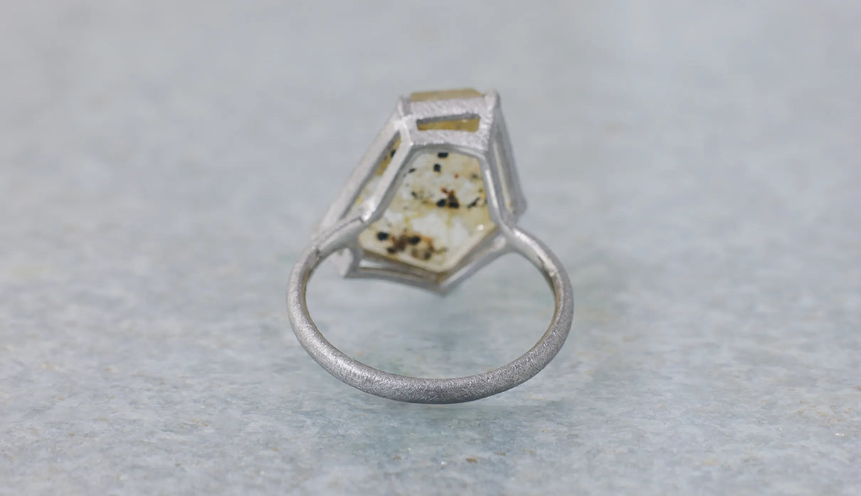 A one-of-a-kind Starburst Gold Rutilated Quartz ring featuring hand-polished cutting by gem polisher Canna Oshiro. Within the highly transparent quartz, fine rutiles extend like streaks of light, densely spreading and giving rise to a delicate sparkle. The stone is intentionally cut to leave the natural rough texture on the back, creating undulations reminiscent of a coral reef beneath the sea within the fresh quartz. The thin beams of rutile rising through the stone harmonize with these natural formations, producing a unique scene where organic irregularity and refinement coexist. The platinum frame cradles the stone like a painting, transforming it into a ring that adds a serene calmness to the fingertip. As if wearing the breath of nature itself, this one-of-a-kind ring evokes a deep, lingering impression with every glance.