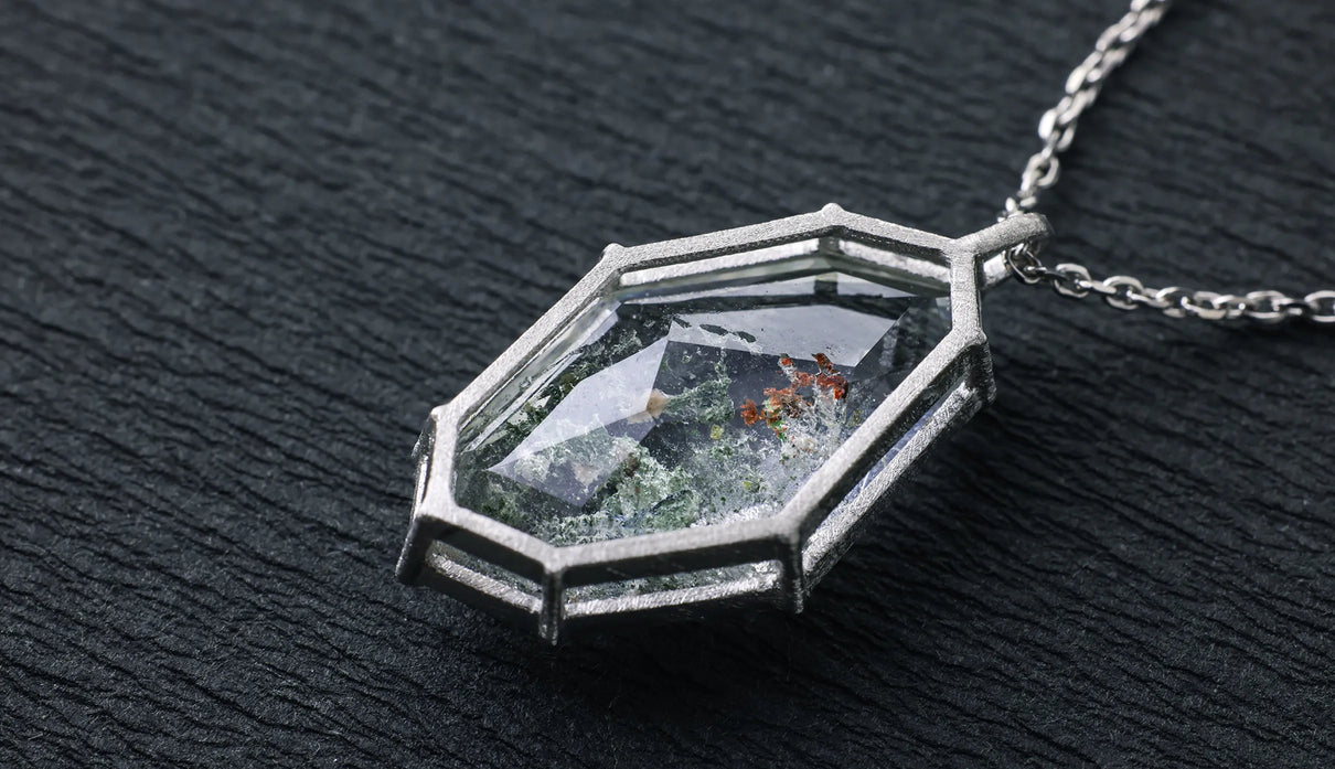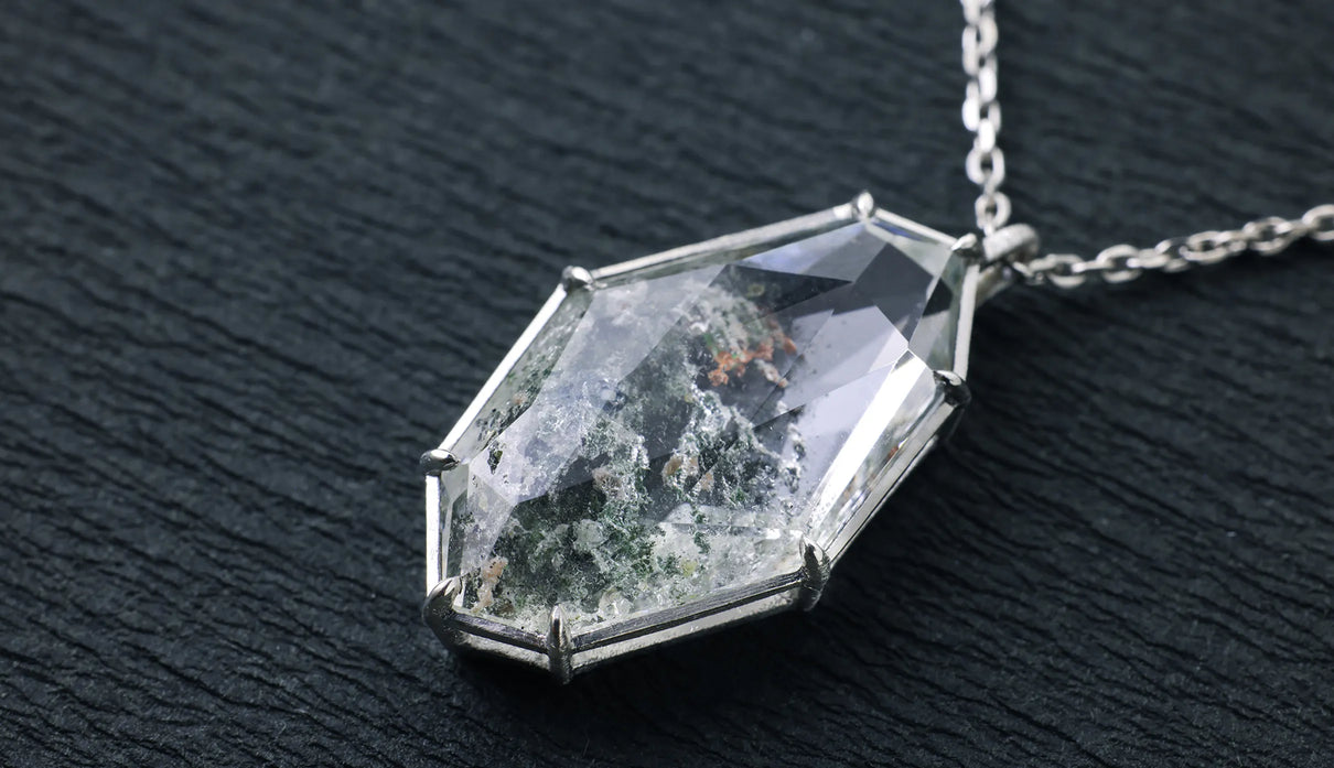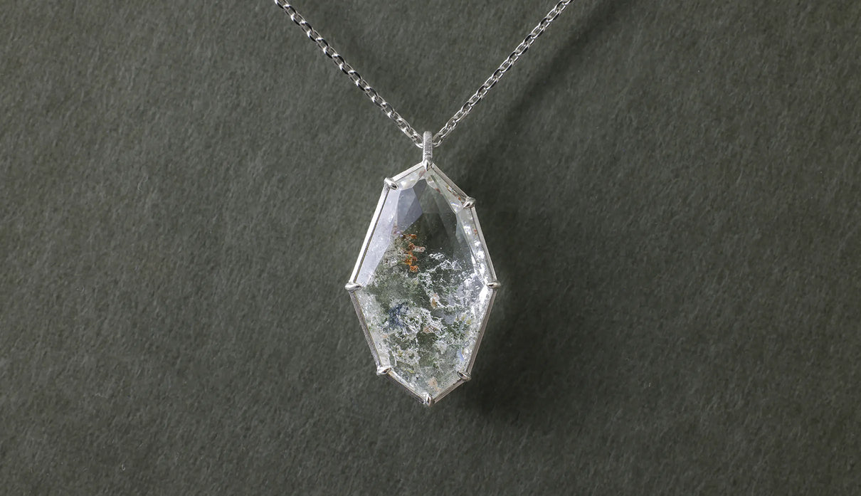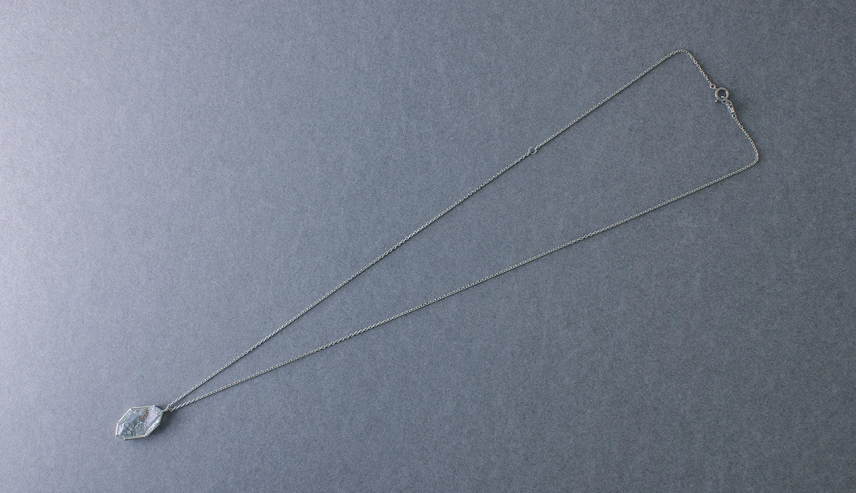 A one-of-a-kind garden quartz necklace featuring hand-polished cutting by gem polisher Canna Oshiro. Within the highly transparent quartz, soft white mist drifts gently, while pale greens and reds overlap quietly. The stone holds a depth of scenery, reminiscent of peering into the clear bottom of a river. From a large raw crystal, the most beautifully balanced piece was carefully selected and cut, with delicate facets engraved to reveal a pure, composed brilliance rather than sharp sparkle when touched by light. The necklace is crafted with a light platinum frame that gently embraces the stone. Like wearing a single landscape, this necklace quietly breathes a serene depth every time the eye falls upon it.