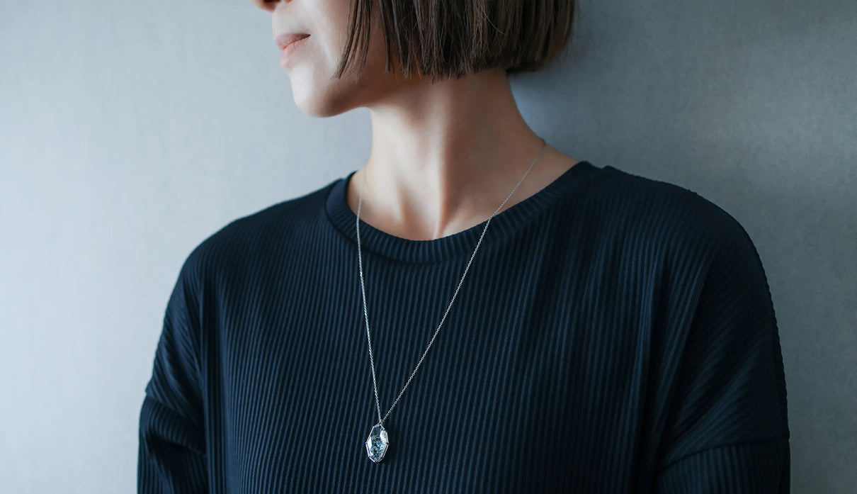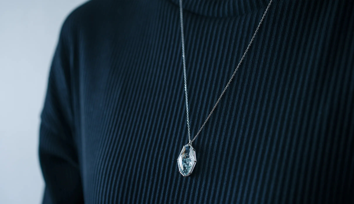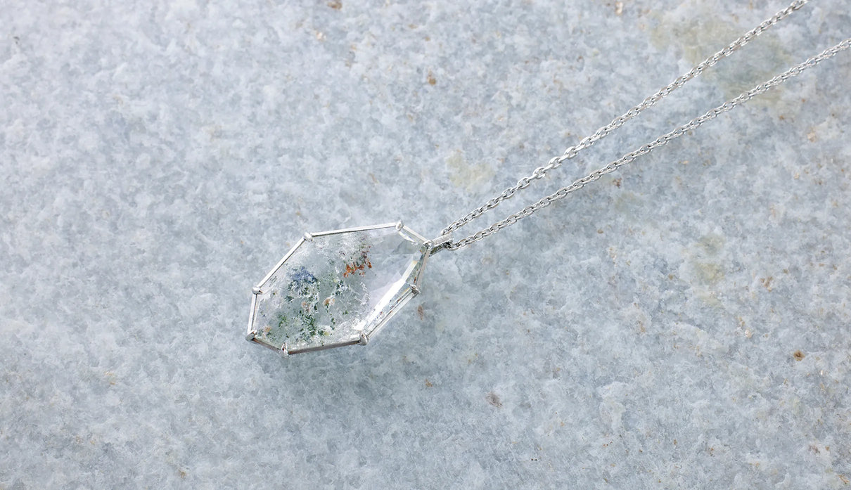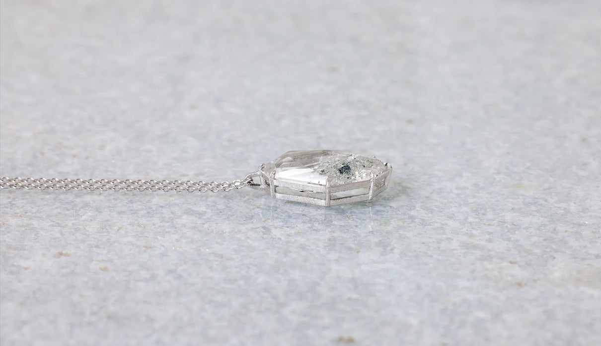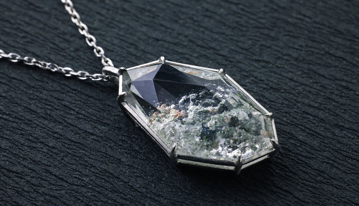 A one-of-a-kind garden quartz necklace featuring hand-polished cutting by gem polisher Canna Oshiro. Within the highly transparent quartz, soft white mist drifts gently, while pale greens and reds overlap quietly. The stone holds a depth of scenery, reminiscent of peering into the clear bottom of a river. From a large raw crystal, the most beautifully balanced piece was carefully selected and cut, with delicate facets engraved to reveal a pure, composed brilliance rather than sharp sparkle when touched by light. The necklace is crafted with a light platinum frame that gently embraces the stone. Like wearing a single landscape, this necklace quietly breathes a serene depth every time the eye falls upon it.
