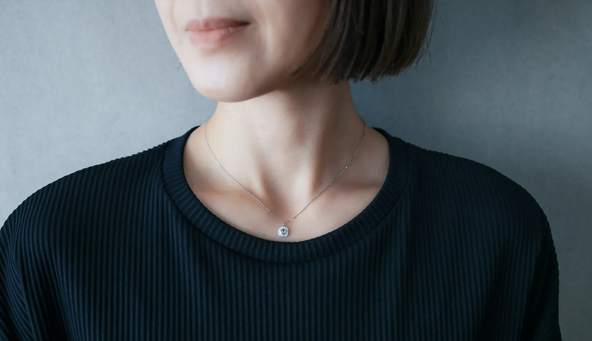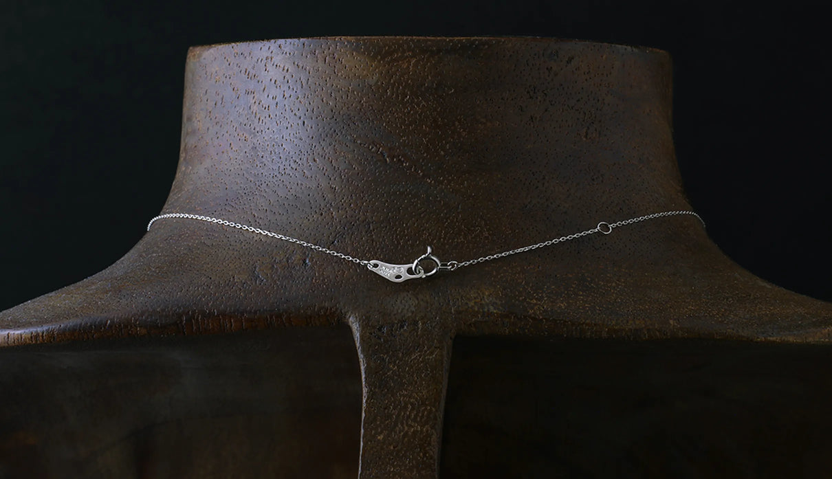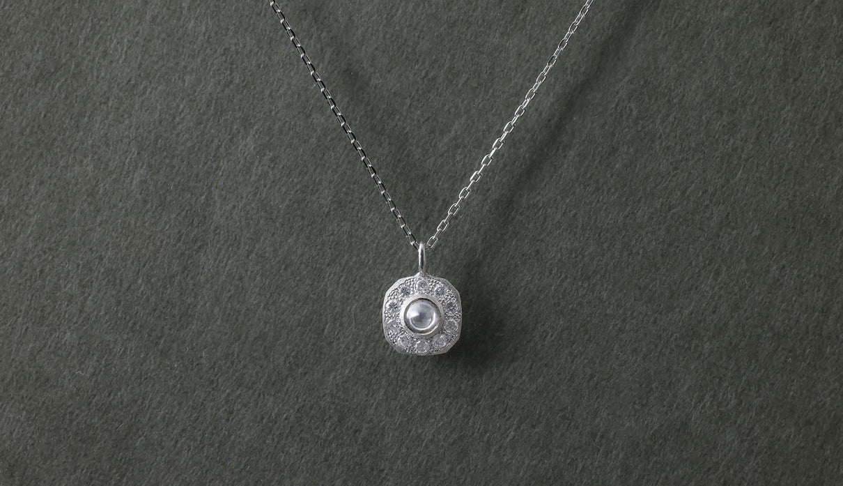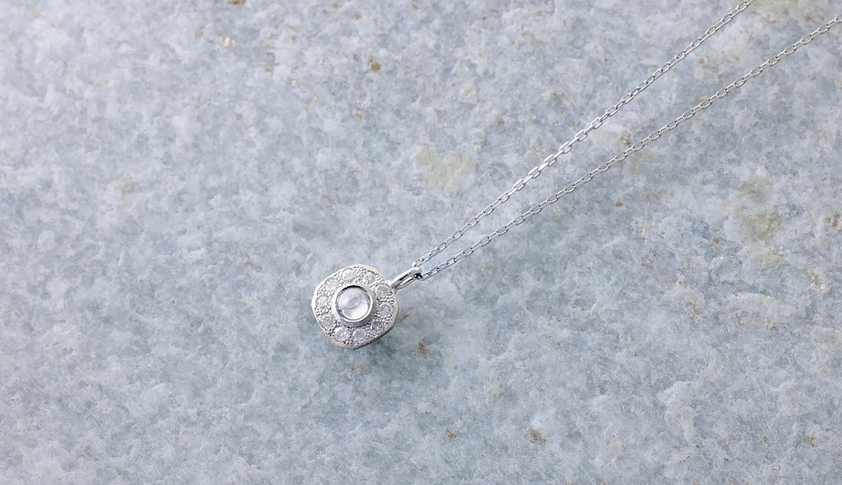 A one-of-a-kind necklace featuring a cabochon-cut clear diamond with a domed surface. Imparting this gentle curvature to the hardest material on Earth requires extremely precise polishing techniques. Expert craftsmanship renders the light within the stone three-dimensionally, creating an expression reminiscent of dripping water. The design is simple, yet subtle undulations along the outline allow the stone's presence to emerge naturally. Milky ice-colored diamonds surrounding the main stone add a soft cohesion and poised brilliance to the piece. A necklace that quietly accompanies daily life while imparting a refined presence at the neckline.