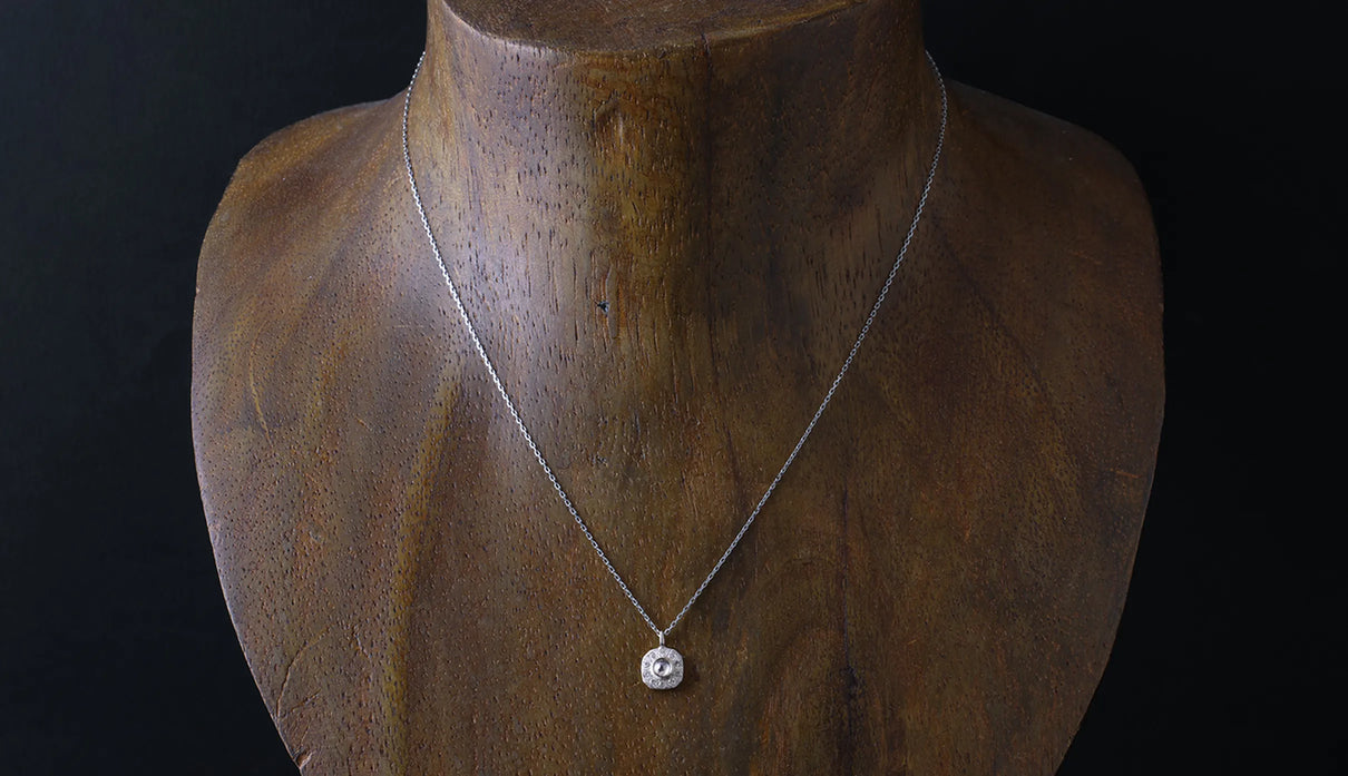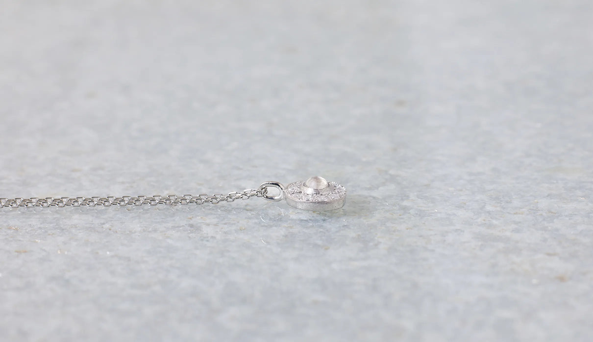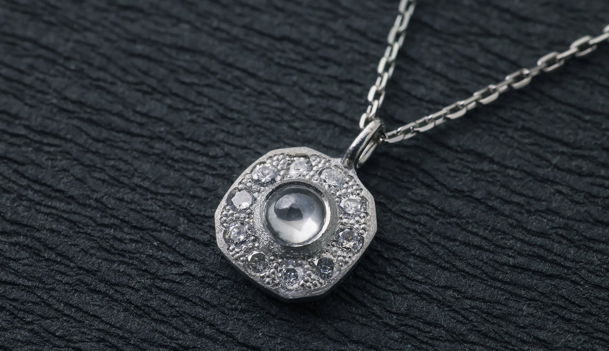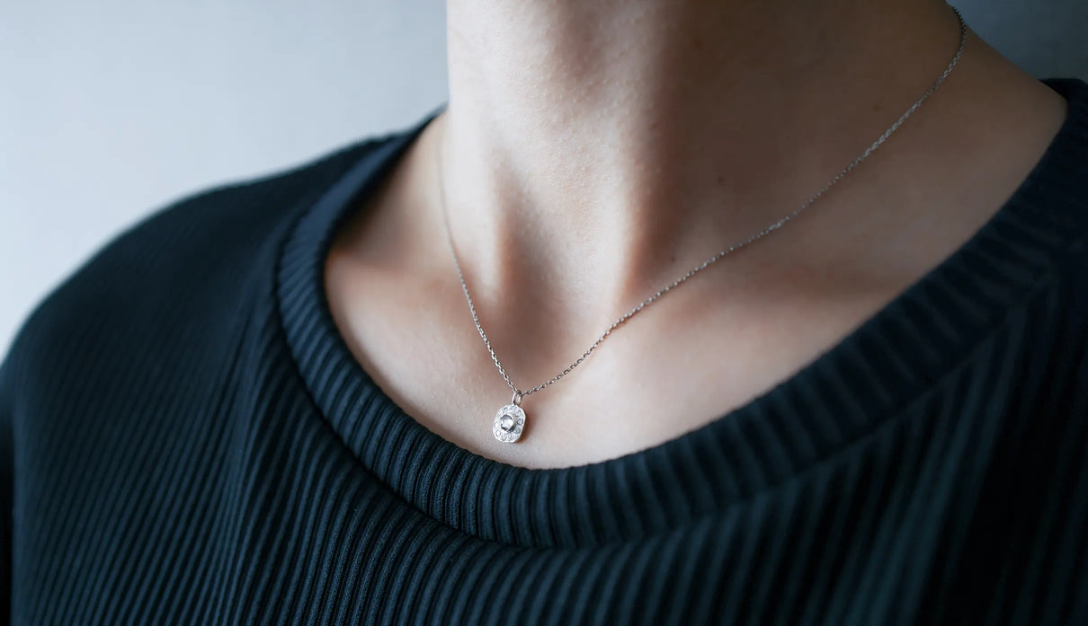 A one-of-a-kind necklace featuring a cabochon-cut clear diamond with a domed surface. Imparting this gentle curvature to the hardest material on Earth requires extremely precise polishing techniques. Expert craftsmanship renders the light within the stone three-dimensionally, creating an expression reminiscent of dripping water. The design is simple, yet subtle undulations along the outline allow the stone's presence to emerge naturally. Milky ice-colored diamonds surrounding the main stone add a soft cohesion and poised brilliance to the piece. A necklace that quietly accompanies daily life while imparting a refined presence at the neckline.