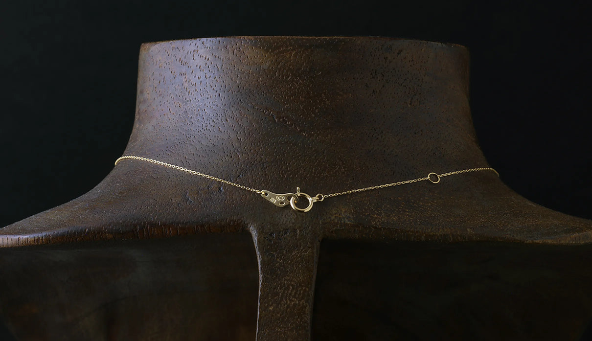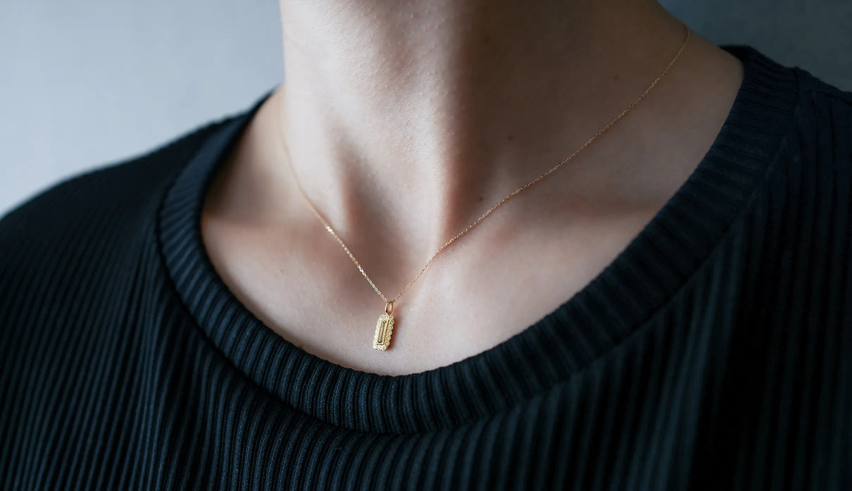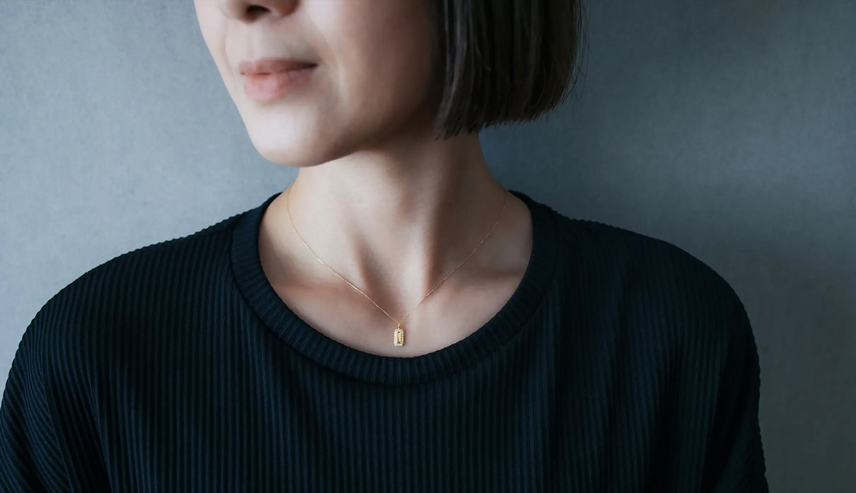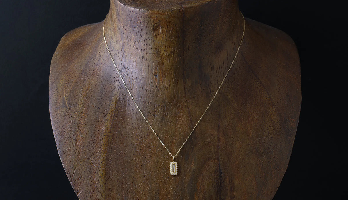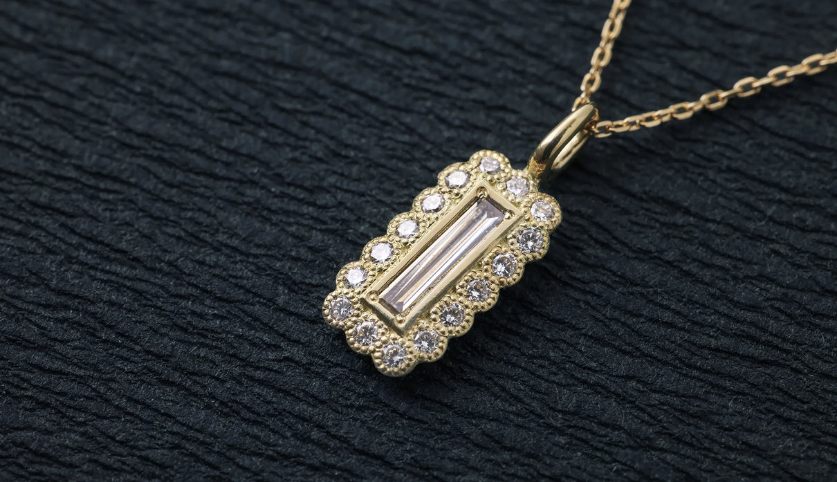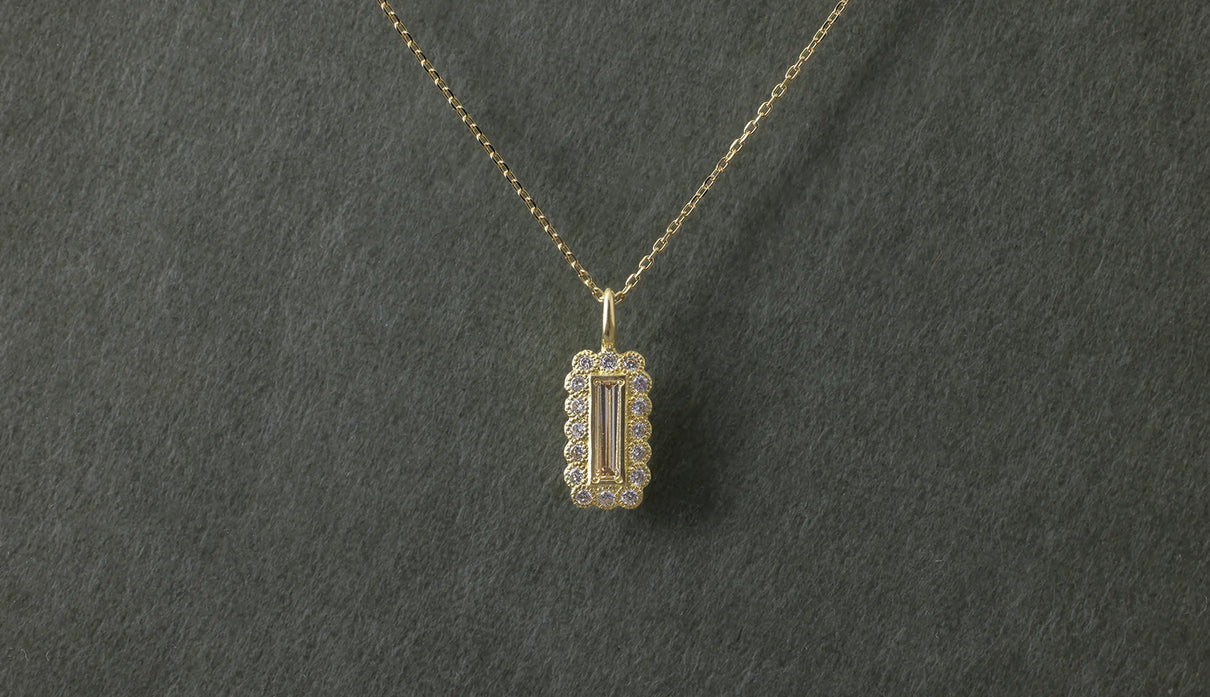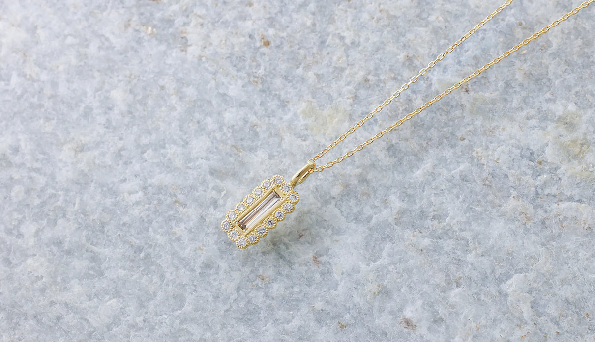 A one-of-a-kind necklace featuring a delicate baguette-cut light brown diamond at its center. Clear diamonds with fine, linear cuts are framed like a border with melee diamonds and intricate milgrain detailing. The contrast between the sharp brilliance of the central stone and the softly connected outer sparkle creates a charming silhouette while maintaining a classical, sophisticated elegance without being overly sweet. Its subdued radiance rests gently at the neckline, adding a refined touch to everyday attire. Perfect as jewelry to accompany daily life, it also makes a thoughtful gift for a loved one.
