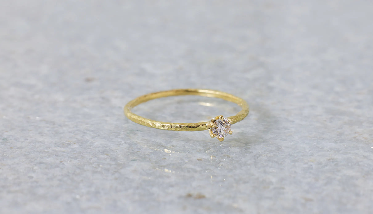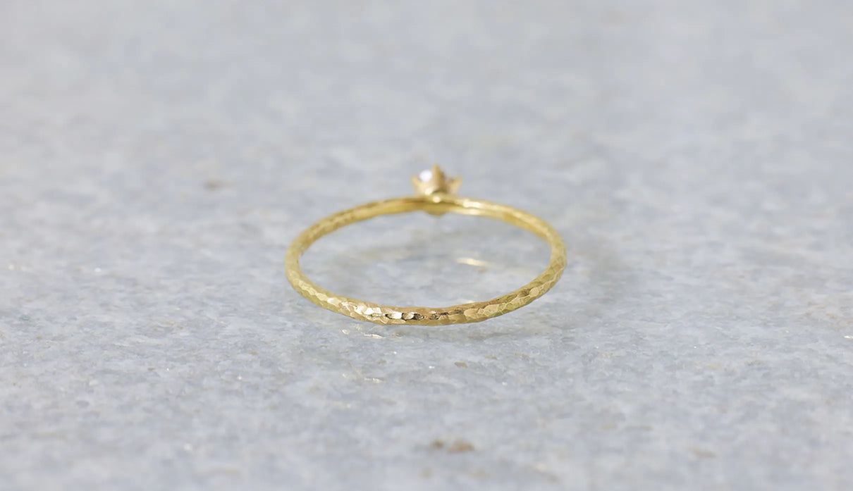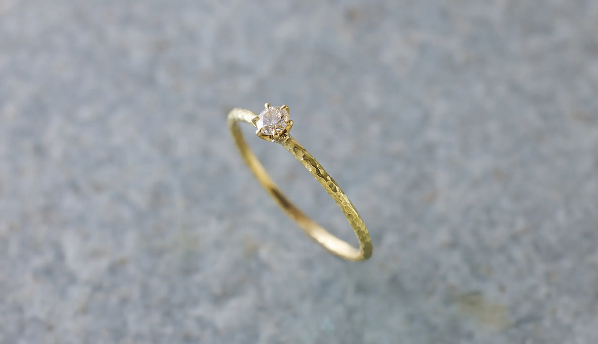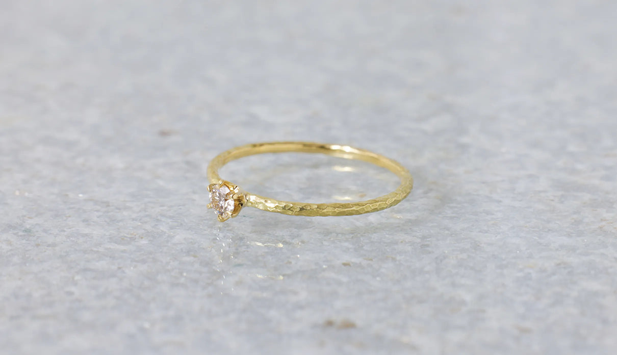 The "Twig" ring set with an extremely light 0.1-carat brown diamond. The slender band, approximately 1mm wide, features very delicate undulations reminiscent of the texture of a small branch. Its design captures the fleeting beauty one might notice in nature. Worn alone, it is understated; when stacked, it subtly changes expression, quietly complementing everyday attire. Ideal as a piece that blends seamlessly into daily life, it also makes a thoughtful gift to be cherished for years to come.