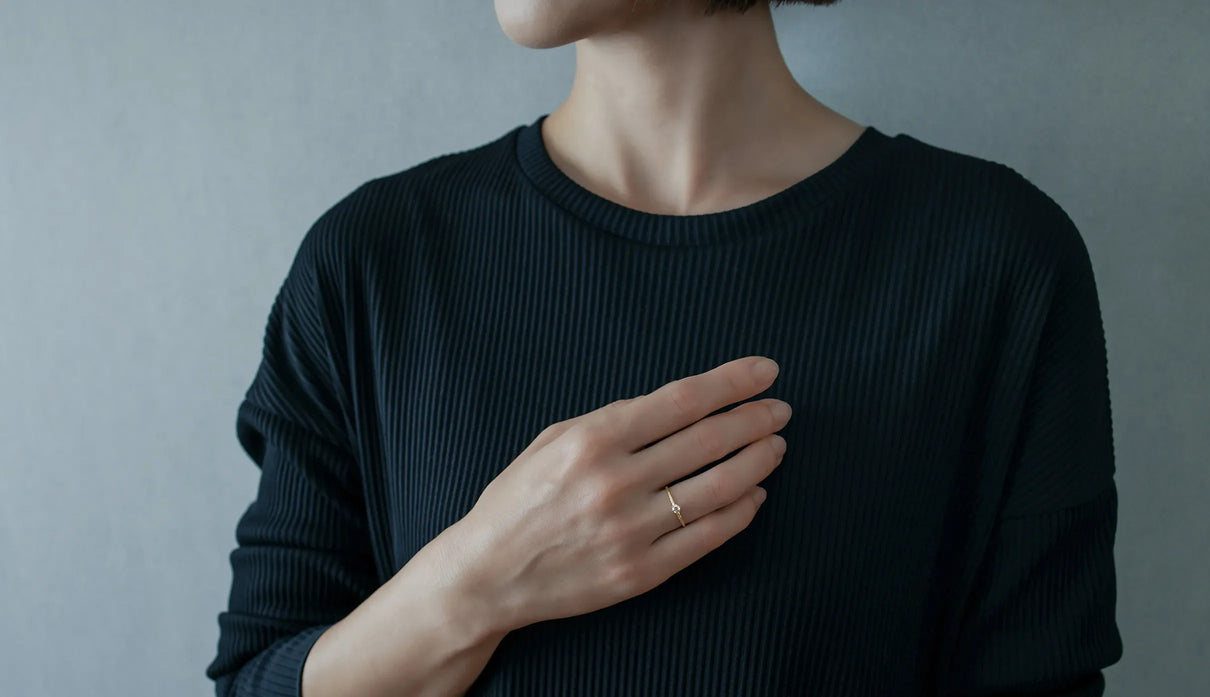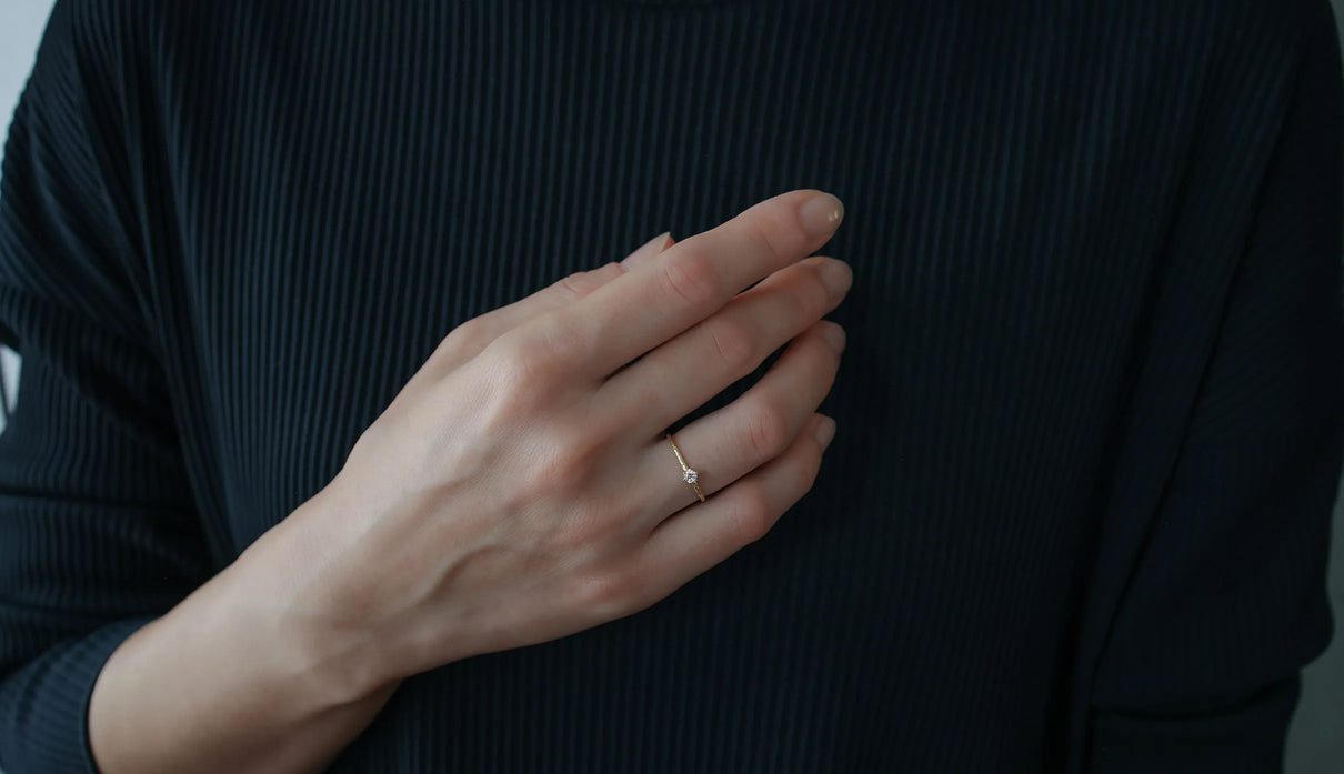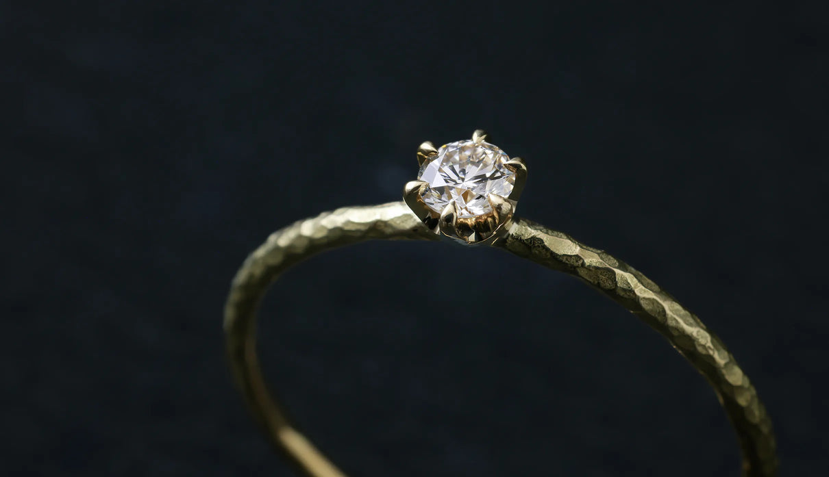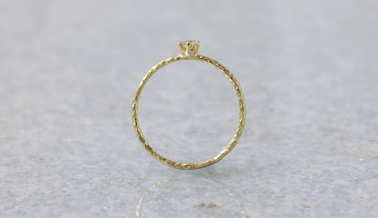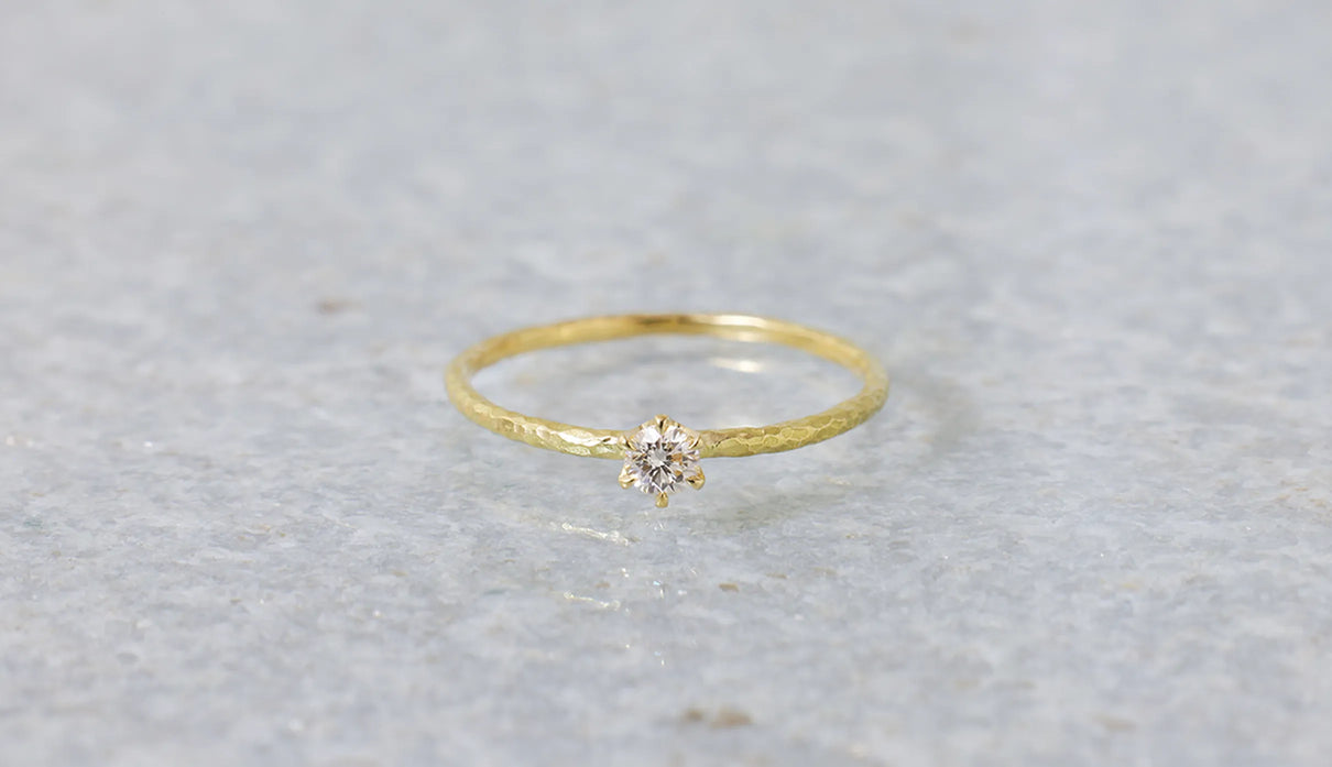 The "Twig" ring set with an extremely light 0.1-carat brown diamond. The slender band, approximately 1mm wide, features very delicate undulations reminiscent of the texture of a small branch. Its design captures the fleeting beauty one might notice in nature. Worn alone, it is understated; when stacked, it subtly changes expression, quietly complementing everyday attire. Ideal as a piece that blends seamlessly into daily life, it also makes a thoughtful gift to be cherished for years to come.