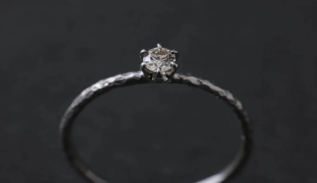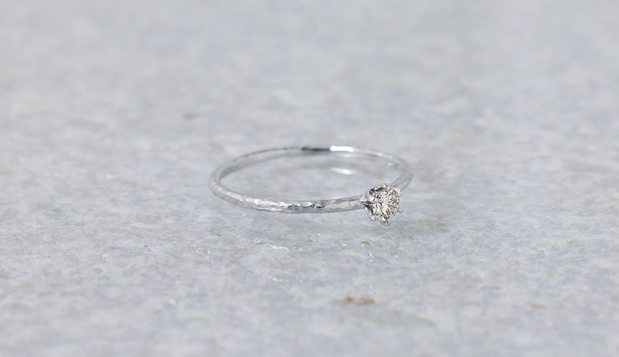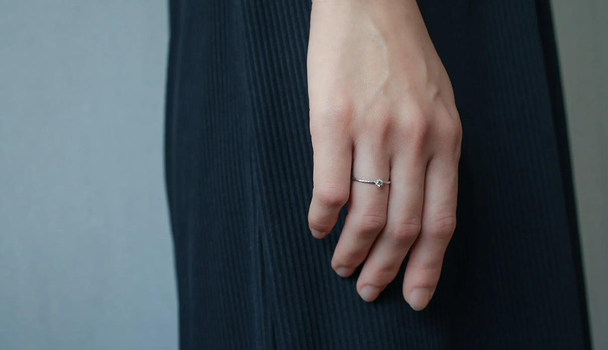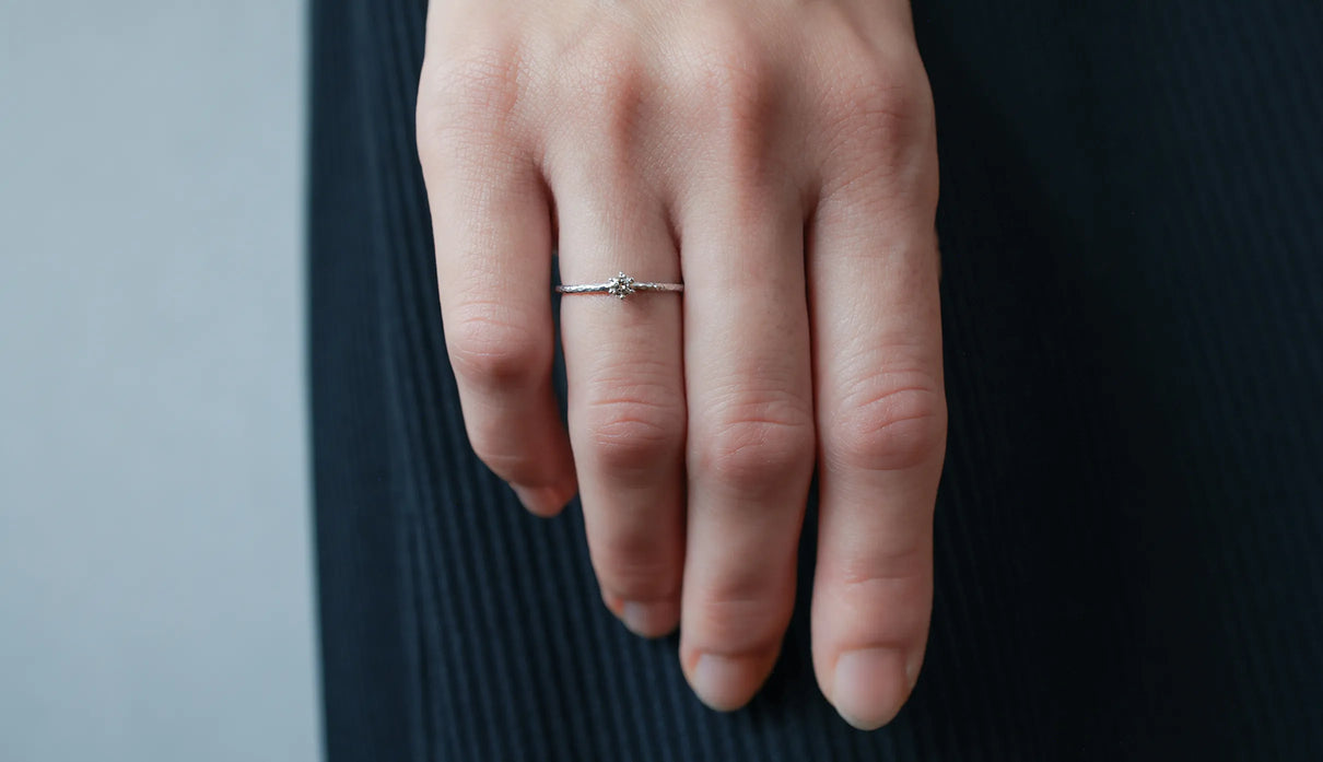 The "Twig" ring set with an extremely light 0.1-carat brown diamond. The slender band, approximately 1mm wide, features very subtle undulations reminiscent of the texture of a small branch. Its design captures the fleeting beauty one might notice in nature. Worn alone, it is understated; when stacked, it subtly changes its expression, quietly complementing everyday outfits. Perfect as a piece that blends seamlessly into daily life, it also makes a thoughtful gift to be cherished for years to come.