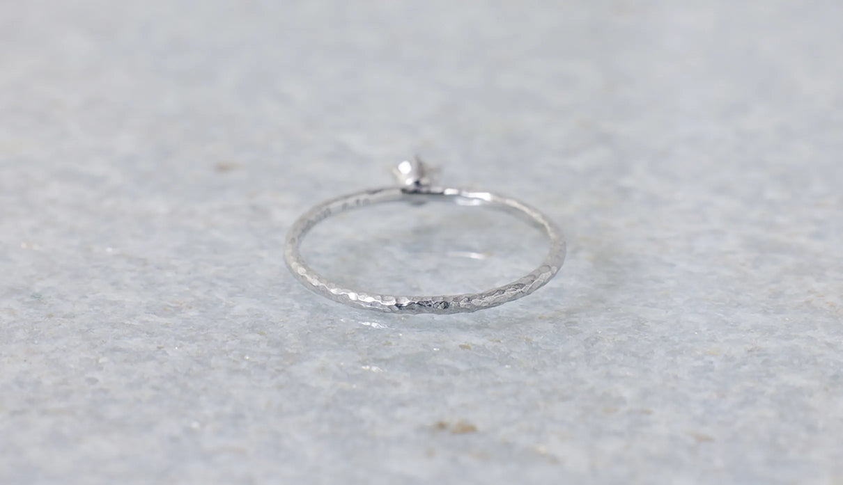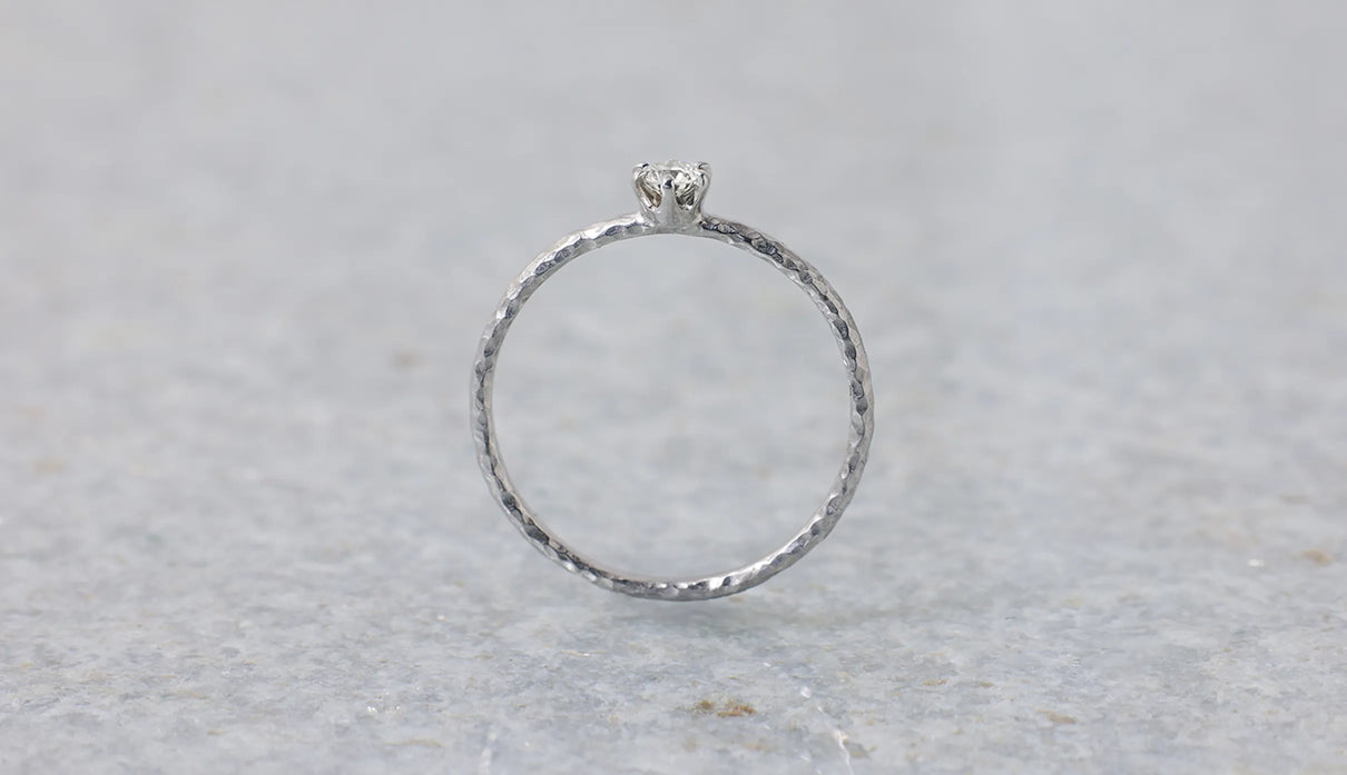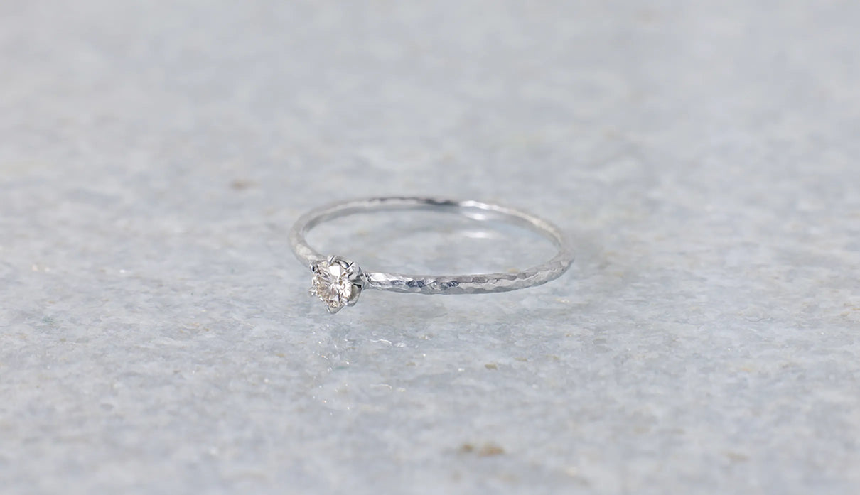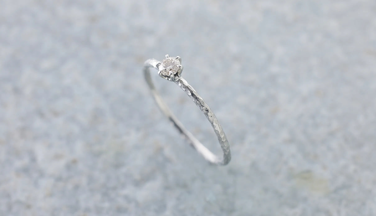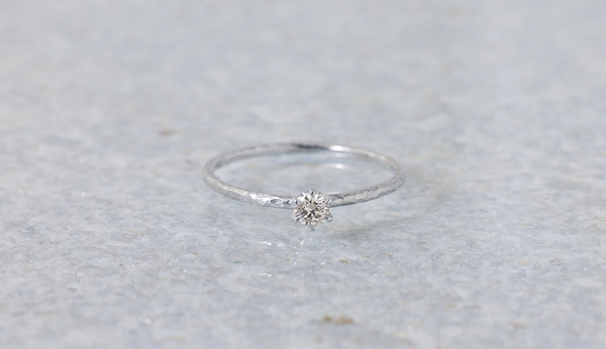 The "Twig" ring set with an extremely light 0.1-carat brown diamond. The slender band, approximately 1mm wide, features very subtle undulations reminiscent of the texture of a small branch. Its design captures the fleeting beauty one might notice in nature. Worn alone, it is understated; when stacked, it subtly changes its expression, quietly complementing everyday outfits. Perfect as a piece that blends seamlessly into daily life, it also makes a thoughtful gift to be cherished for years to come.