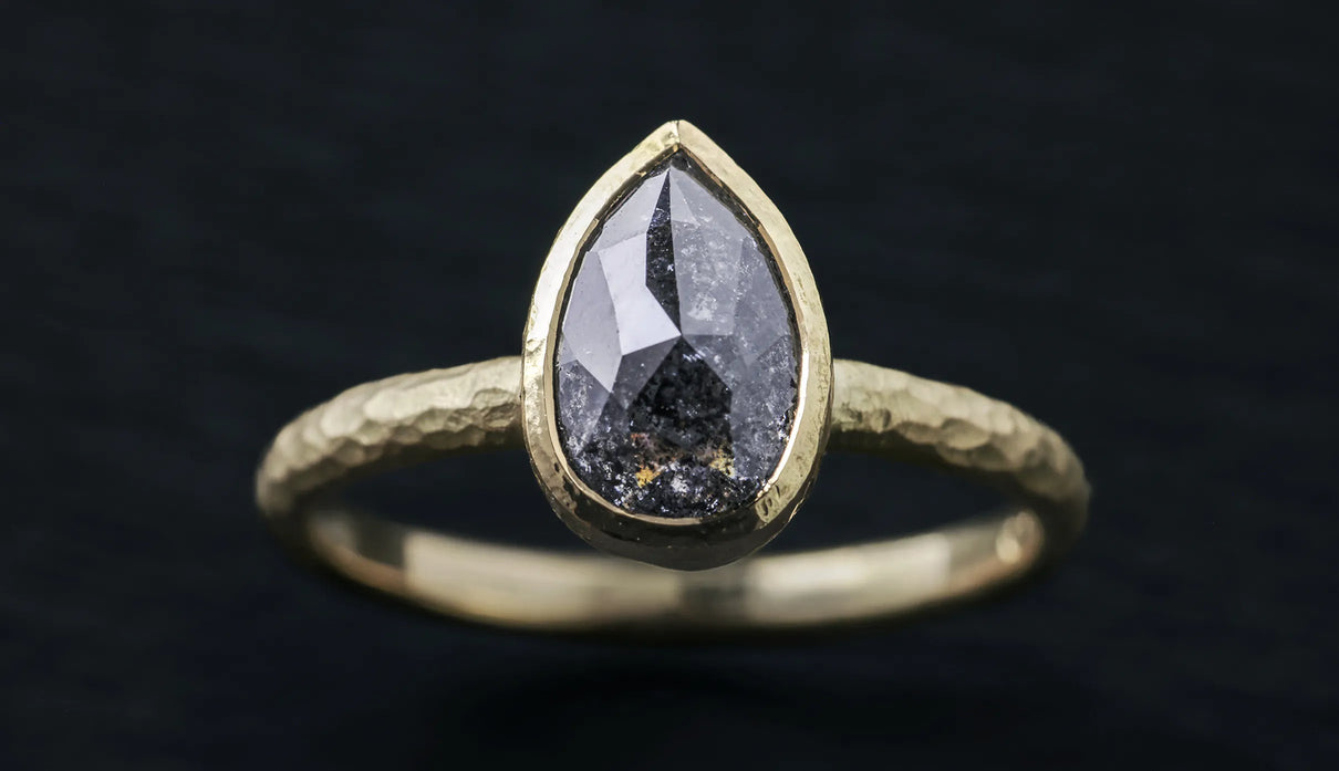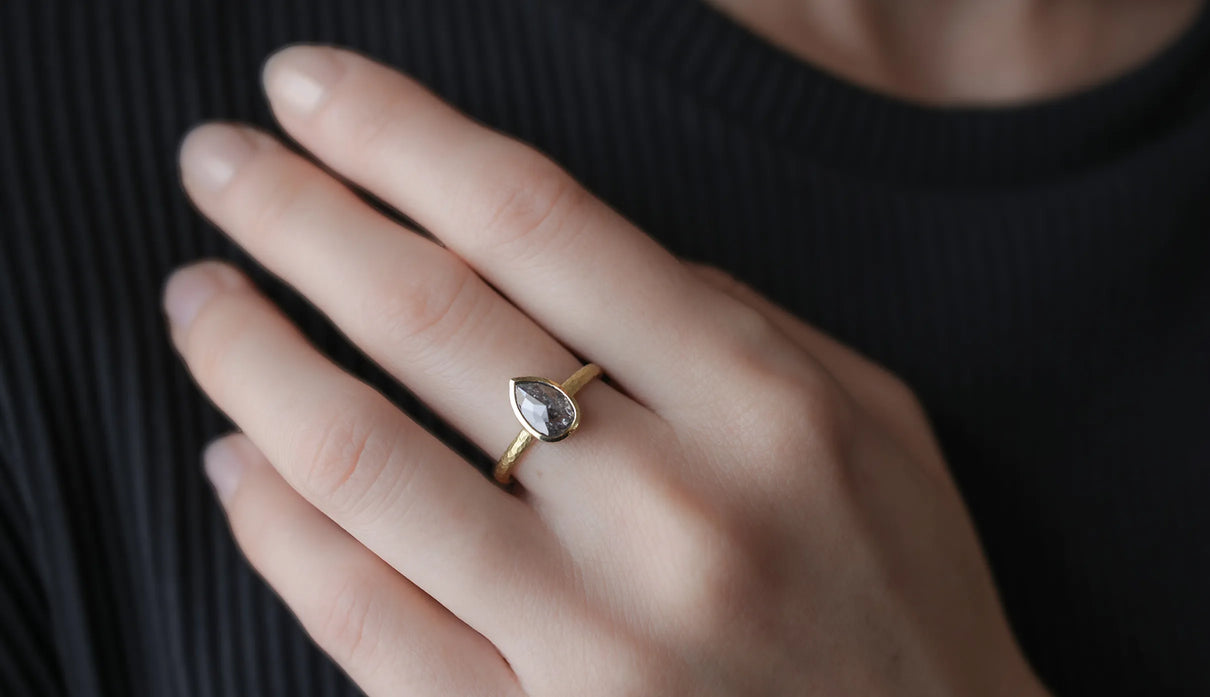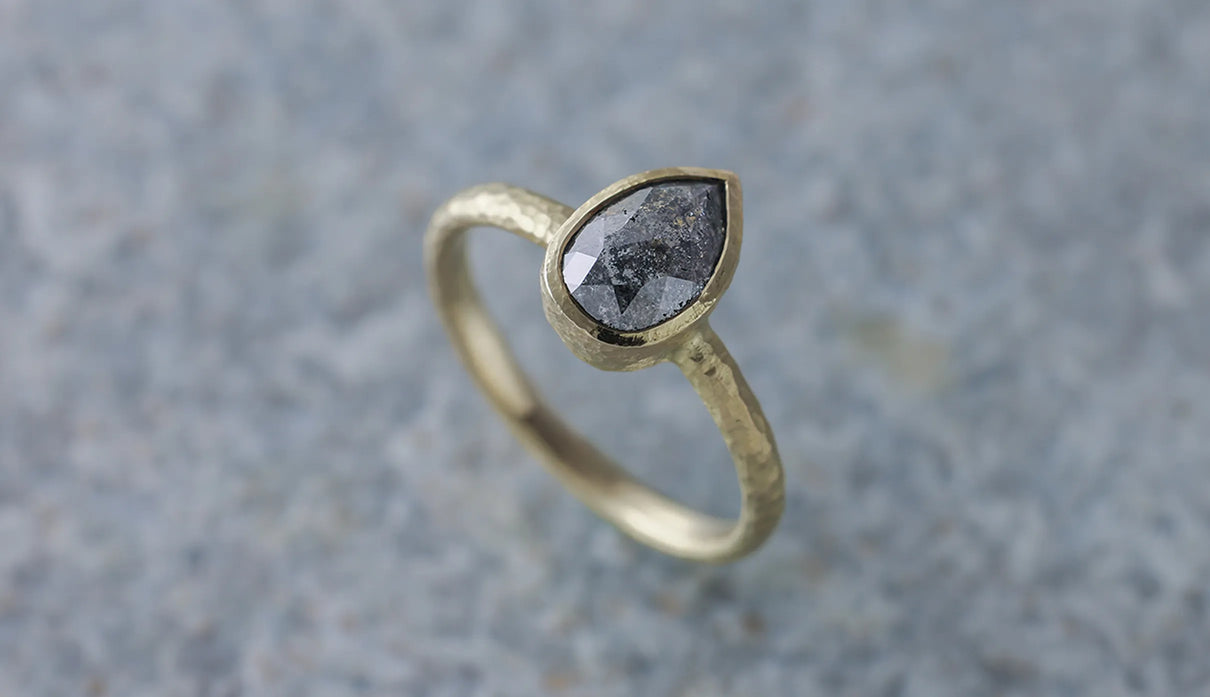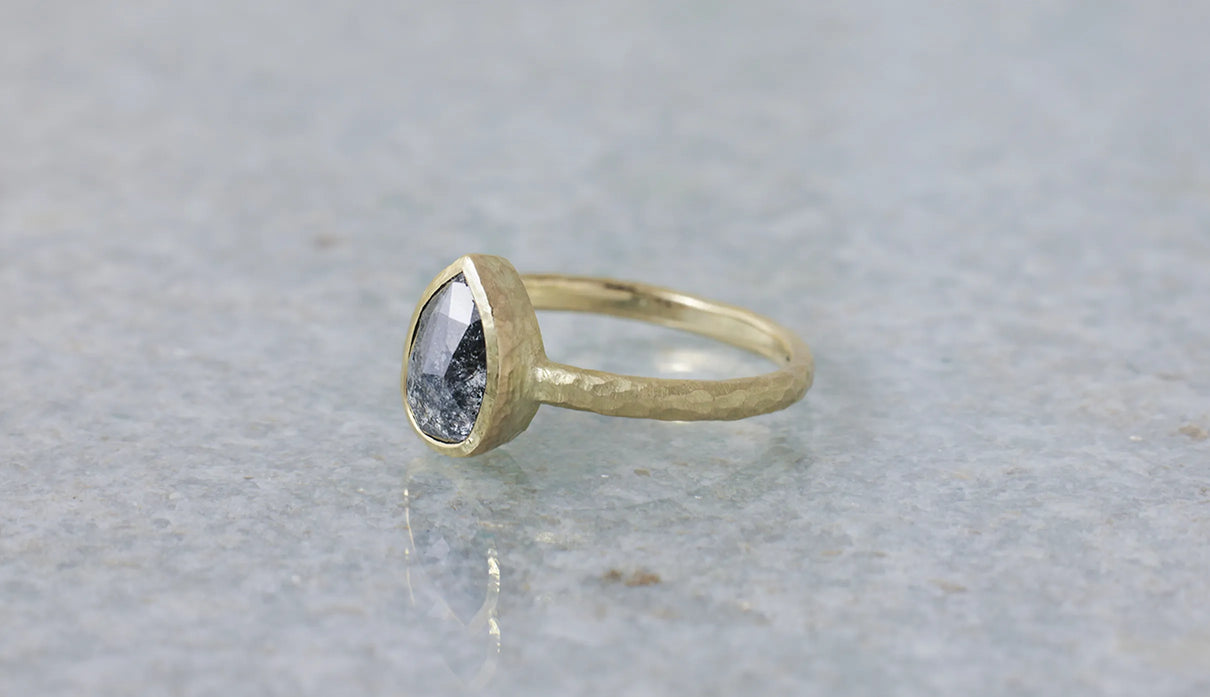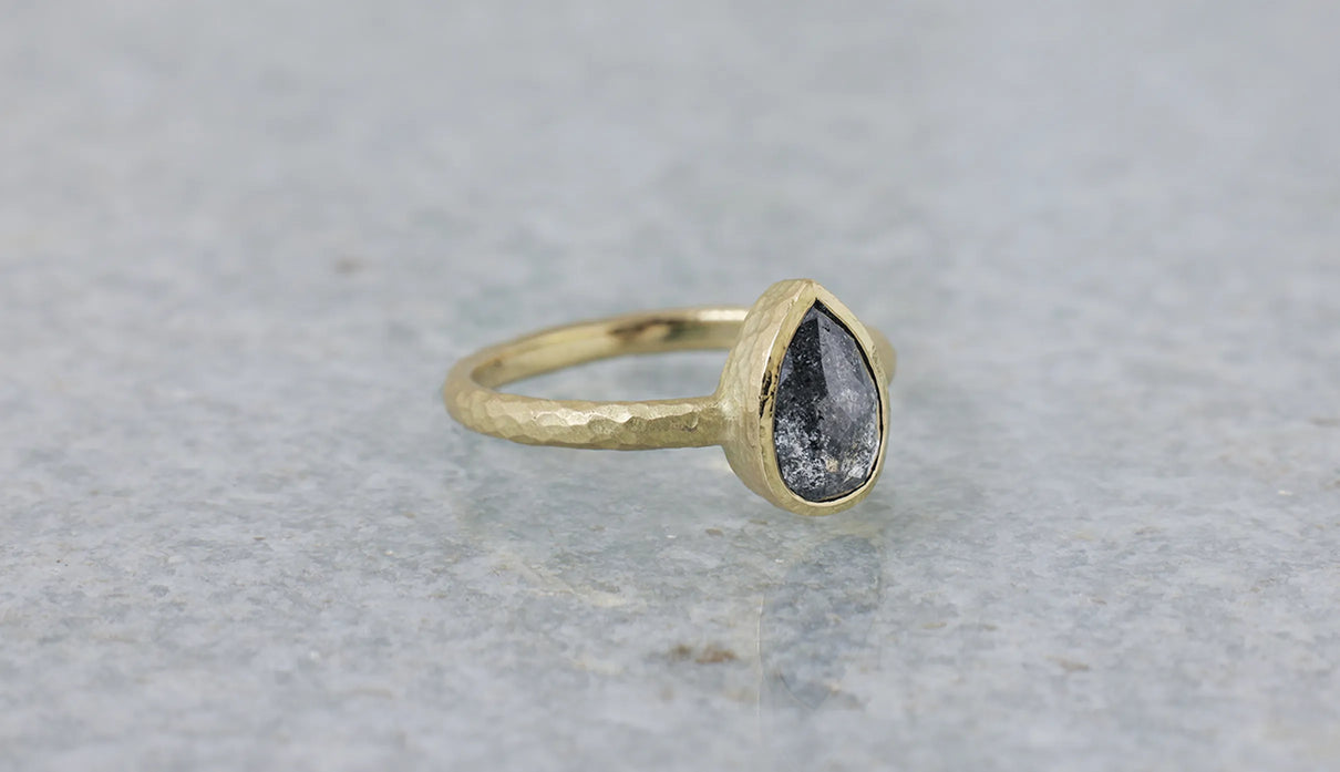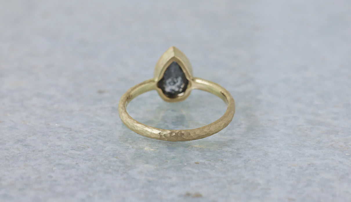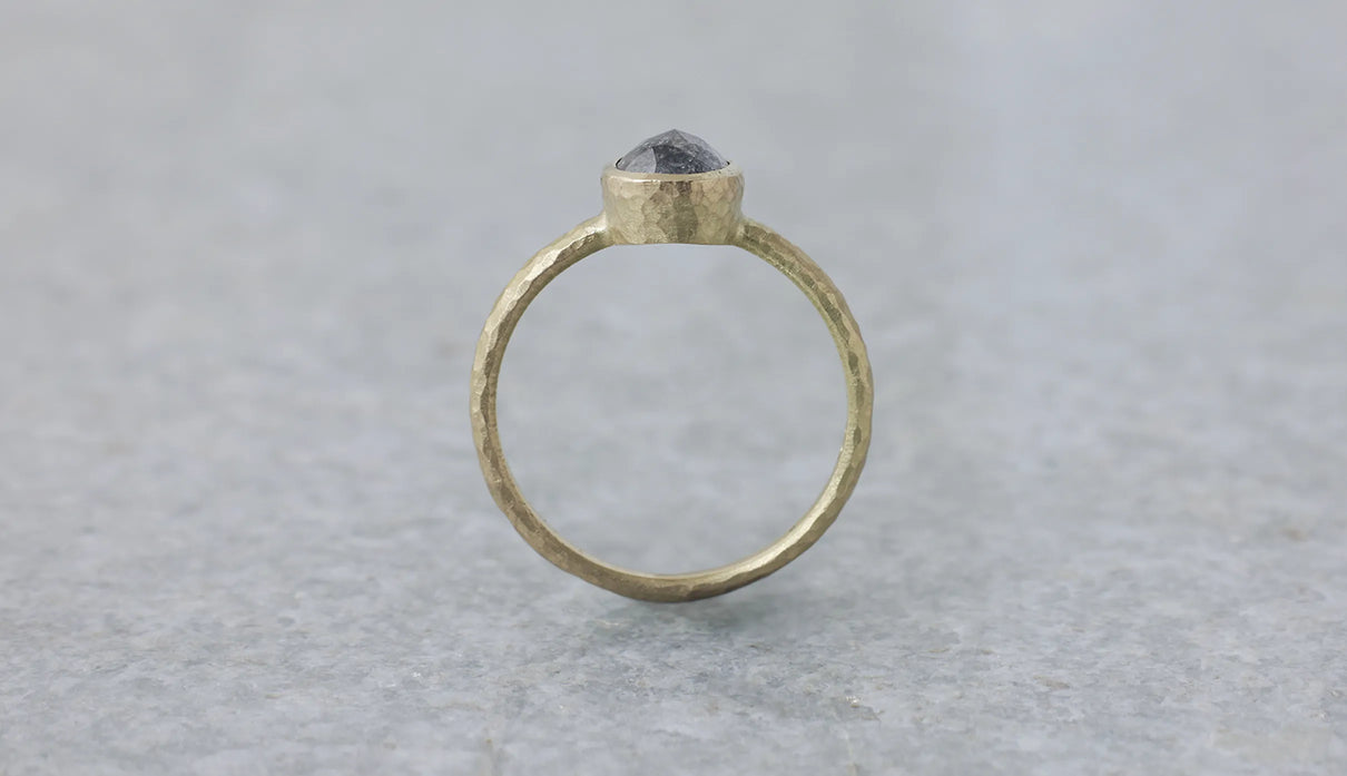 A one-of-a-kind ring crafted with a rose-cut Galaxy Diamond that radiates a dense brilliance. Known as a "Galaxy" diamond, it contains intricate inclusions reminiscent of outer space, capturing light with remarkable intensity. The subtle play of shadows and sparkle within the stone shifts quietly depending on the angle, creating a mesmerizing effect. The ring is designed with minimal adornment to highlight the presence of the stone. A touch of hammering on the K18 yellow gold surface subtly preserves the artisanal texture. A unique, one-of-a-kind ring that holds deep radiance within its serene beauty.