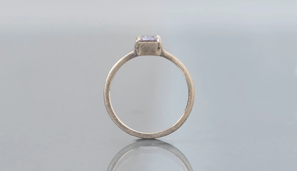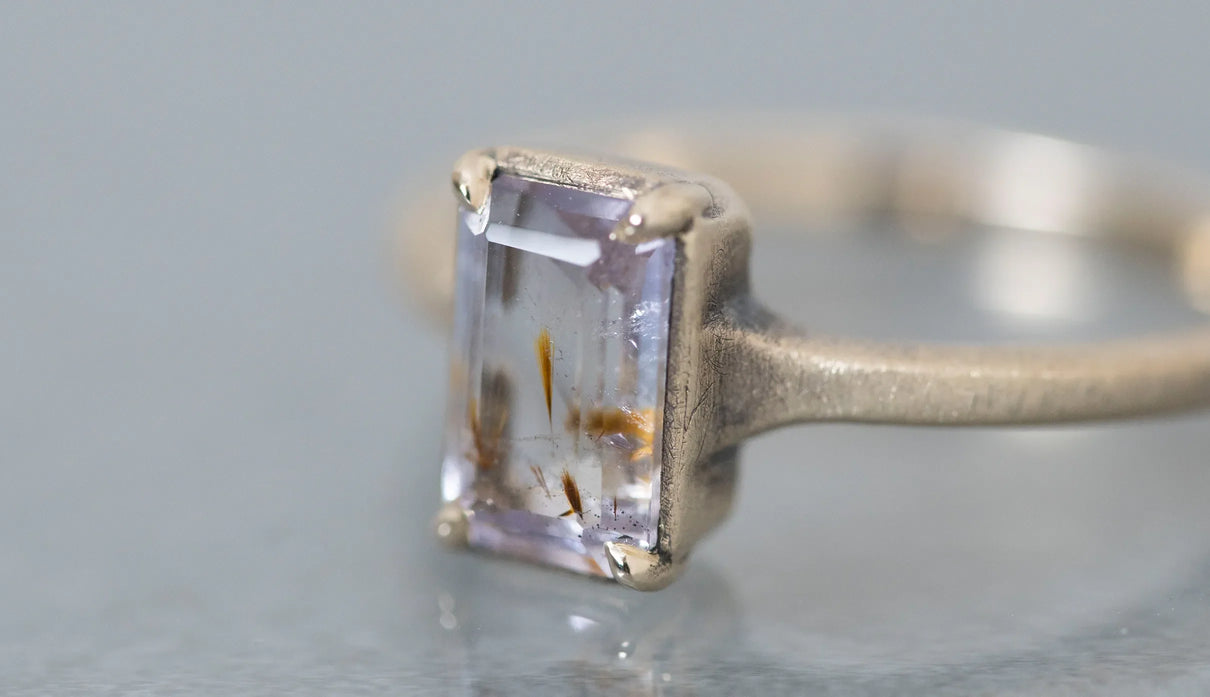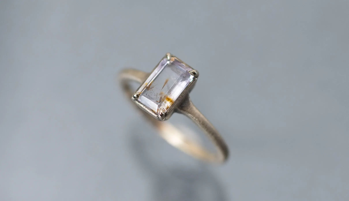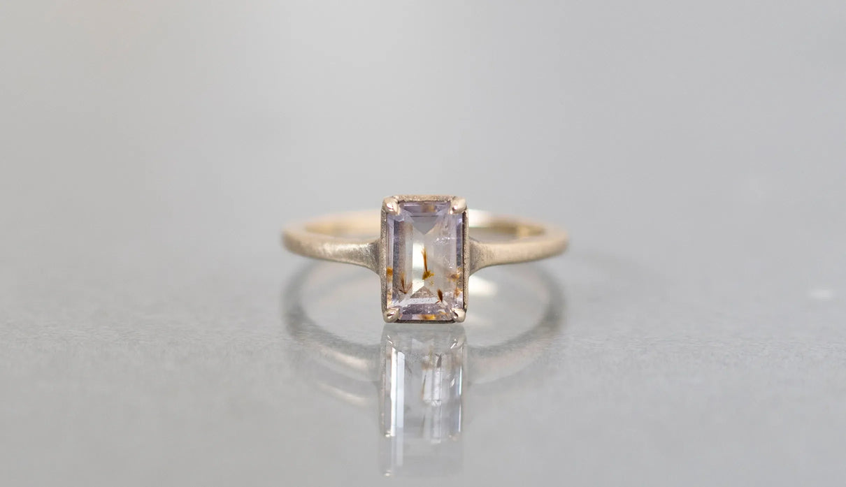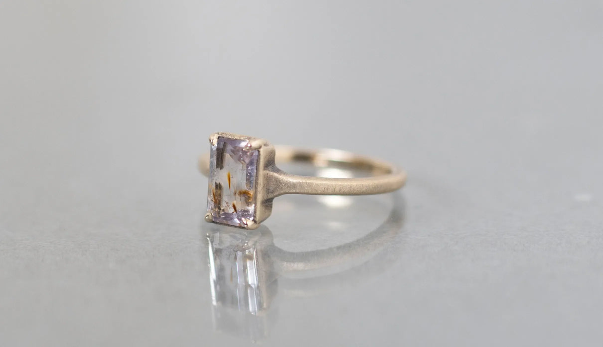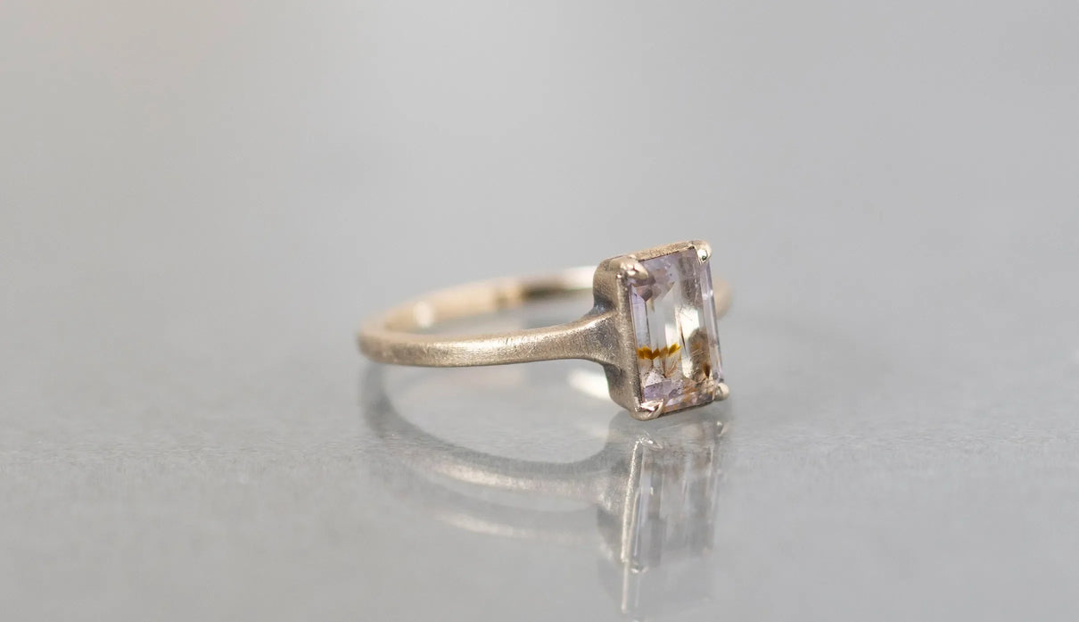 A one-of-a-kind ring set with a geosite-in-amethyst. Within the soft purple crystal, orange-brown inclusions spread like delicate feathers, creating a miniature landscape with a sense of depth. The ring features a slim, refined line that naturally blends with everyday wear, adding a subtle touch of individuality to the fingertip. It's as if you are gently wearing a tiny glimmer—an intimate little landscape that accompanies your daily life.