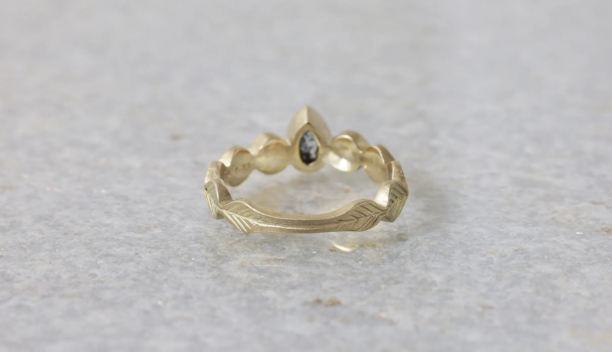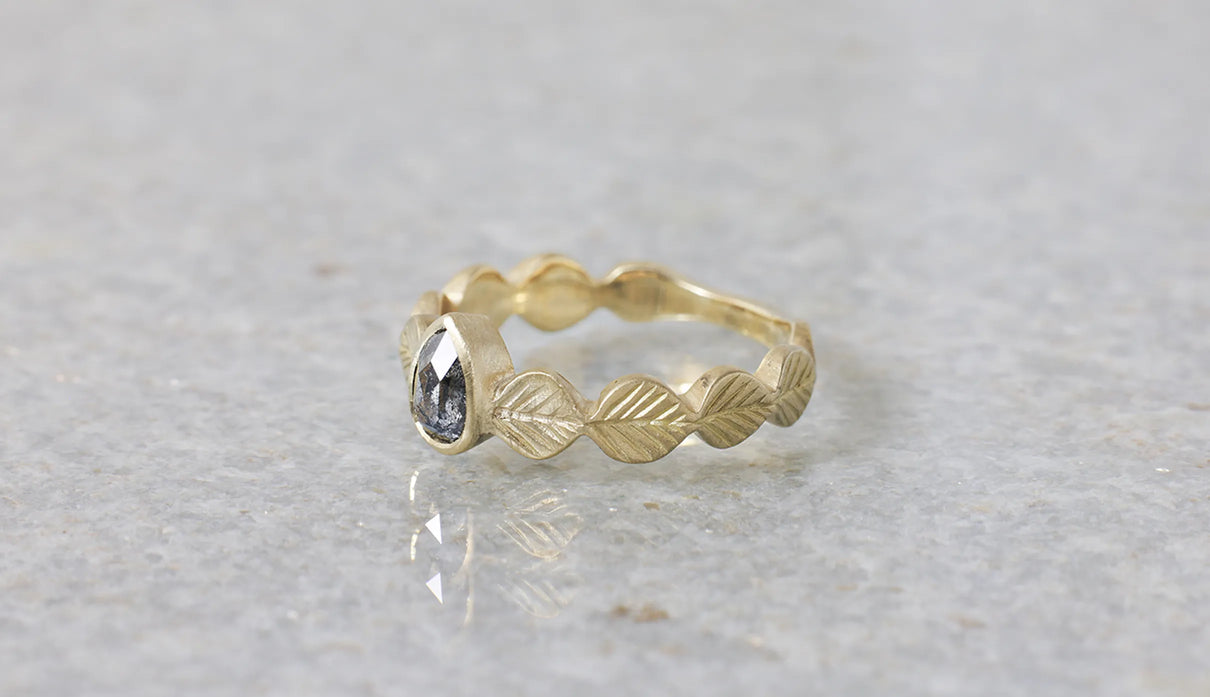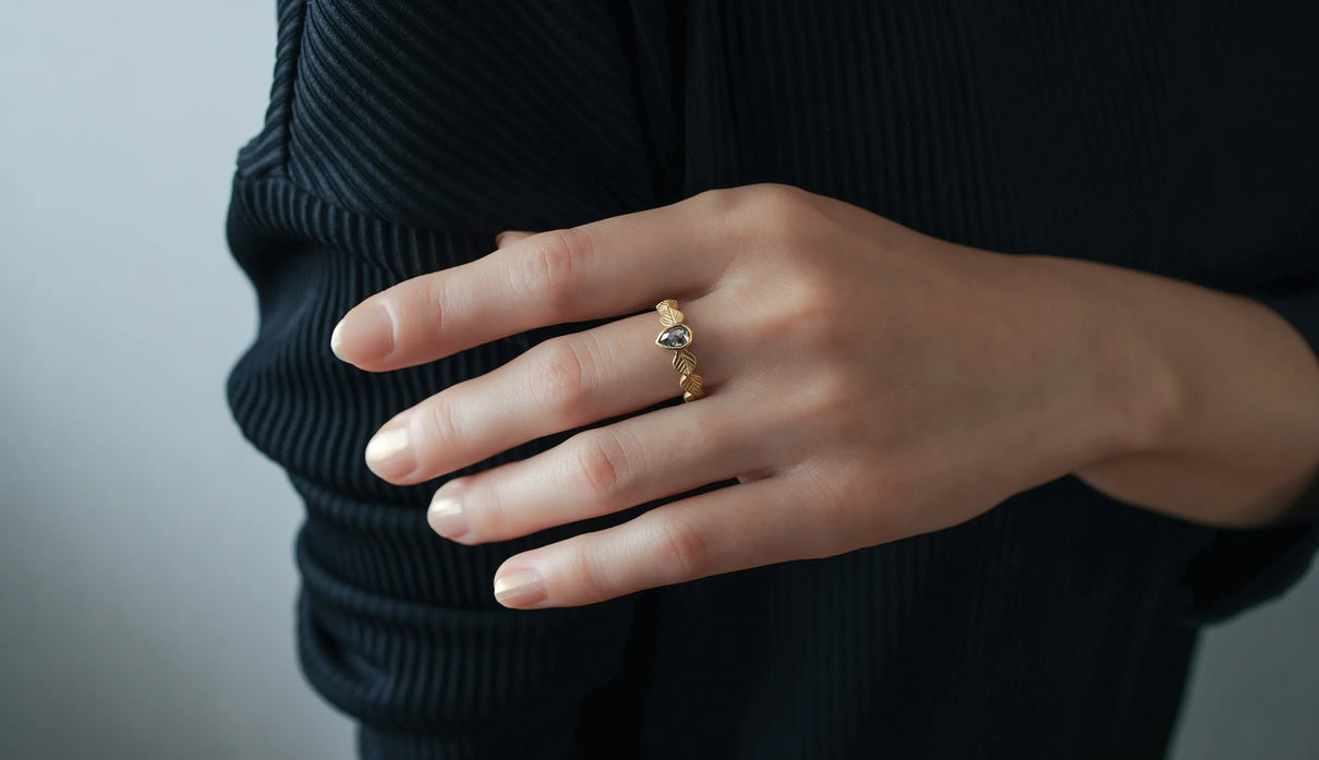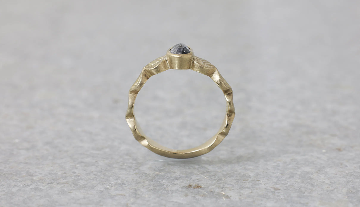 A one-of-a-kind ring from the "Leaf" series, inspired by multiple overlapping leaves, each crafted with a subtly unique expression that adds a playful touch. At the center is a rose-cut galaxy diamond, renowned for its high-density sparkle. Known as a "galaxy" diamond, it contains intricate inclusions reminiscent of the cosmos, capturing light with remarkable intensity. The hand-carved leaves are finished with a matte texture, creating a harmonious balance that enhances the diamond's radiant brilliance. Designed to stand out on its own, the ring brings understated glamour to everyday wear while elevating special occasions and outfits with a sense of quiet wonder.