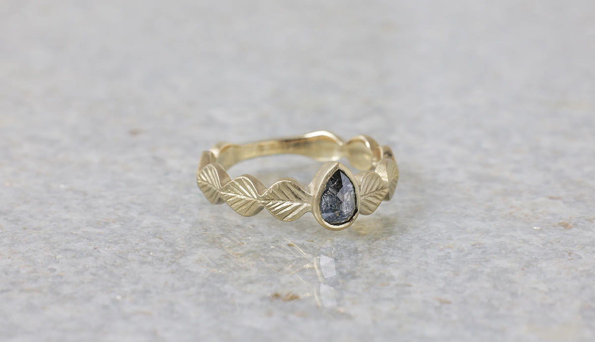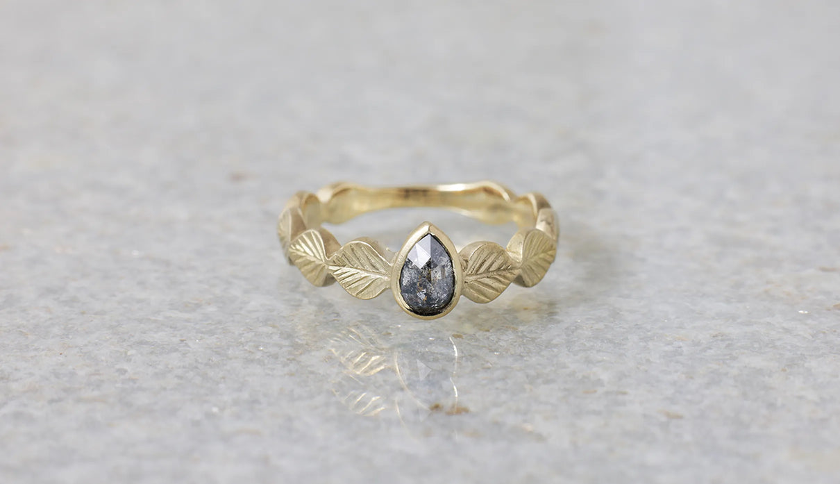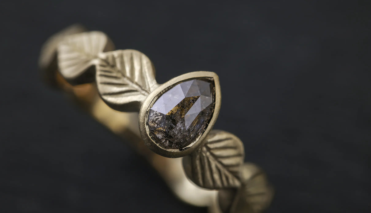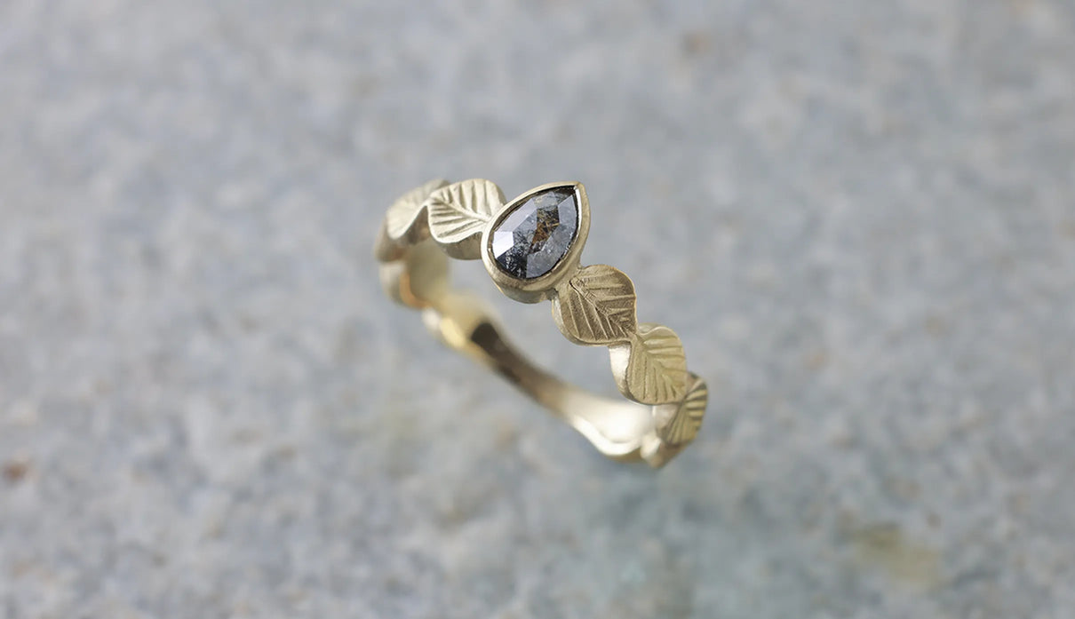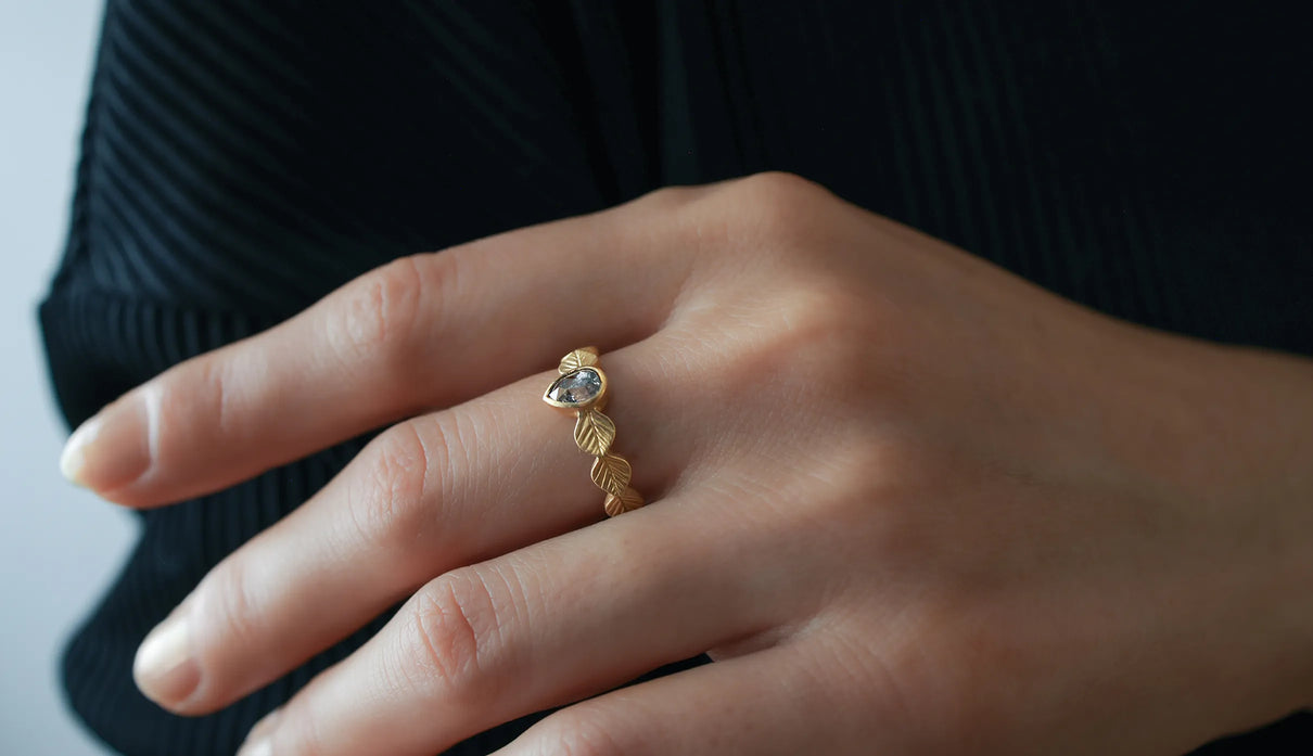A one-of-a-kind ring from the "Leaf" series, inspired by multiple overlapping leaves, each crafted with a subtly unique expression that adds a playful touch. At the center is a rose-cut galaxy diamond, renowned for its high-density sparkle. Known as a "galaxy" diamond, it contains intricate inclusions reminiscent of the cosmos, capturing light with remarkable intensity. The hand-carved leaves are finished with a matte texture, creating a harmonious balance that enhances the diamond's radiant brilliance. Designed to stand out on its own, the ring brings understated glamour to everyday wear while elevating special occasions and outfits with a sense of quiet wonder.