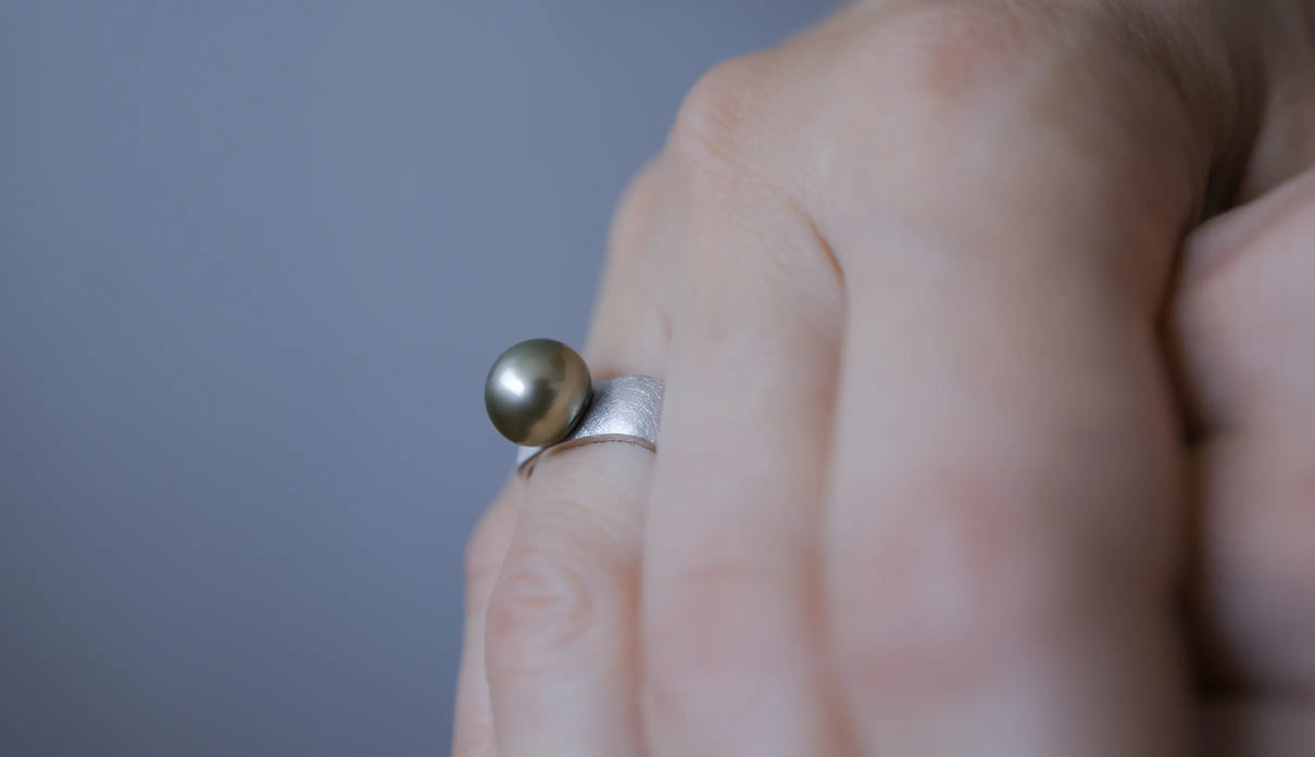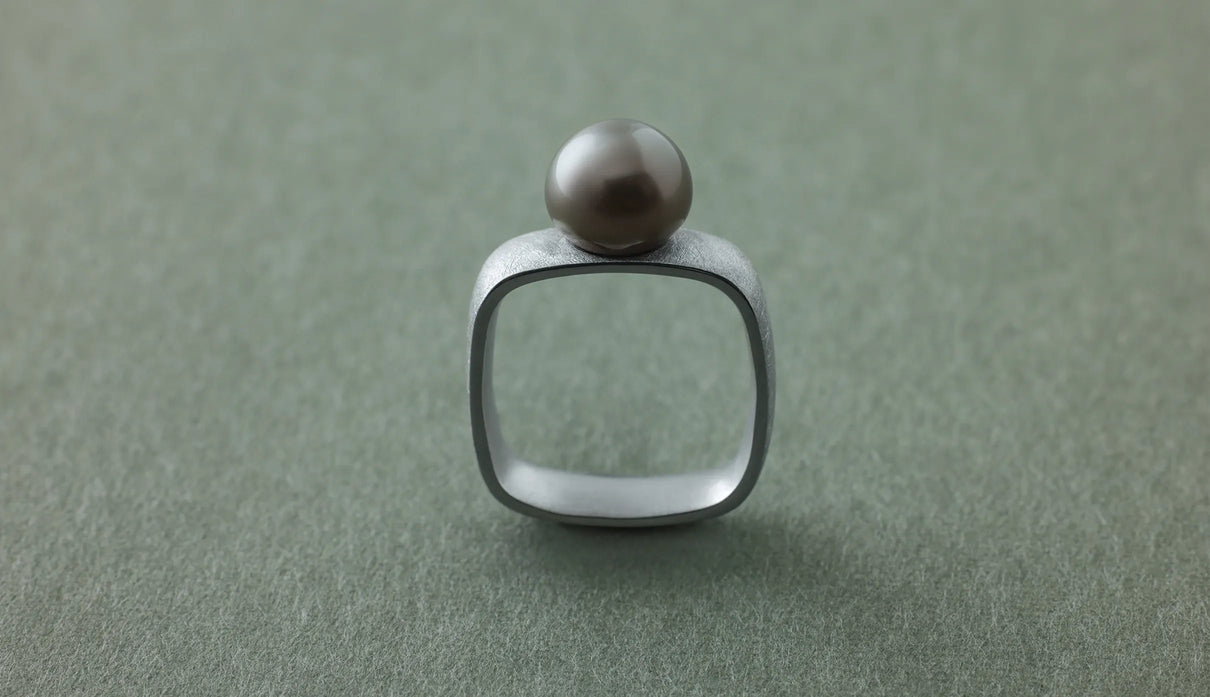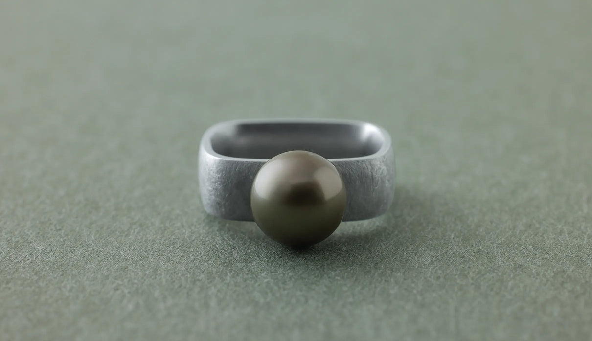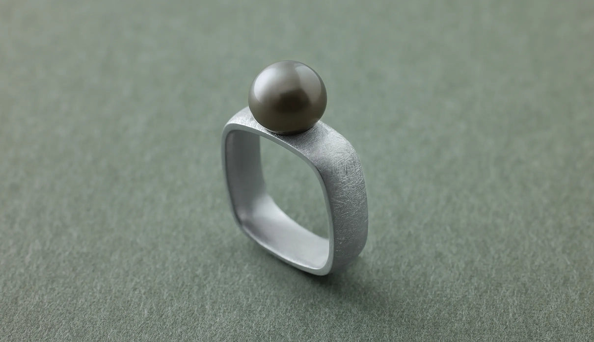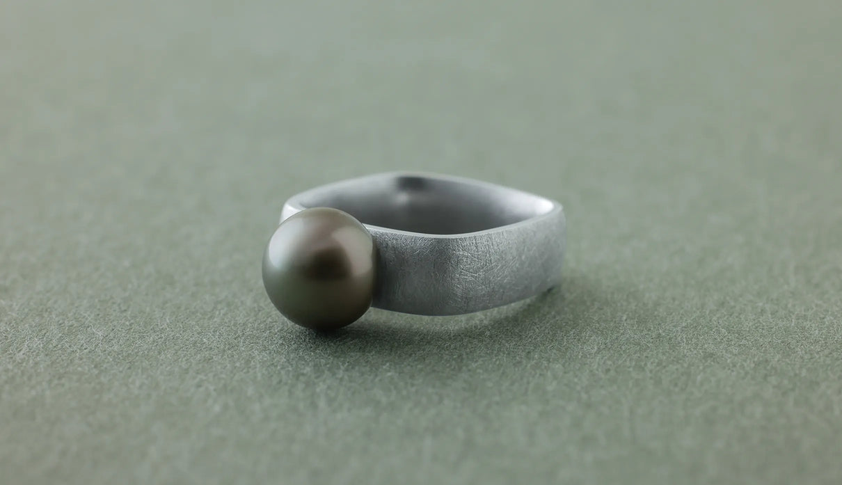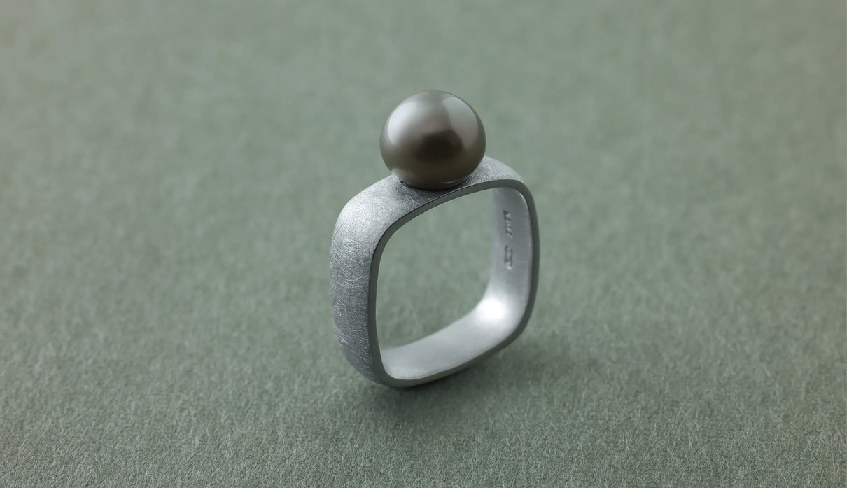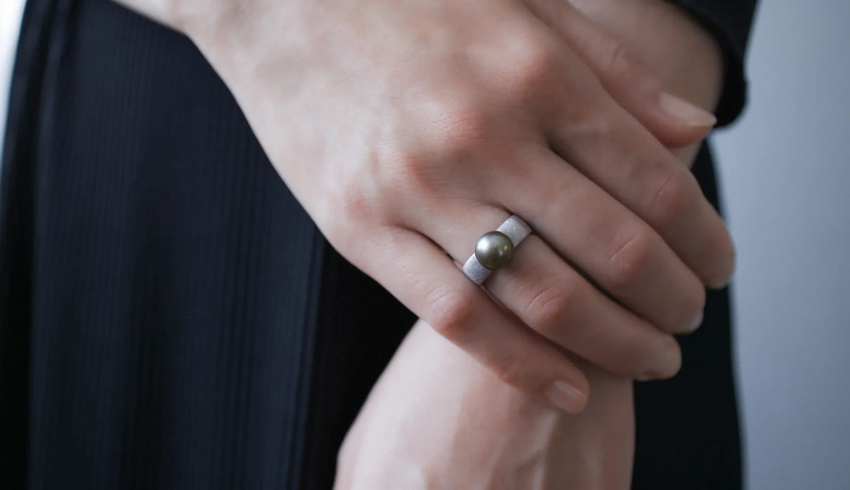 The "Syami" series is inspired by the shape of the body of a shamisen. The softly refined square form found in this traditional instrument was designed to naturally complement the slightly non-circular cross-section of a finger. The inner surface is gently rounded and polished to wrap the finger smoothly. Every slight difference in thickness and angle has been carefully considered to ensure comfort even when worn for long periods. The pale gray Tahitian pearl, with its subtly spread, soft roundness, creates a gentle expression. Harmonizing with the matte-textured silver ring, it adds a soft warmth to the composed elegance. This one-of-a-kind ring quietly accompanies everyday attire, bringing a gentle, calming presence.