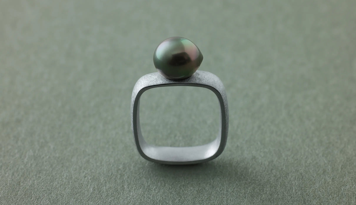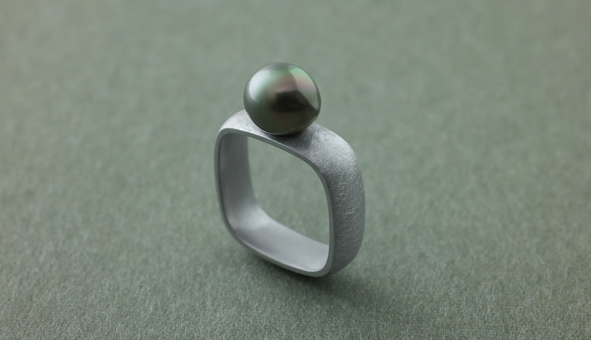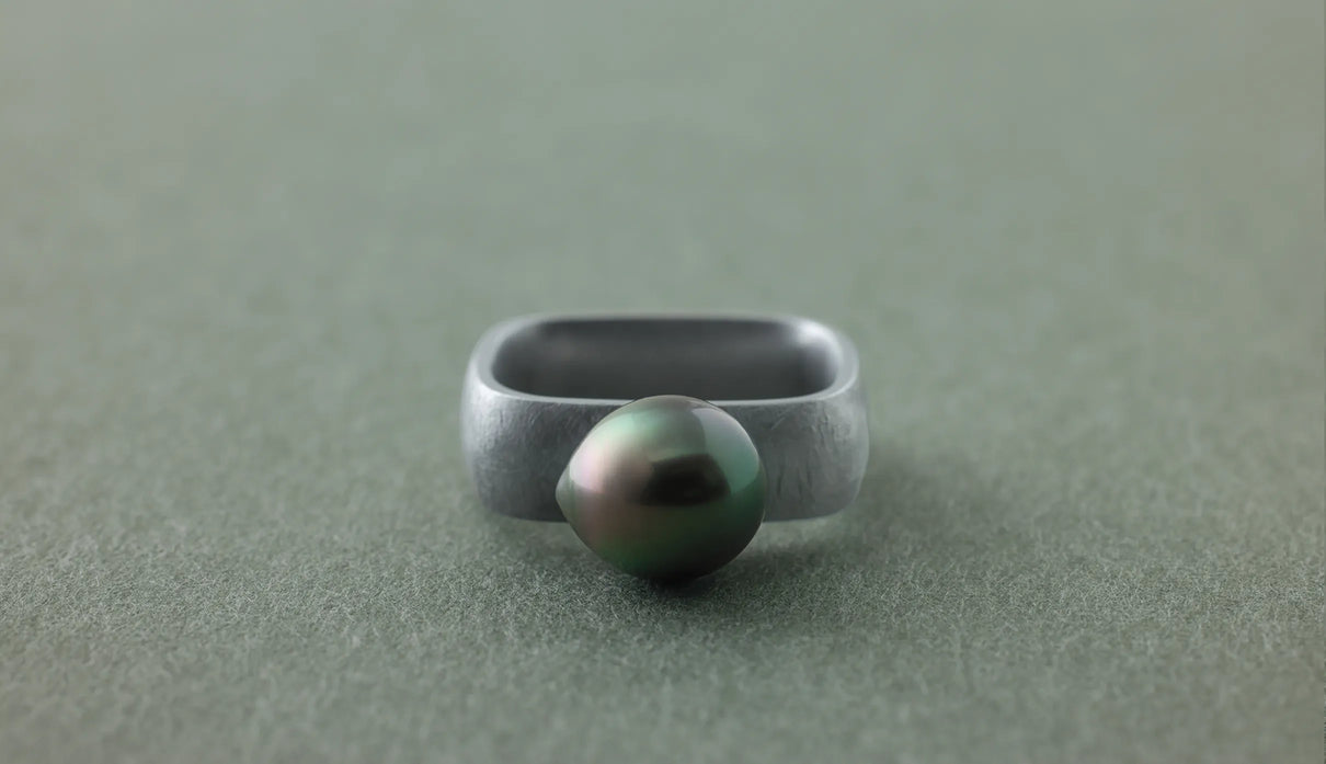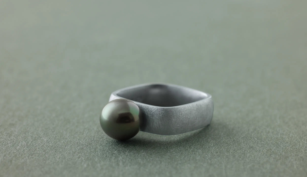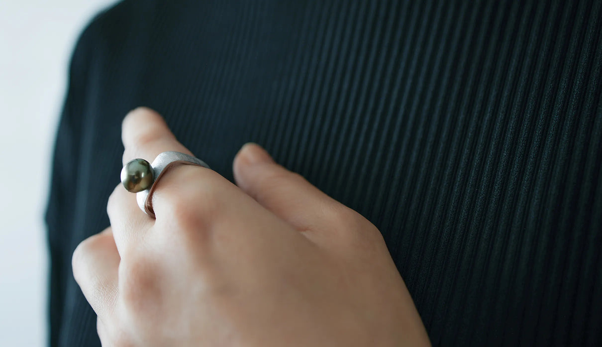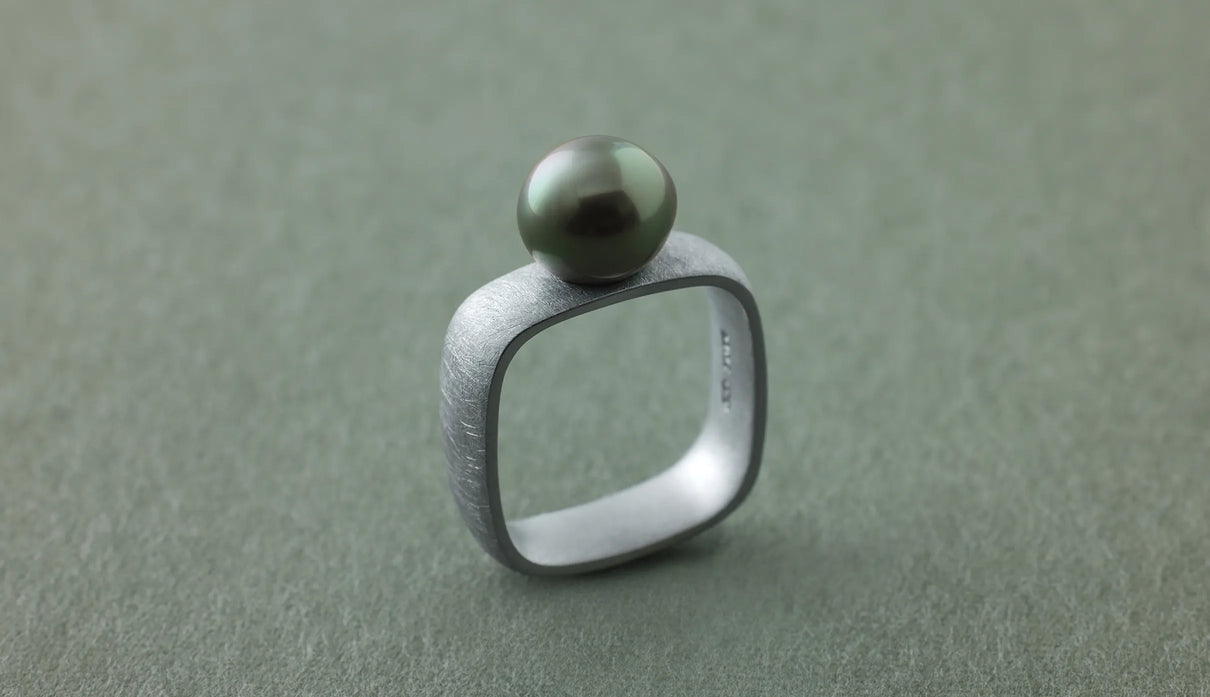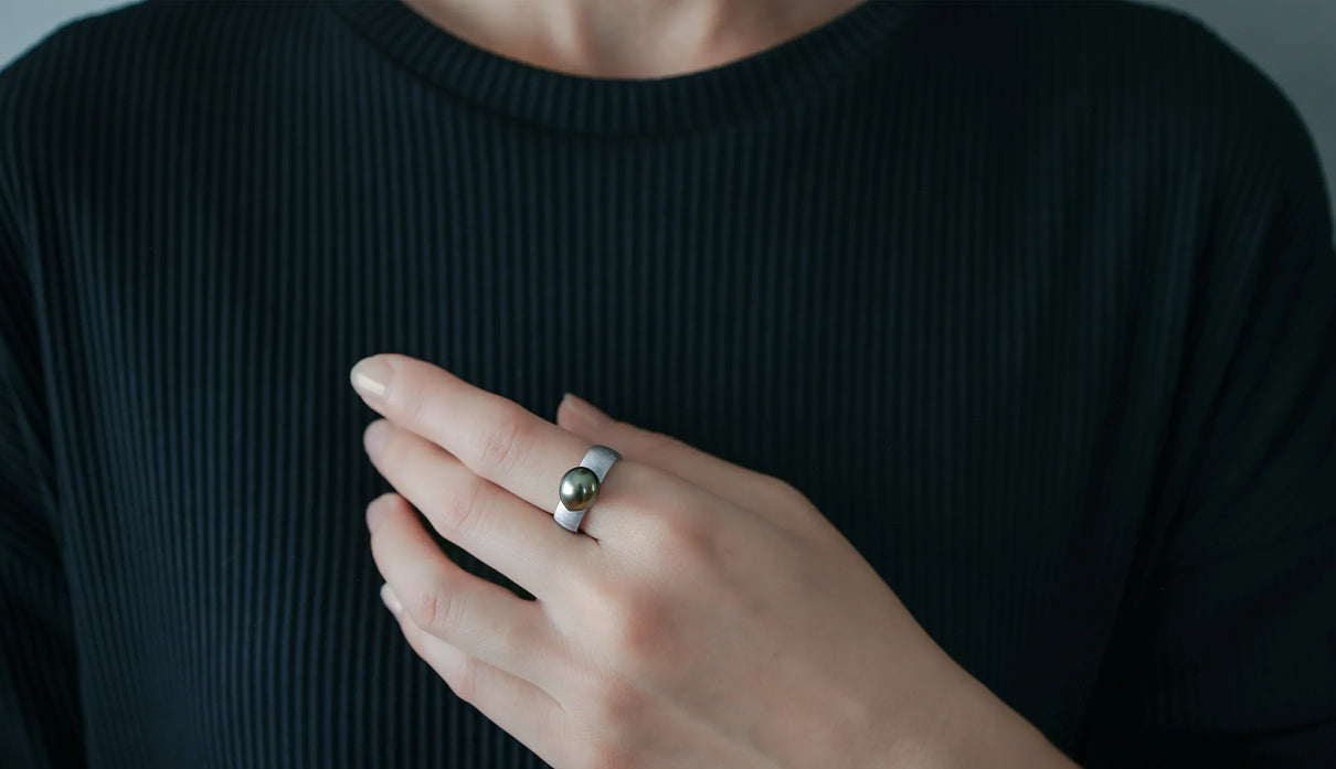 The "Syami" series is inspired by the shape of the body of a shamisen. The softly refined square form of this traditional instrument was designed to naturally complement the slightly non-circular cross-section of a finger. The inner surface is gently rounded and polished to wrap the finger smoothly. Every subtle difference in thickness and angle has been carefully considered to ensure lasting comfort, even when worn for long periods. The Tahitian pearl, with a green-gray base, subtly reveals hints of peacock green depending on the angle of the light, exuding a deep and sophisticated impression. Its uniquely contoured form, with slight undulations along the outline, quietly emphasizes individuality. Paired with the matte-textured silver ring, it conveys a calm yet refined presence. This one-of-a-kind ring naturally blends with everyday attire while adding a touch of understated elegance.
