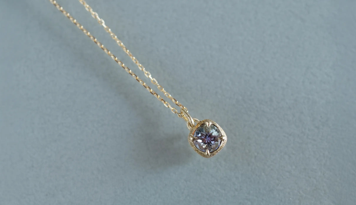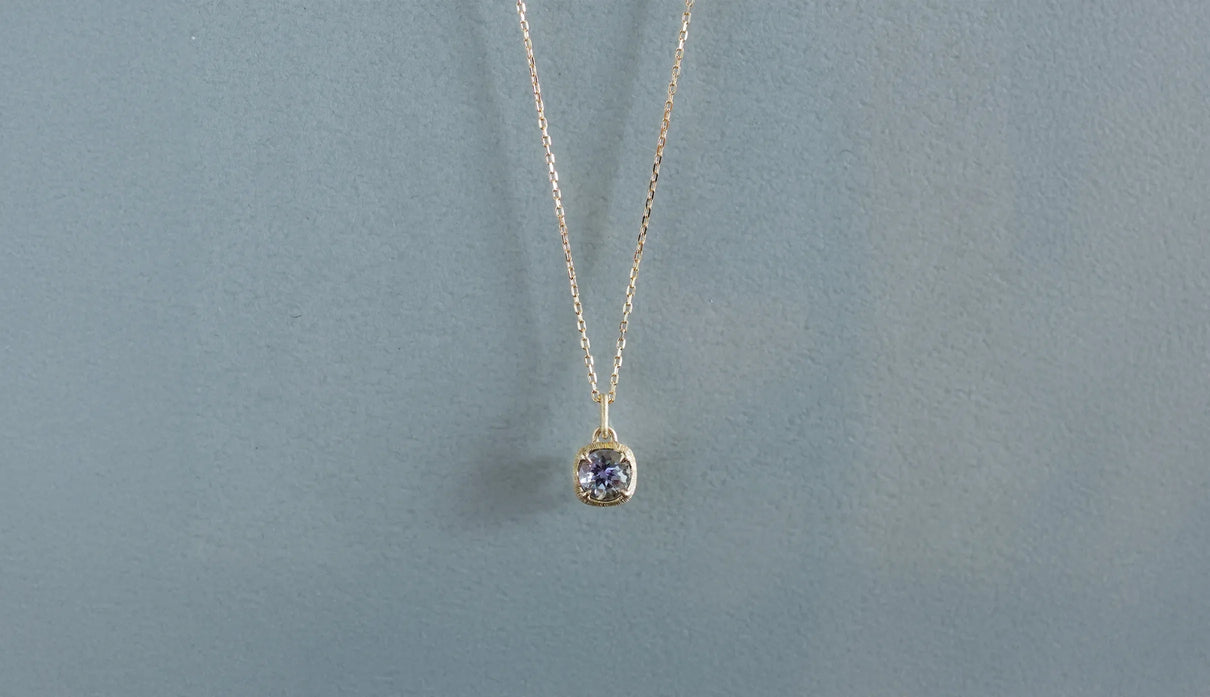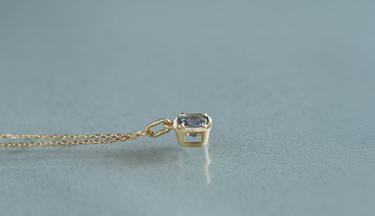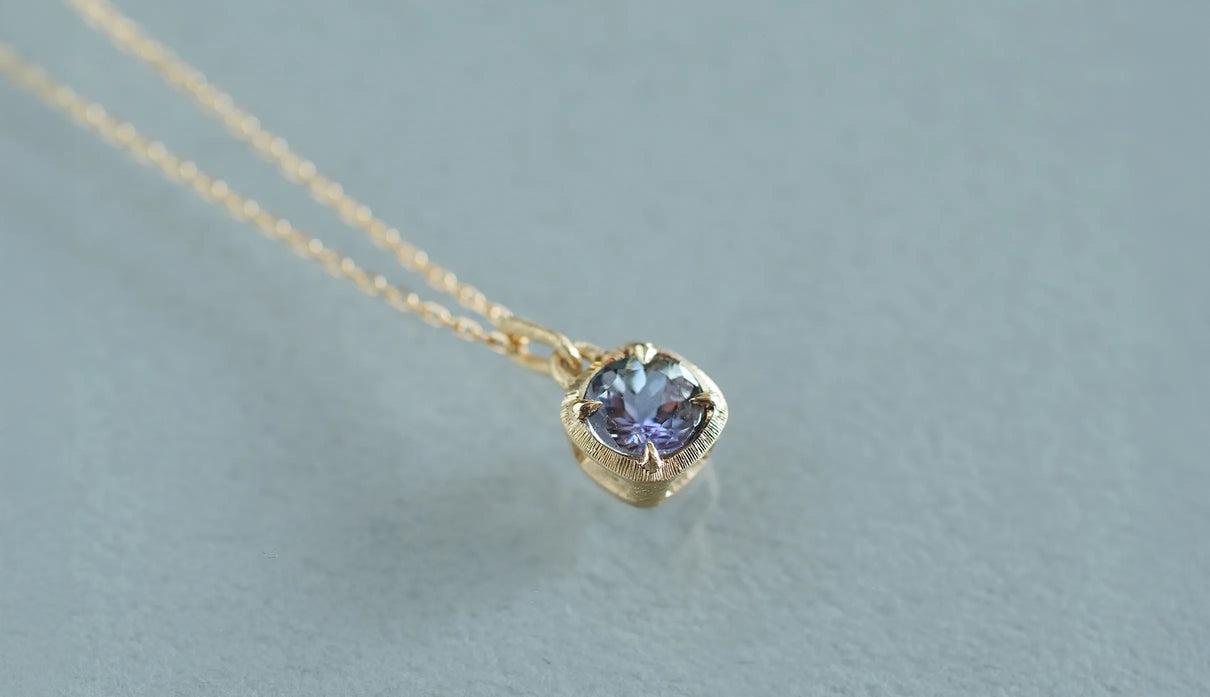 A one-of-a-kind necklace from the "Plump" series, inspired by the image of a single, full bud gently enveloping and protecting a gemstone, set here with a mermaid tanzanite. Rare pieces in which light purple, blue, and green overlap are called "mermaid tanzanite." Unlike typical tanzanite, known for its deep blue, this stone quietly unfolds a delicate, clear, multicolored shimmer that cannot be defined as any single hue. Like light reaching the depths of the sea, the three colors gently respond to each other, shifting in expression; their transience evokes a subtle sense of openness within the heart. The matte K18 yellow gold setting, refined with delicate line engraving, gently follows the contours of the well-proportioned round-cut stone. Crafted as a necklace that conveys both understated radiance and meticulous craftsmanship. Tanzanite, also known as the birthstone of December, makes this piece a thoughtful talisman for those born in December.