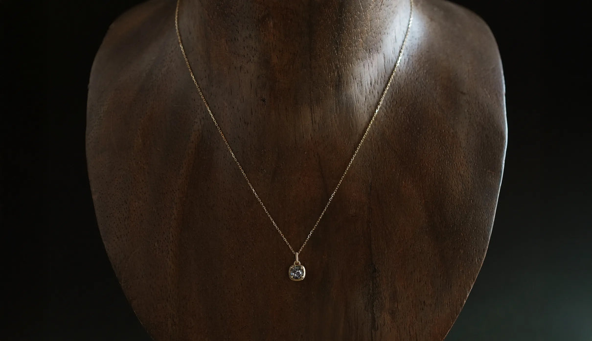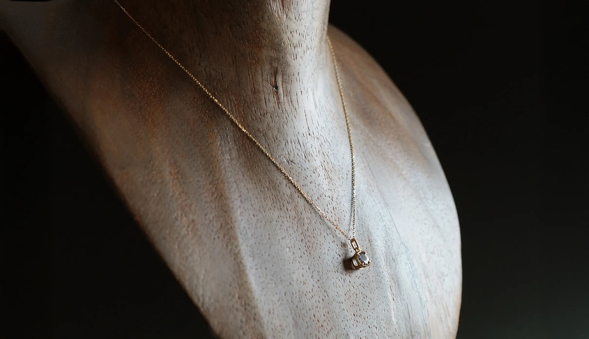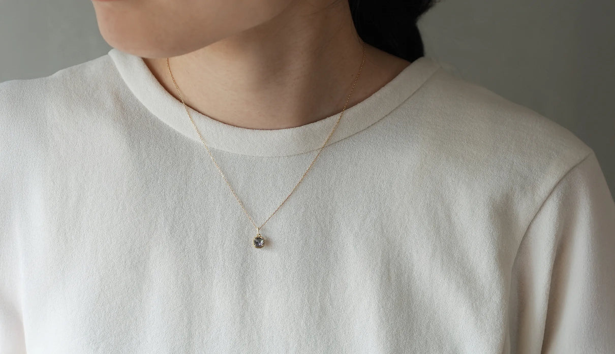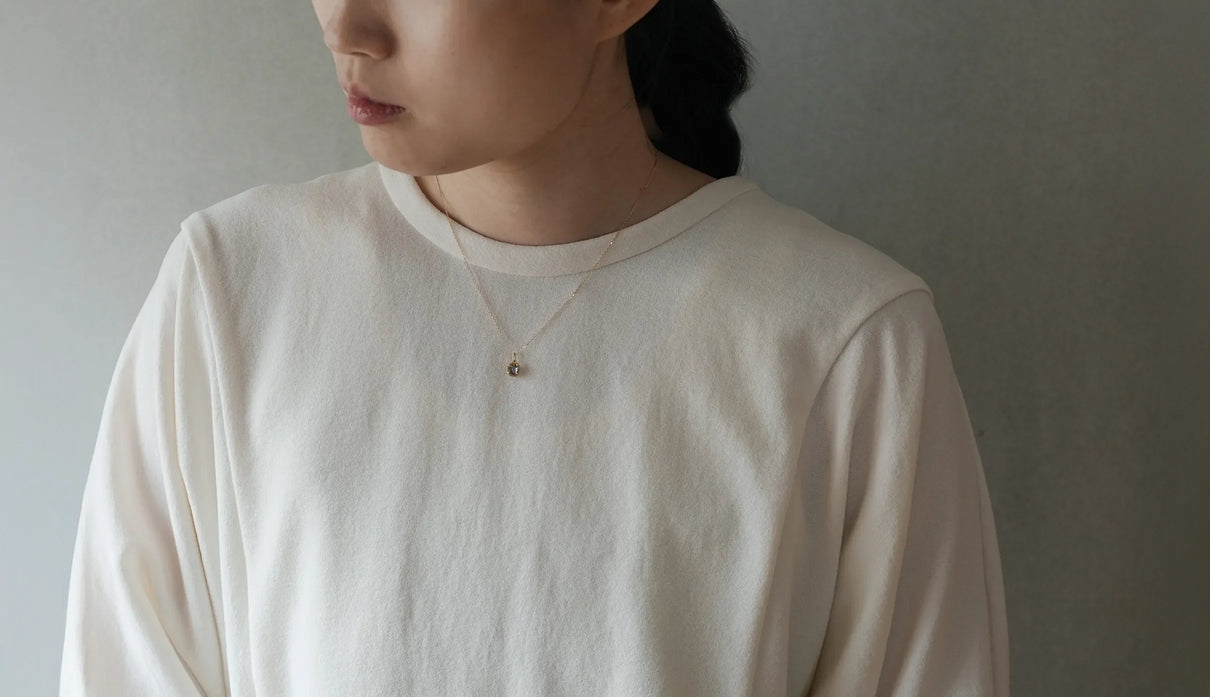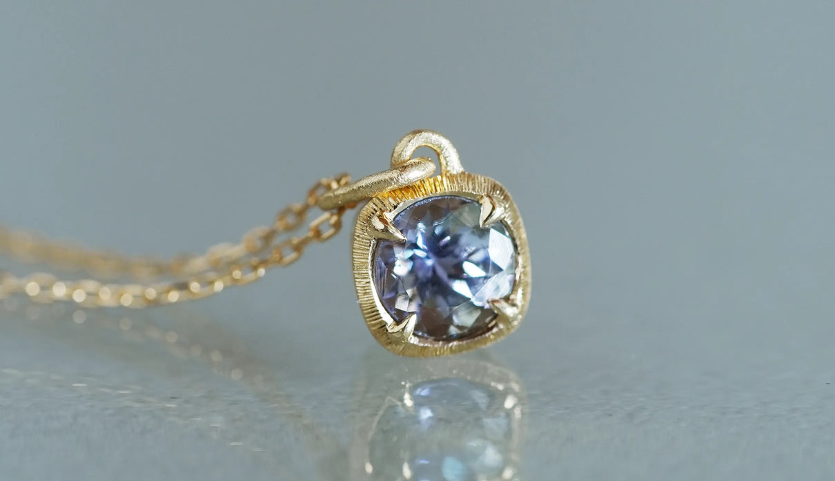 A one-of-a-kind necklace from the "Plump" series, inspired by the image of a single, full bud gently enveloping and protecting a gemstone, set here with a mermaid tanzanite. Rare pieces in which light purple, blue, and green overlap are called "mermaid tanzanite." Unlike typical tanzanite, known for its deep blue, this stone quietly unfolds a delicate, clear, multicolored shimmer that cannot be defined as any single hue. Like light reaching the depths of the sea, the three colors gently respond to each other, shifting in expression; their transience evokes a subtle sense of openness within the heart. The matte K18 yellow gold setting, refined with delicate line engraving, gently follows the contours of the well-proportioned round-cut stone. Crafted as a necklace that conveys both understated radiance and meticulous craftsmanship. Tanzanite, also known as the birthstone of December, makes this piece a thoughtful talisman for those born in December.